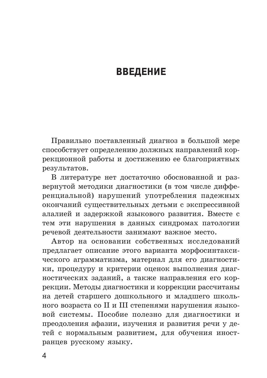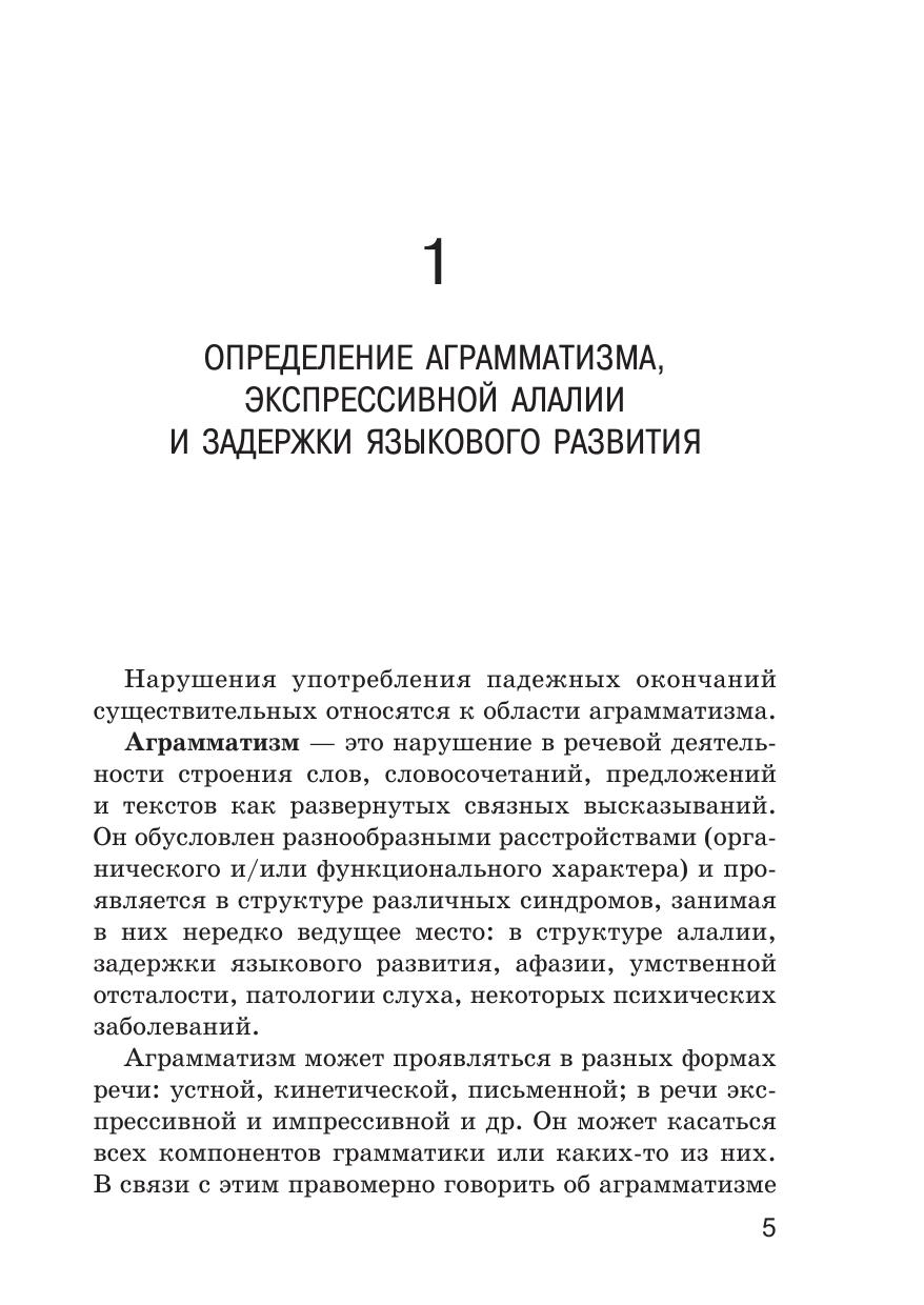 Пособие посвящено описанию, диагностике и коррекции одной из наиболее распространенных форм аграмматизма у детей с экспрессивной алалией и задержкой языкового развития. Пособие можно использовать при диагностике и преодолении афазии у детей и взрослых, при исследовании и развитии речи у нормально развивающихся детей, при обучении иностранцев русскому языку. В пособии содержится большой, специально подобранный иллюстративный материал (более 60 картинок).