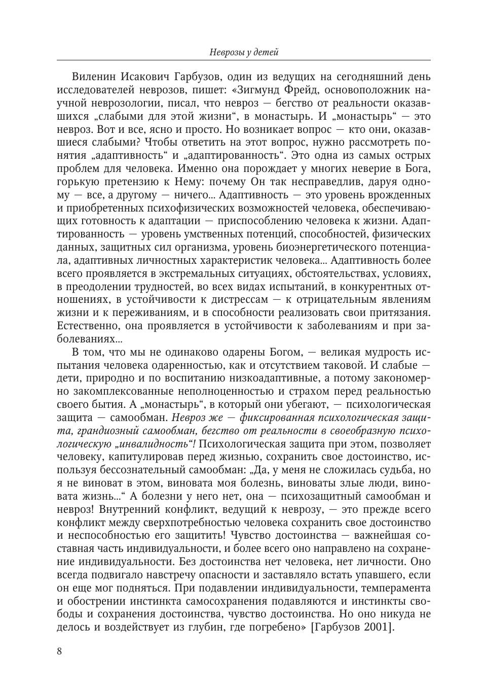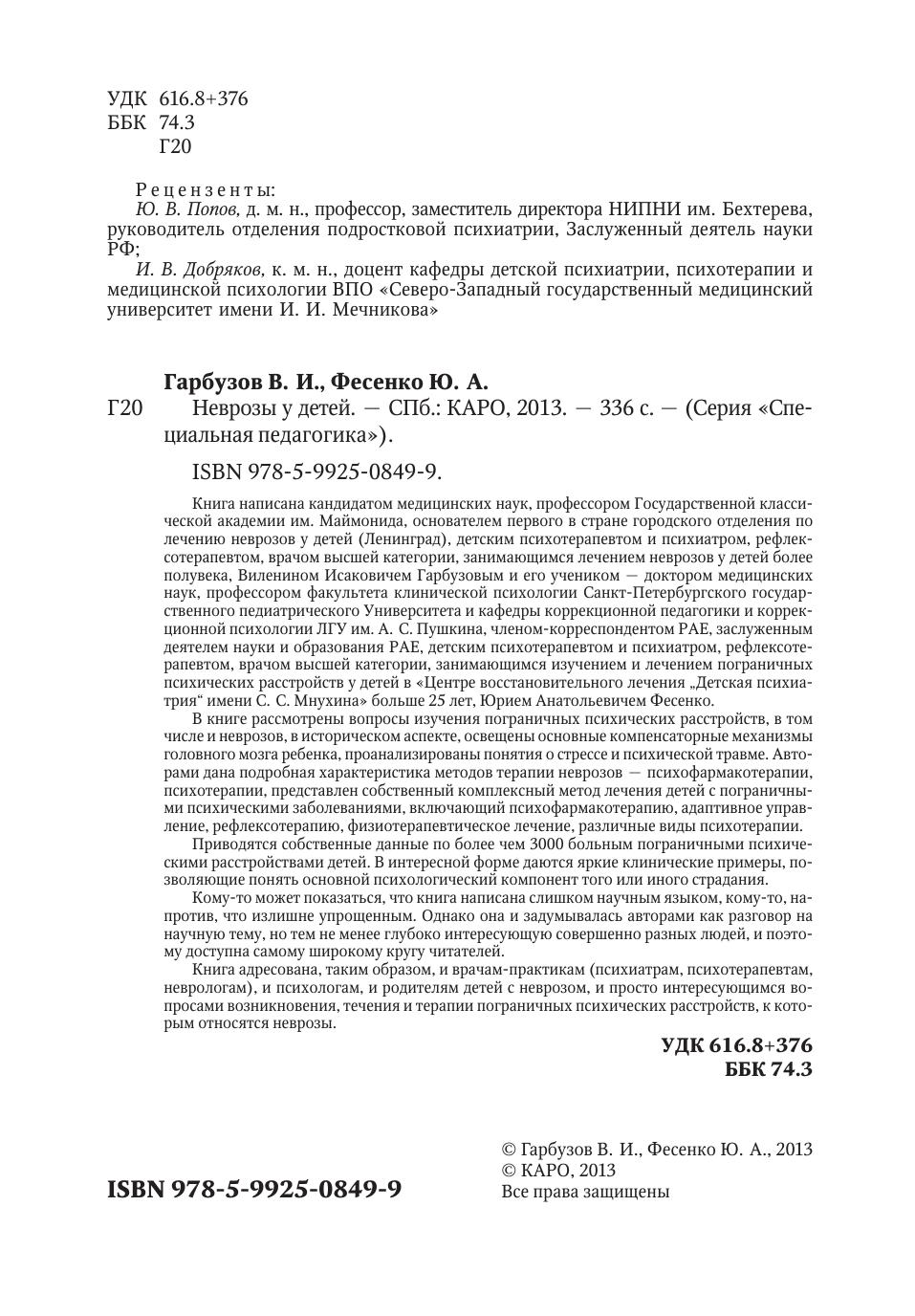 Книга написана кандидатом медицинских наук, профессором Государственной классической академии им. Маймонида, основателем первого в стране городского отделения по лечению неврозов у детей (Ленинград), детским психотерапевтом и психиатром, рефлексотерапевтом, врачом высшей категории, занимающимся лечением неврозов у детей более полувека, Виленином Исаковичем Гарбузовым и его учеником — доктором медицинских наук, профессором факультета клинической психологии Санкт-Петербургского государственного педиатрического Университета и кафедры коррекционной педагогики и коррекционной психологии ЛГУ им. А. С. Пушкина, членом-корреспондентом РАЕ, заслуженным деятелем науки и образования РАЕ, детским психотерапевтом и психиатром, рефлексотерапевтом, врачом высшей категории, занимающимся изучением и лечением пограничных психических расстройств у детей в ?Центре восстановительного лечения „Детская психиатрия“ имени С. С. Мнухина? больше 25 лет, Юрием Анатольевичем Фесенко. В книге рассмотрены вопросы изучения пограничных психических расстройств, в том числе и неврозов, в историческом аспекте, освещены основные компенсаторные ме ханизмы головного мозга ребенка, проанализированы понятия о стрессе и психической травме. Авторами дана подробная характеристика методов терапии неврозов — психофармакотерапии, психотерапии, представлен собственный комплексный метод лечения детей с пограничными психическими заболеваниями, включающий психофармакотера пию, адаптивное управление, рефлексотерапию, физиотерапевтическое лечение, различные виды психотерапии. Приводятся собственные данные по более чем 3000 больным пограничными психическими расстройствами детей. В интересной форме даются яркие клинические примеры, позволяющие понять основной психологический компонент того или иного страдания. Кому-то может показаться, что книга написана слишком научным языком, кому-то, напротив, что излишне упрощенным. Однако она и задумывалась авторами как разговор на научную тему, но тем не менее глубоко интересующую совершенно разных людей, и поэтому доступна самому широкому кругу читателей. Книга адресована, таким образом, и врачам-практикам (психиатрам, психотерапевтам, неврологам), и психологам, и родителям детей с неврозом, и просто интересующимся вопросами возникновения, течения и терапии пограничных психических расстройств, к которым относятся неврозы.