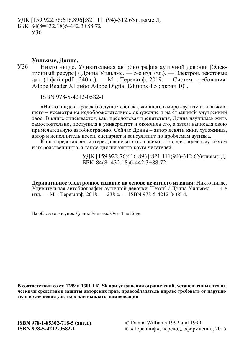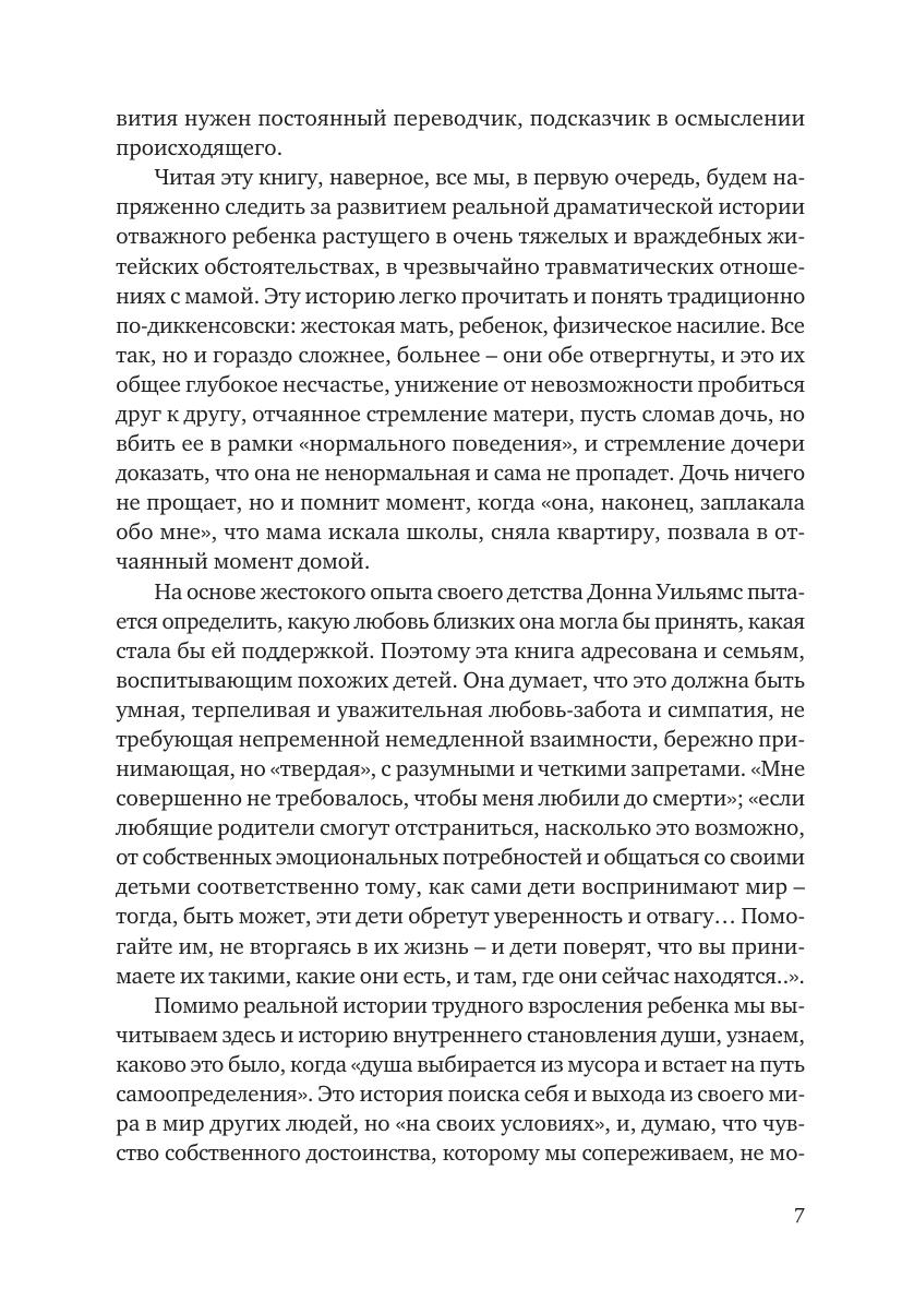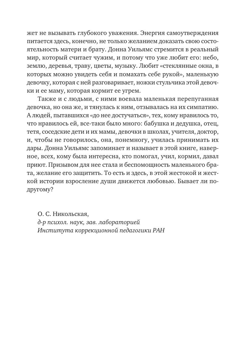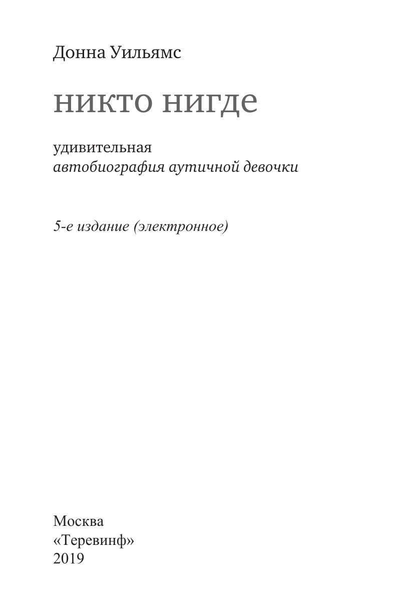 «Никто нигде» — рассказ о душе человека, жившего в мире «аутизма» и выжившего — несмотря на недоброжелательное окружение и на страшный внутренний хаос. В книге описывается, как, преодолевая препятствия, Донна научилась жить самостоятельно, поступила в университет и окончила его, а затем написала свою примечательную автобиографию. Сейчас Донна — автор девяти книг, художница, автор и исполнитель песен, сценарист и консультант по проблемам аутизма. Книга представляет интерес для педагогов и психологов, для людей с аутизмом и их родственников, а также для широкого круга читателей.