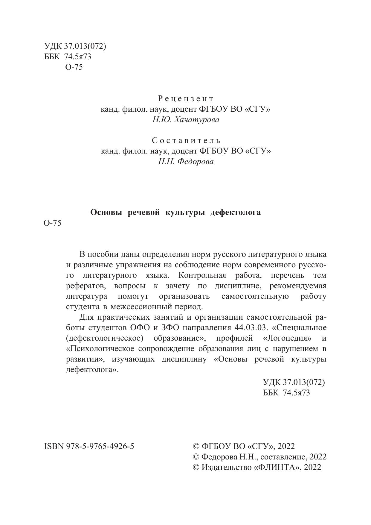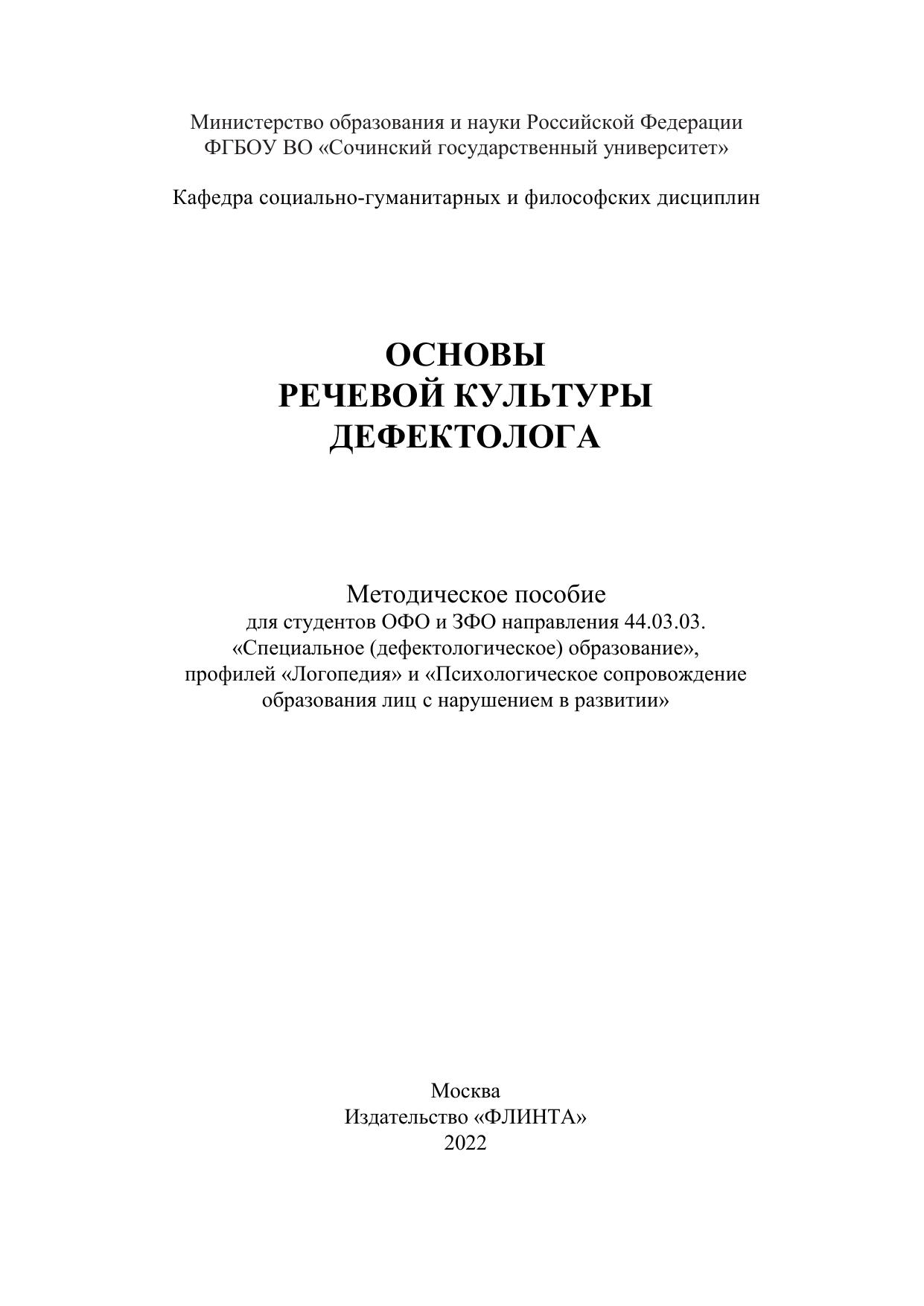 Для практических занятий и организации самостоятельной ра-боты студентов ОФО и ЗФО направления 44.03.03. «Специальное (дефектологическое) образование», профилей «Логопедия» и «Психологическое сопровождение образования лиц с нарушением в развитии», изучающих дисциплину «Основы речевой культуры дефектолога».