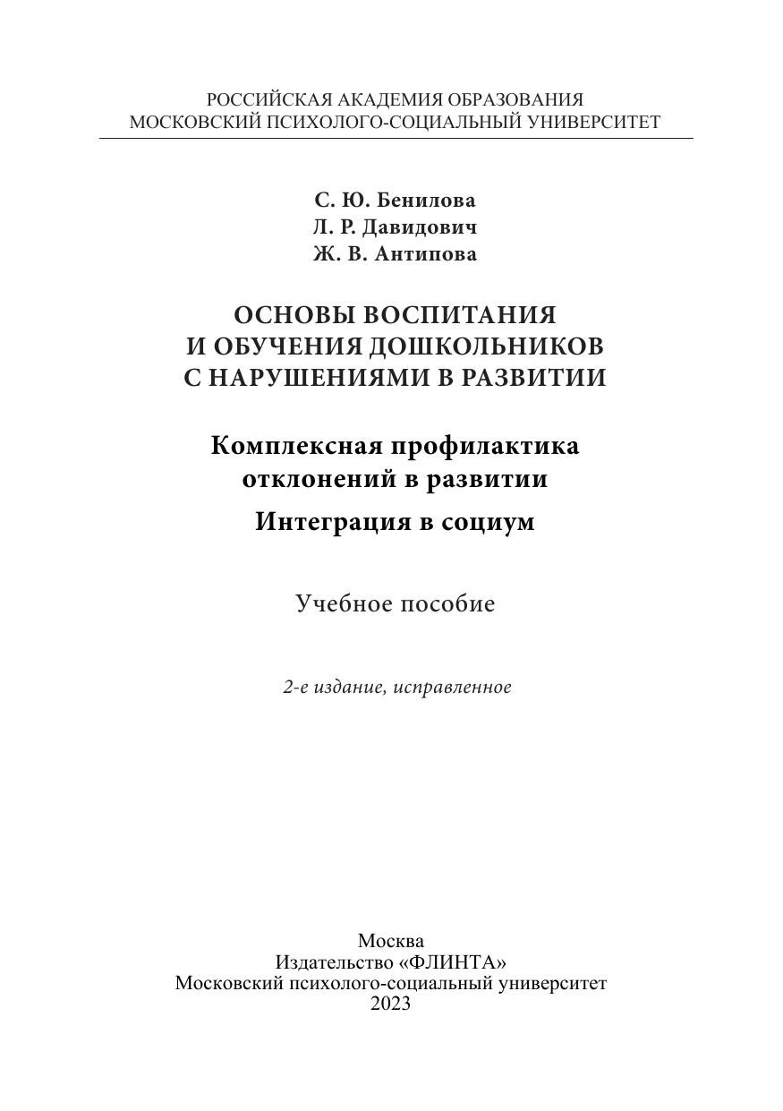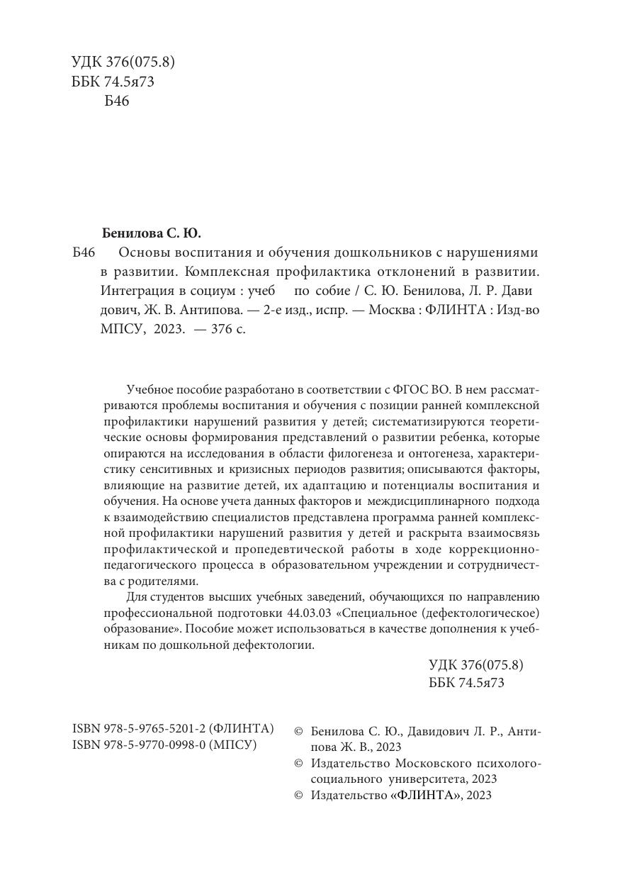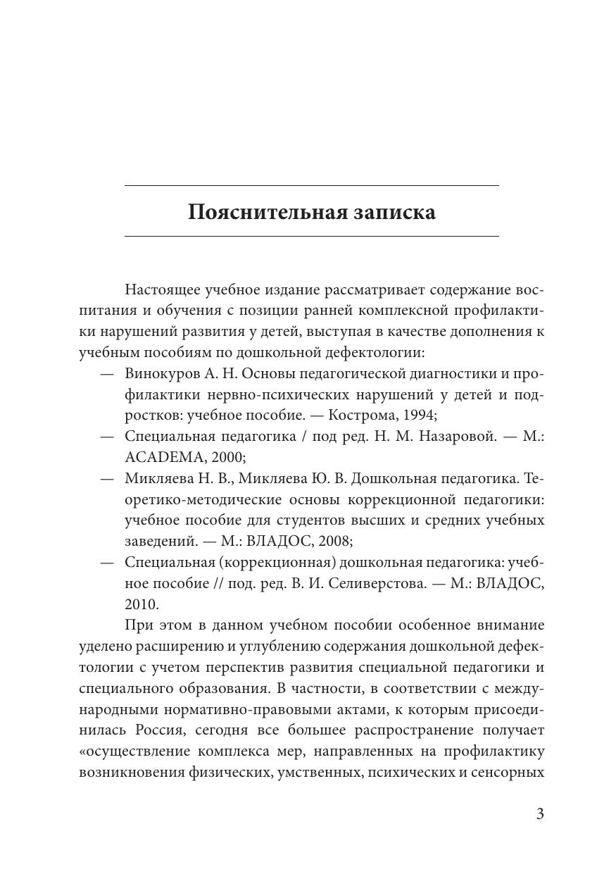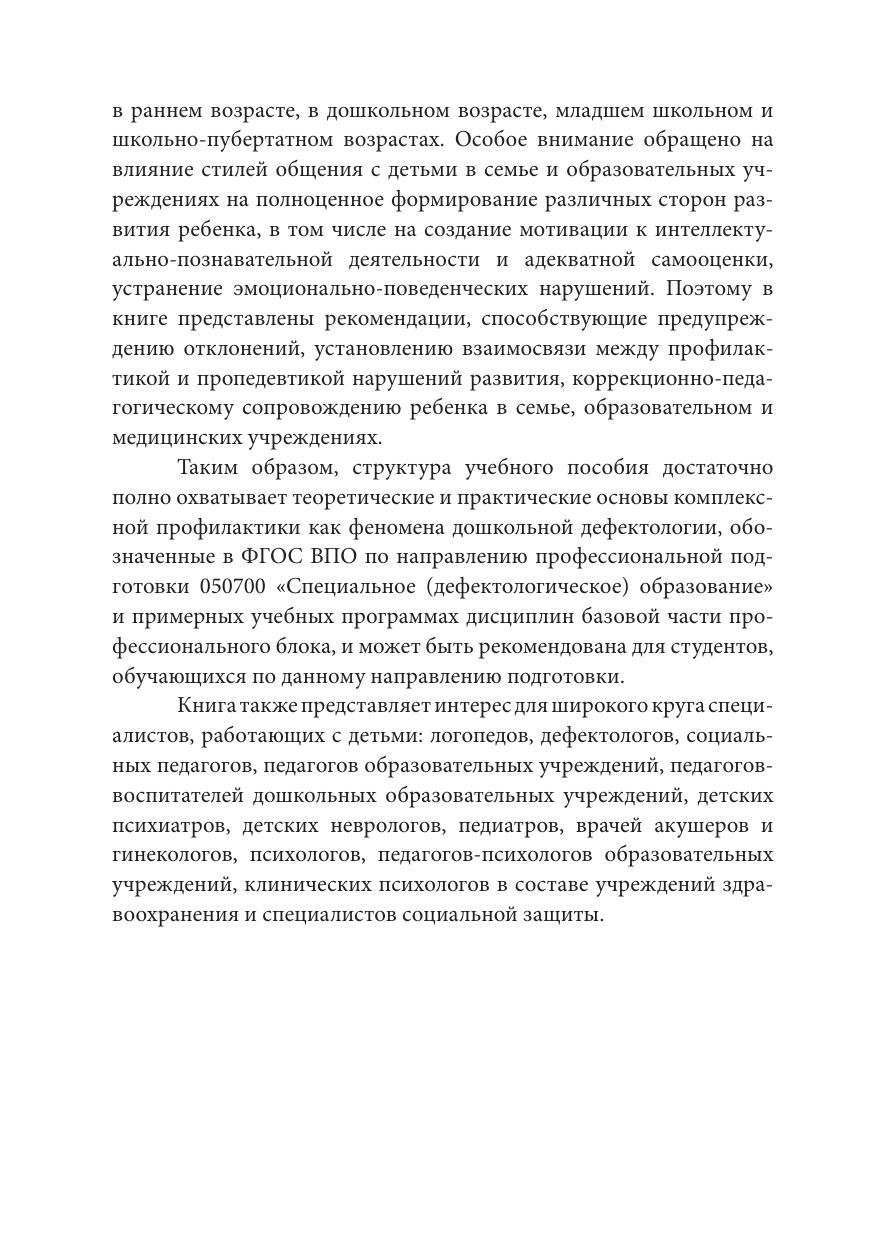 Учебное пособие разработано в соответствии с ФГОС ВО. В нем рассматриваются проблемы воспитания и обучения с позиции ранней комплексной профилактики нарушений развития у детей; систематизируются теоретические основы формирования представлений о развитии ребенка, которые опираются на исследования в области филогенеза и онтогенеза, характеристику сенситивных и кризисных периодов развития; описываются факторы, влияющие на развитие детей, их адаптацию и потенциалы воспитания и обучения. На основе учета данных факторов и междисциплинарного подхода к взаимодействию специалистов представлена программа ранней комплекс-ной профилактики нарушений развития у детей и раскрыта взаимосвязь профилактической и пропедевтической работы в ходе коррекционно-педагогического процесса в образовательном учреждении и сотрудничества с родителями.