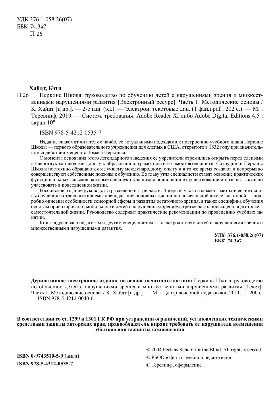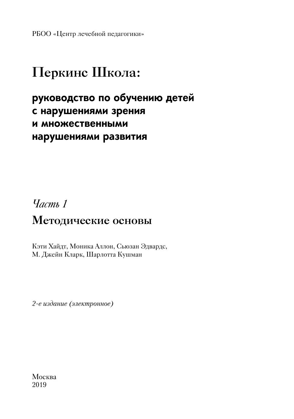 Российское издание руководства разделено на три части. В первой части изложены методические основы обучения и отдельные приемы преподавания основных дисциплин в начальной школе, во второй — подробно описаны особенности сенсорной сферы и развития остаточного зрения, а также специфика обучения основам ориентировки и мобильности детей с нарушенным зрением, третья часть посвящена подготовке к самостоятельной жизни. Руководство содержит практические рекомендации по проведению учебных занятий.