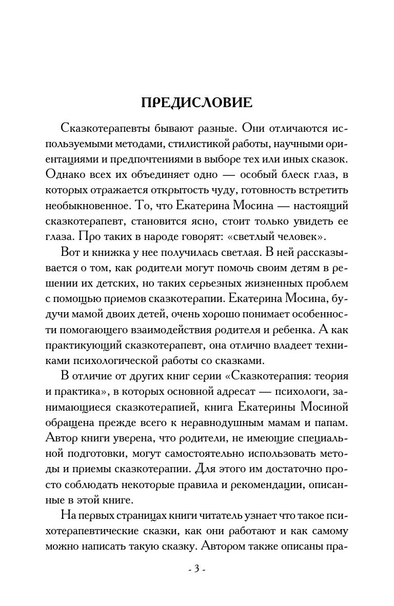 В книге рассмотрены детские психологические проблемы, возможные причины их появления, даны рекомендации для родителей. Но главное — в ней приведены психокоррекционные и медитативные сказки, способствующие решению проблем детей дошкольного возраста. Кроме того, автор описывает процесс создания собственных сказок под конкретные актуальные для ребенка проблемы.