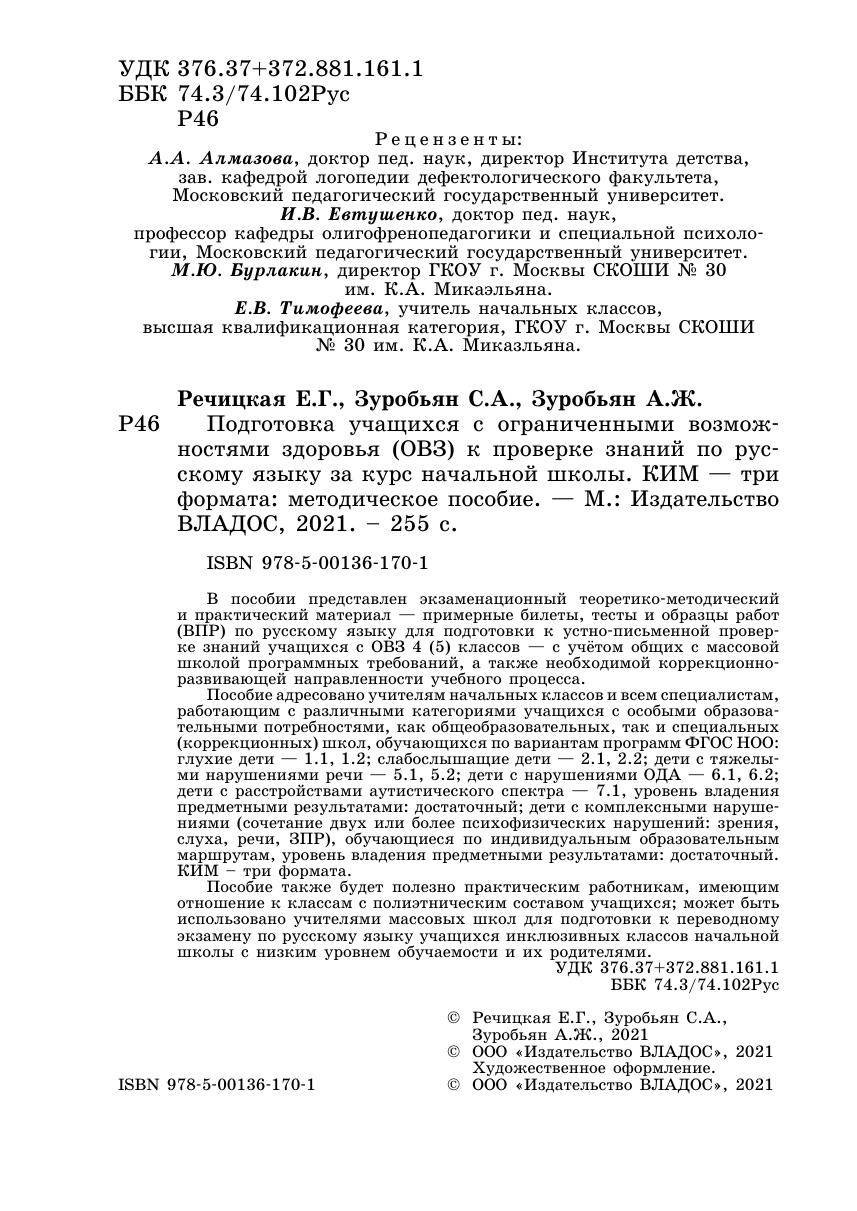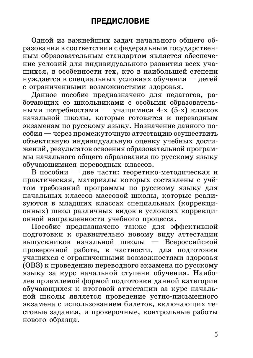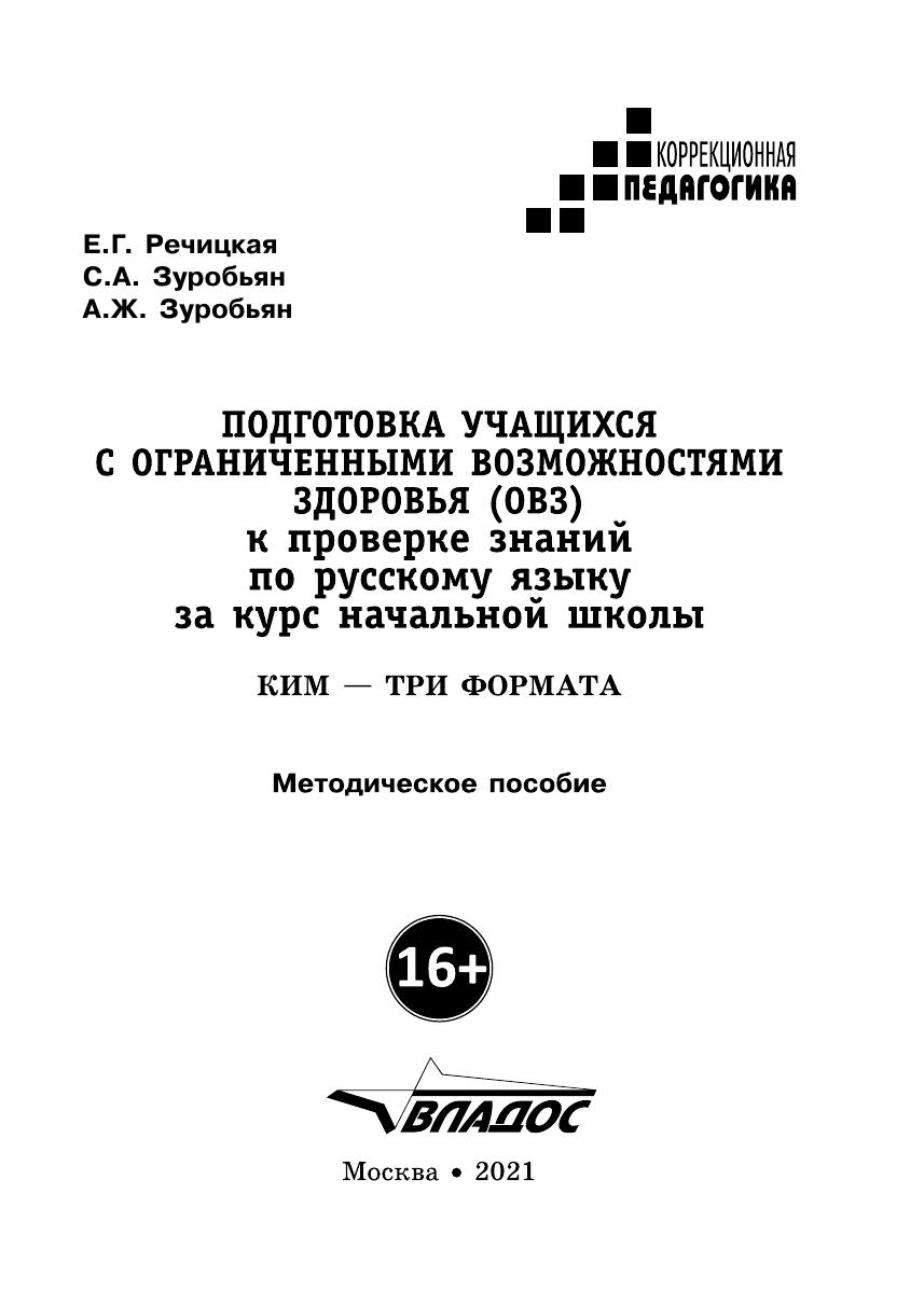 В пособии представлен экзаменационный теоретико-методический и практический материал — примерные билеты, тесты и образцы работ (ВПР) по русскому языку для подготовки к устно-письменной проверке знаний учащихся с ОВЗ 4 (5) классов — с учётом общих с массовой школой программных требований, а также необходимой коррекционно-развивающей направленности учебного процесса. Пособие адресовано учителям начальных классов и всем специалистам, работающим с различными категориями учащихся с особыми образовательными потребностями, как общеобразовательных, так и специальных (коррекционных) школ, обучающихся по вариантам программ ФГОС НОО: глухие дети — 1.1, 1.2; слабослышащие дети — 2.1, 2.2; дети с тяжелыми нарушениями речи — 5.1, 5.2; дети с нарушениями ОДА — 6.1, 6.2; дети с расстройствами аутистического спектра — 7.1, уровень владения предметными результатами: достаточный; дети с комплексными нарушениями (сочетание двух или более психофизических нарушений: зрения, слуха, речи, ЗПР), обучающиеся по индивидуальным образовательным маршрутам, уровень владения предметными результатами: достаточный. КИМ – три формата. Пособие также будет полезно практическим работникам, имеющим отношение к классам с полиэтническим составом учащихся; может быть использовано учителями массовых школ для подготовки к переводному экзамену по русскому языку учащихся инклюзивных классов начальной школы с низким уровнем обучаемости и их родителями.
