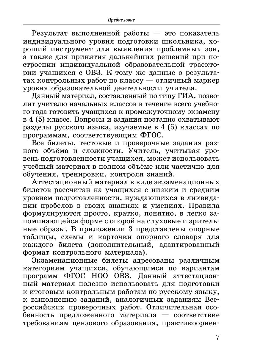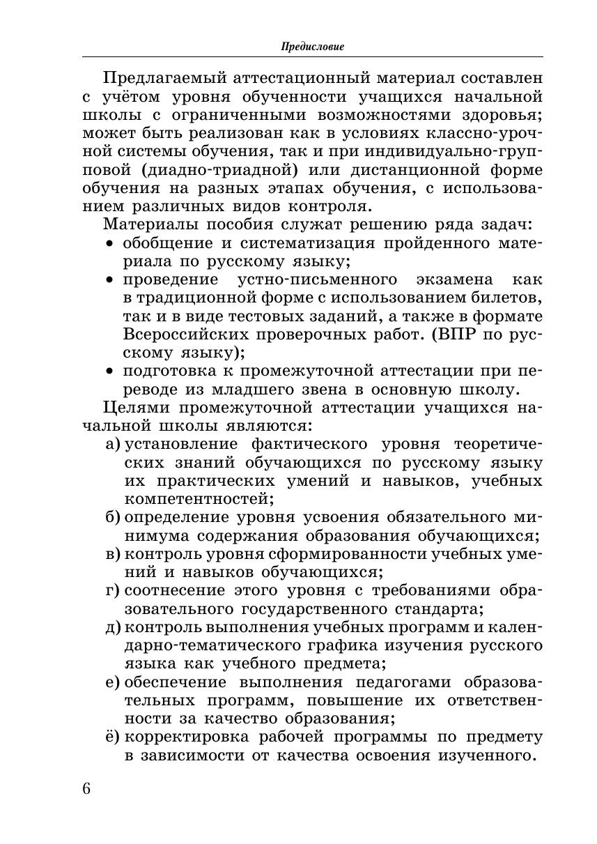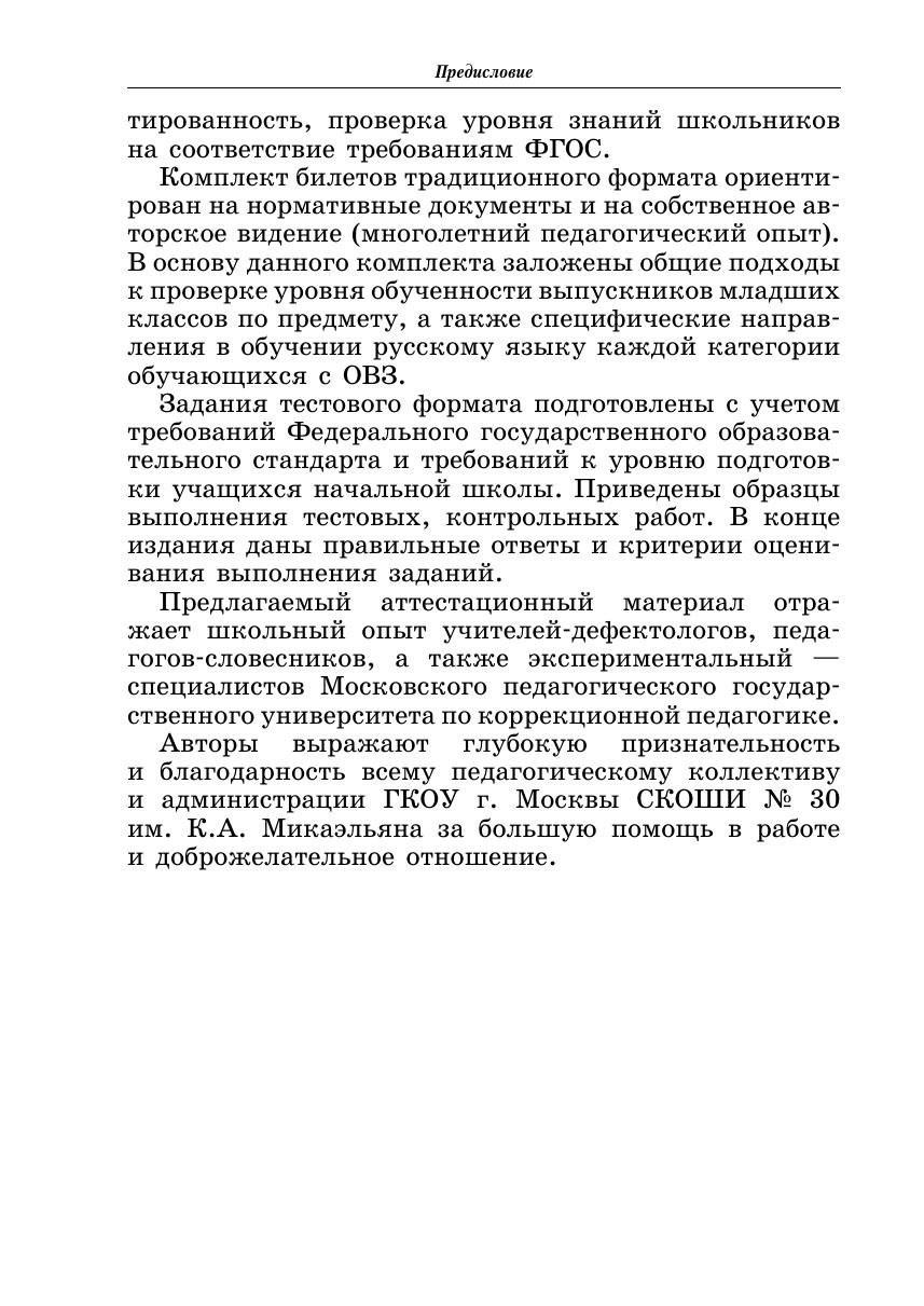 В пособии представлен экзаменационный теоретико-методический и практический материал — примерные билеты, тесты и образцы работ (ВПР) по русскому языку для подготовки к устно-письменной проверке знаний учащихся с ОВЗ 4 (5) классов — с учётом общих с массовой школой программных требований, а также необходимой коррекционно-развивающей направленности учебного процесса. Пособие адресовано учителям начальных классов и всем специалистам, работающим с различными категориями учащихся с особыми образовательными потребностями, как общеобразовательных, так и специальных (коррекционных) школ, обучающихся по вариантам программ ФГОС НОО: глухие дети — 1.1, 1.2; слабослышащие дети — 2.1, 2.2; дети с тяжелыми нарушениями речи — 5.1, 5.2; дети с нарушениями ОДА — 6.1, 6.2; дети с расстройствами аутистического спектра — 7.1, уровень владения предметными результатами: достаточный; дети с комплексными нарушениями (сочетание двух или более психофизических нарушений: зрения, слуха, речи, ЗПР), обучающиеся по индивидуальным образовательным маршрутам, уровень владения предметными результатами: достаточный. КИМ – три формата. Пособие также будет полезно практическим работникам, имеющим отношение к классам с полиэтническим составом учащихся; может быть использовано учителями массовых школ для подготовки к переводному экзамену по русскому языку учащихся инклюзивных классов начальной школы с низким уровнем обучаемости и их родителями.