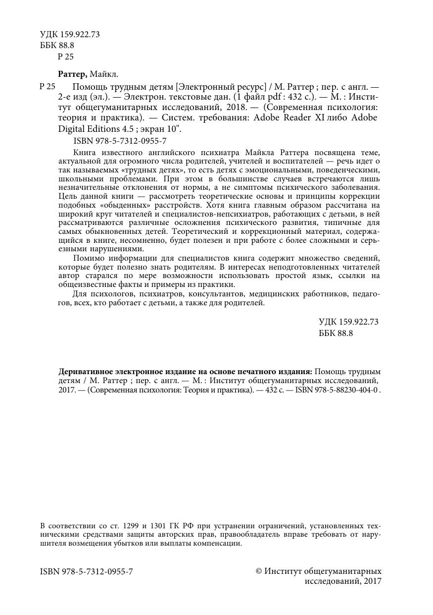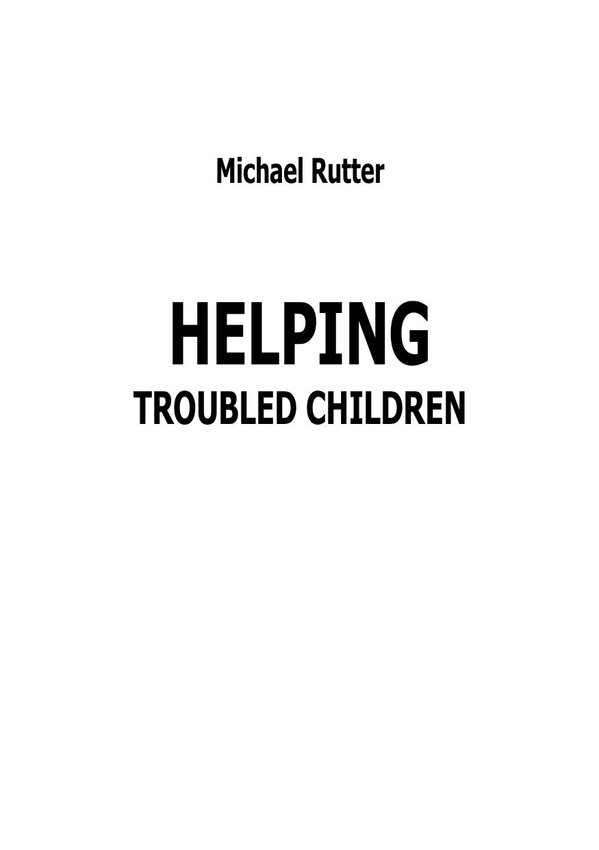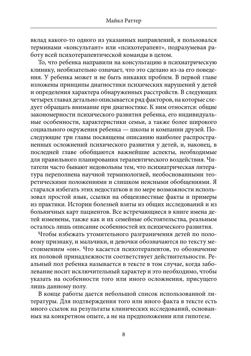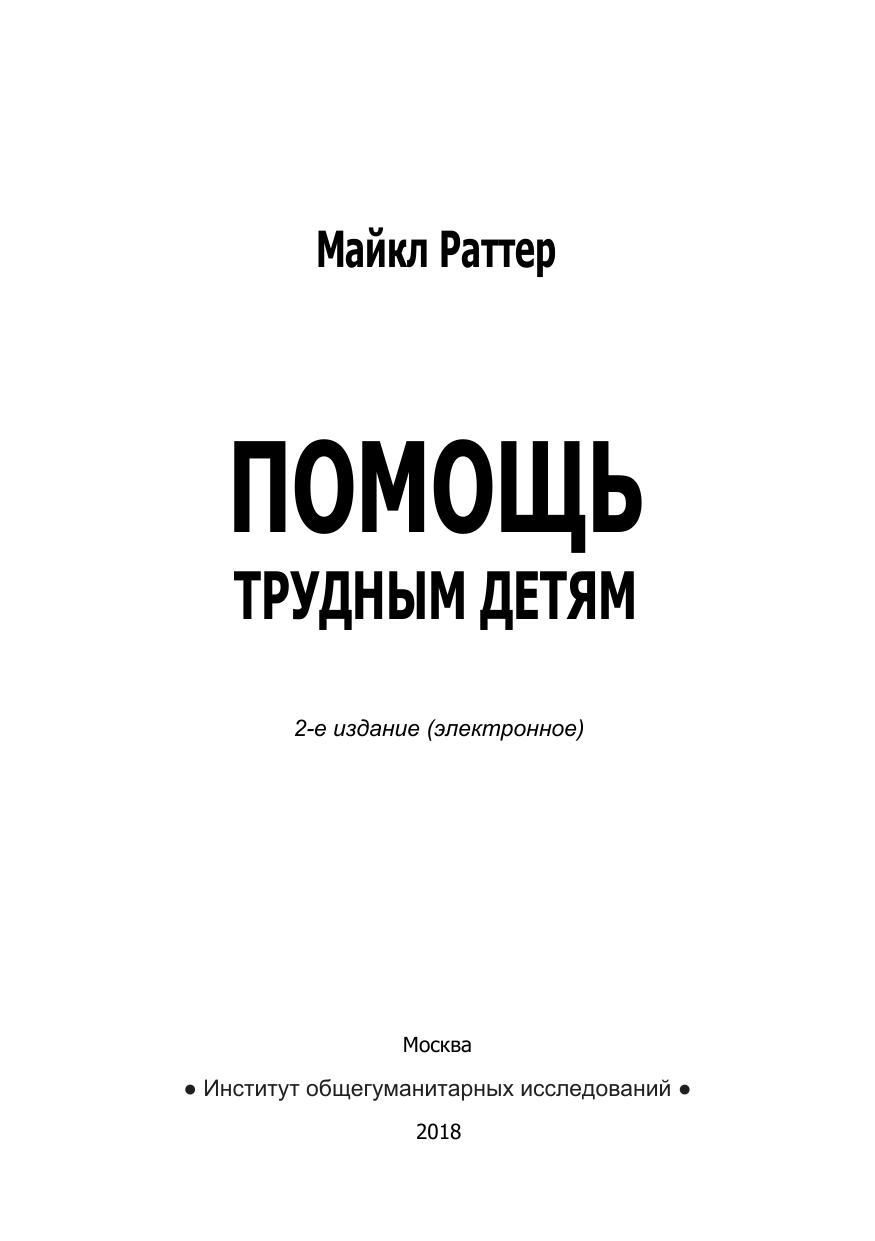 Книга известного английского психиатра Майкла Раттера посвящена теме, актуальной для огромного числа родителей, учителей и воспитателей — речь идет о так называемых «трудных детях», то есть детях с эмоциональными, поведенческими, школьными проблемами. При этом в большинстве случаев встречаются лишь незначительные отклонения от нормы, а не симптомы психического заболевания. Цель данной книги — рассмотреть теоретические основы и принципы коррекции подобных «обыденных» расстройств. Хотя книга главным образом рассчитана на широкий круг читателей и специалистов-непсихиатров, работающих с детьми, в ней рассматриваются различные осложнения психического развития, типичные для самых обыкновенных детей. Теоретический и коррекционный материал, содержащийся в книге, несомненно, будет полезен и при работе с более сложными и серьезными нарушениями.