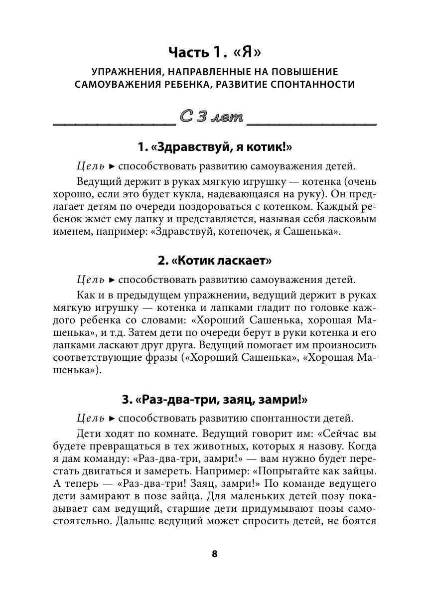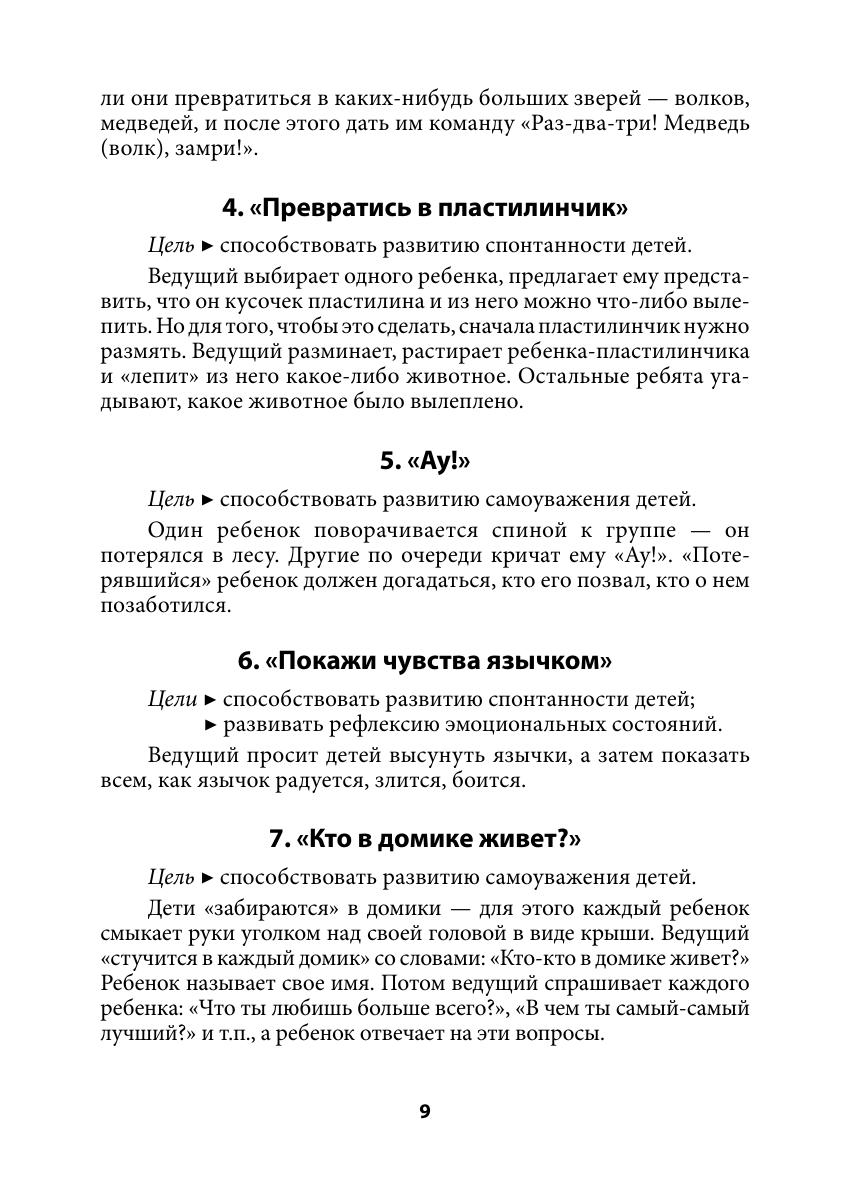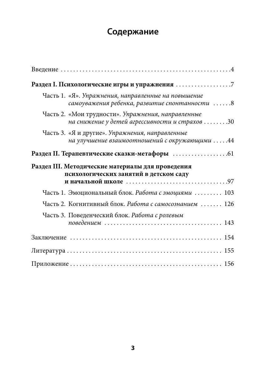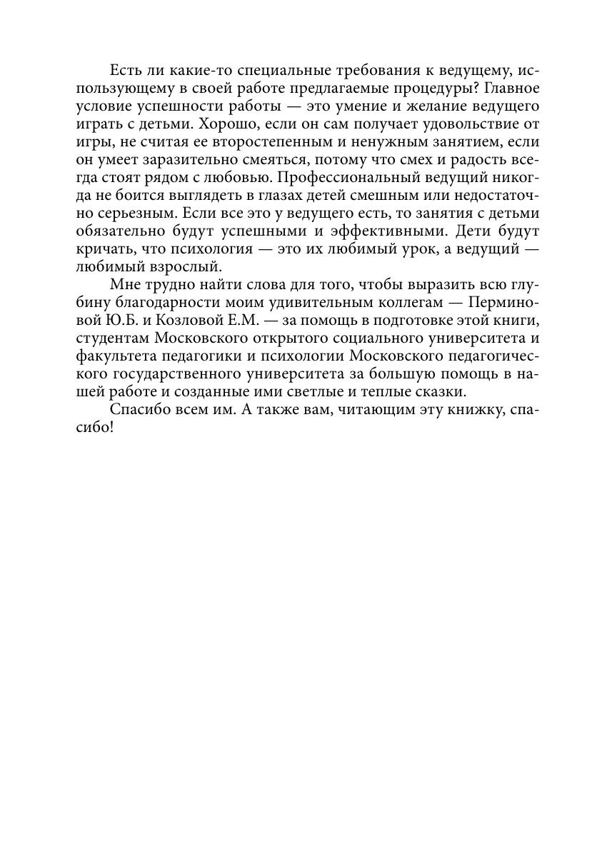 В книгу включена также программа психологической работы с детьми 5—9 лет, то есть воспитанниками старших и подготовительных групп детских садов и учениками 1—2 классов школы. Это — тренинговая программа, которая может быть использована как в коррекционных, так и в психопрофилактических целях. Она включает в себя работу с эмоциями, самосознанием и ролевым поведением детей.