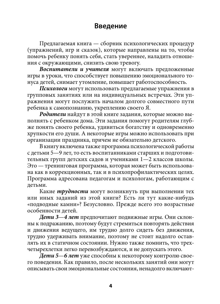 Предлагаемая книга — сборник психологических процедур (упражнений, игр и сказок), которые направлены на то, чтобы помочь детям 3—9 лет понять себя, стать увереннее, наладить отношения с окружающими, снизить свою тревогу. Описанные процедуры могут использоваться в групповых занятиях с детьми или на индивидуальных встречах.