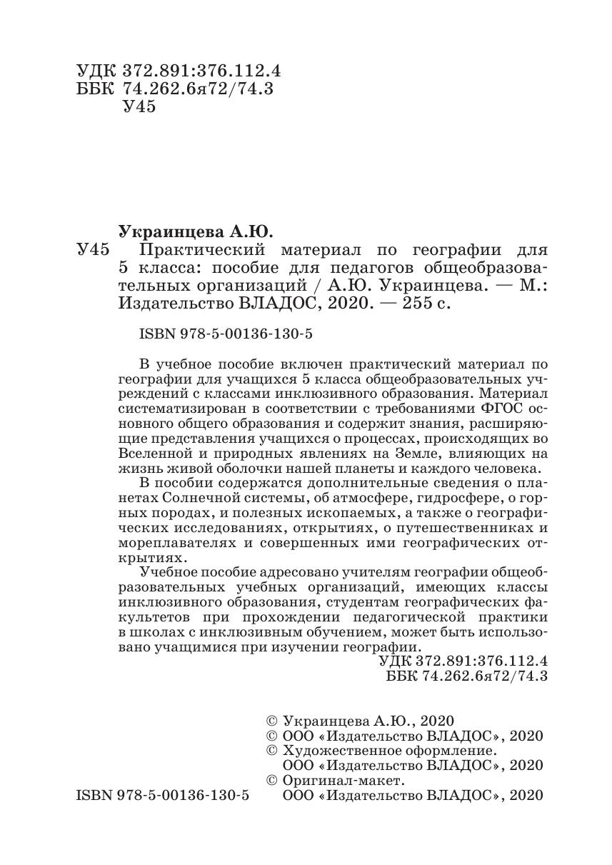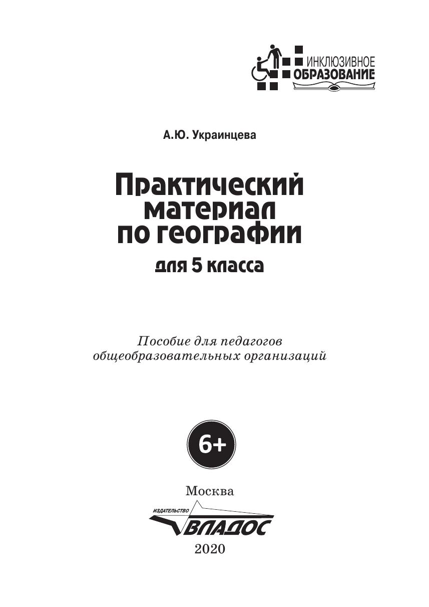 В учебное пособие включен практический материал по географии для учащихся 5 класса общеобразовательных учреждений с классами инклюзивного образования. Материал систематизирован в соответствии с требованиями ФГОС основного общего образования и содержит знания, расширяющие представления учащихся о процессах, происходящих во Вселенной и природных явлениях на Земле, влияющих на жизнь живой оболочки нашей планеты и каждого человека. В пособии содержатся дополнительные сведения о планетах Солнечной системы, об атмосфере, гидросфере, о горных породах, и полезных ископаемых, а также о географических исследованиях, открытиях, о путешественниках и мореплавателях и совершенных ими географических открытиях. Учебное пособие адресовано учителям географии общеобразовательных учебных организаций, имеющих классы инклюзивного образования, студентам географических факультетов при прохождении педагогической практики в школах с инклюзивным обучением, может быть использовано учащимися при изучении географии.