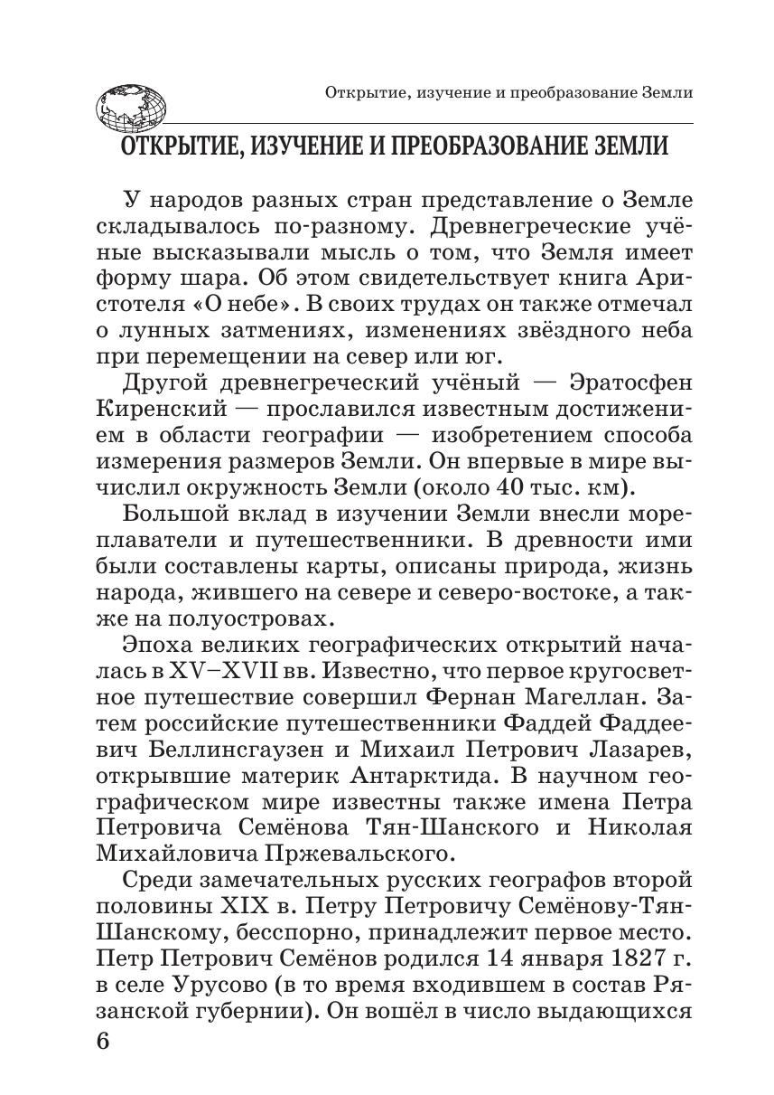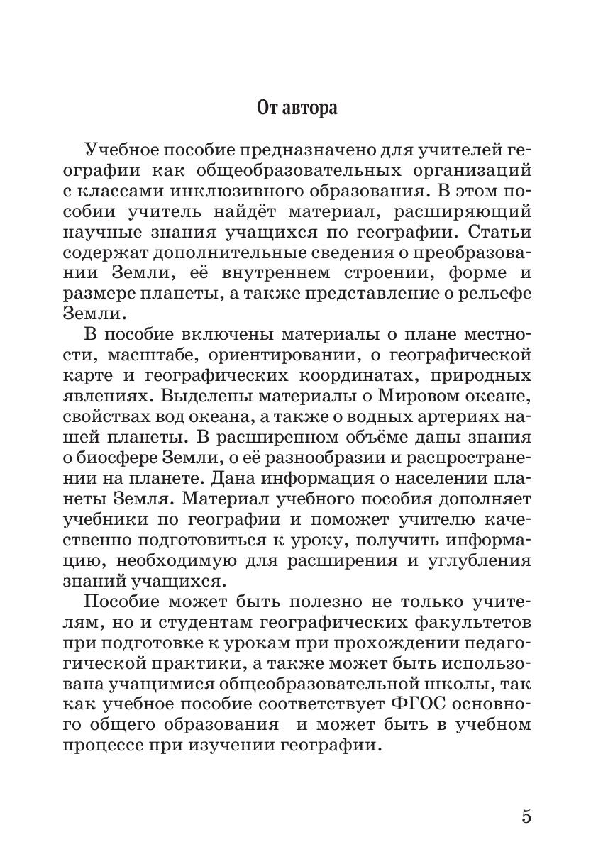 Учебное пособие содержит практический материал по географии для учащихся 6 класса общеобразовательных учреждений с классами инклюзивного образования. Материал систематизирован в соответствии с требованиями ФГОС основного общего образования и содержит знания, расширяющие представления учащихся о процессах, происходящих во Вселенной и природных явлениях на Земле, влияющих на жизнь живой оболочки нашей планеты и каждого человека. В пособии содержатся дополнительные сведения об основных понятиях географии: плане местности, географической широты и долготы, морских глубин и др. Рассматривается внутреннее строение нашей планеты, причины извержения вулканов, землетрясений, наводнений и цунами. Отдельные разделы посвящены погоде и климату, влиянию жизнедеятельности живых организмов и человека на природу. Учебное пособие адресовано учителям географии общеобразовательных учебных организаций, имеющих классы инклюзивного образования, студентам географических факультетов при прохождении педагогической практики в школах с инклюзивным обучением, может быть использовано учащимися при изучении географии.