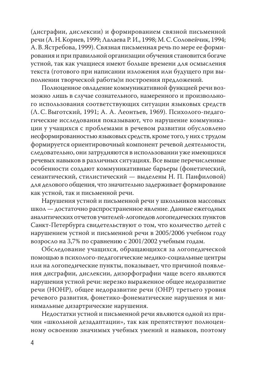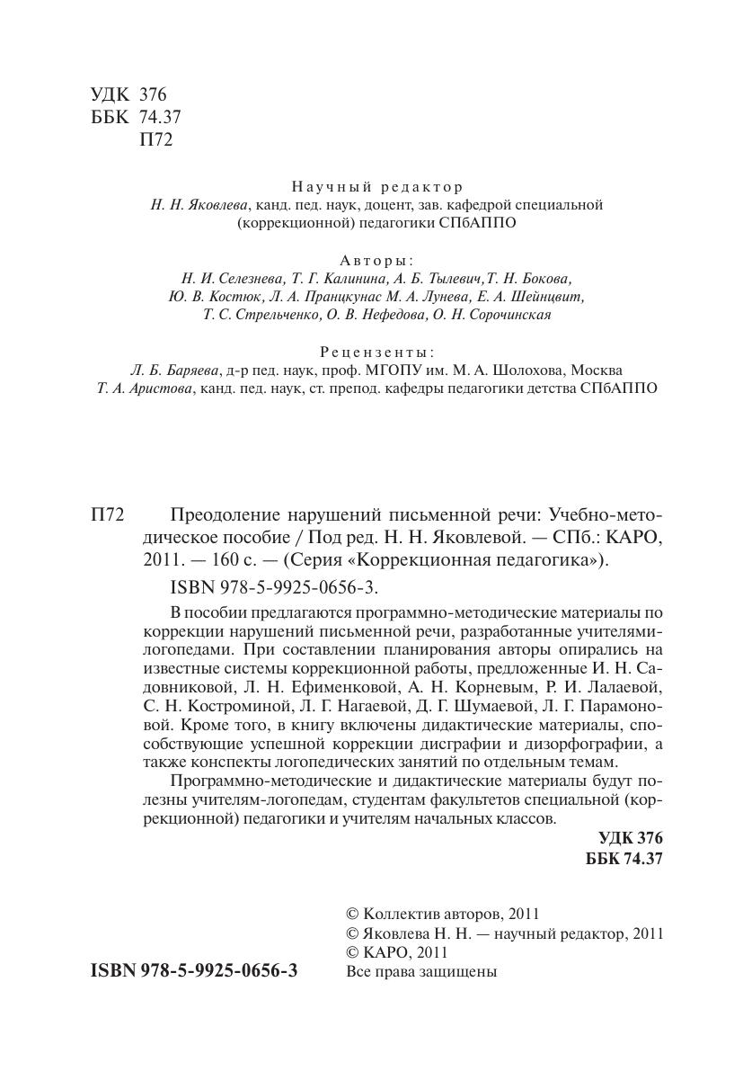 В пособии предлагаются программно-методические материалы по коррекции нарушений письменной речи, разработанные учителямилогопедами. При составлении планирования авторы опирались на известные системы коррекционной работы, предложенные И. Н. Садовниковой, Л. Н. Ефименковой, А. Н. Корневым, Р. И. Лалаевой, С. Н. Костроминой, Л. Г. Нагаевой, Д. Г. Шумаевой, Л. Г. Парамоновой. Кроме того, в книгу включены дидактические материалы, способствующие успешной коррекции дисграфии и дизорфографии, а также конспекты логопедических занятий по отдельным темам. Программно-методические и дидактические материалы будут полезны учителям-логопедам, студентам факультетов специальной (коррекционной) педагогики и учителям начальных классов.