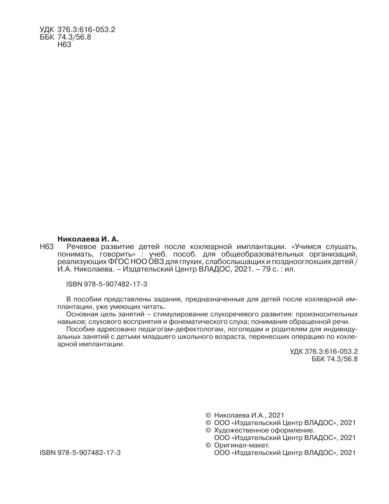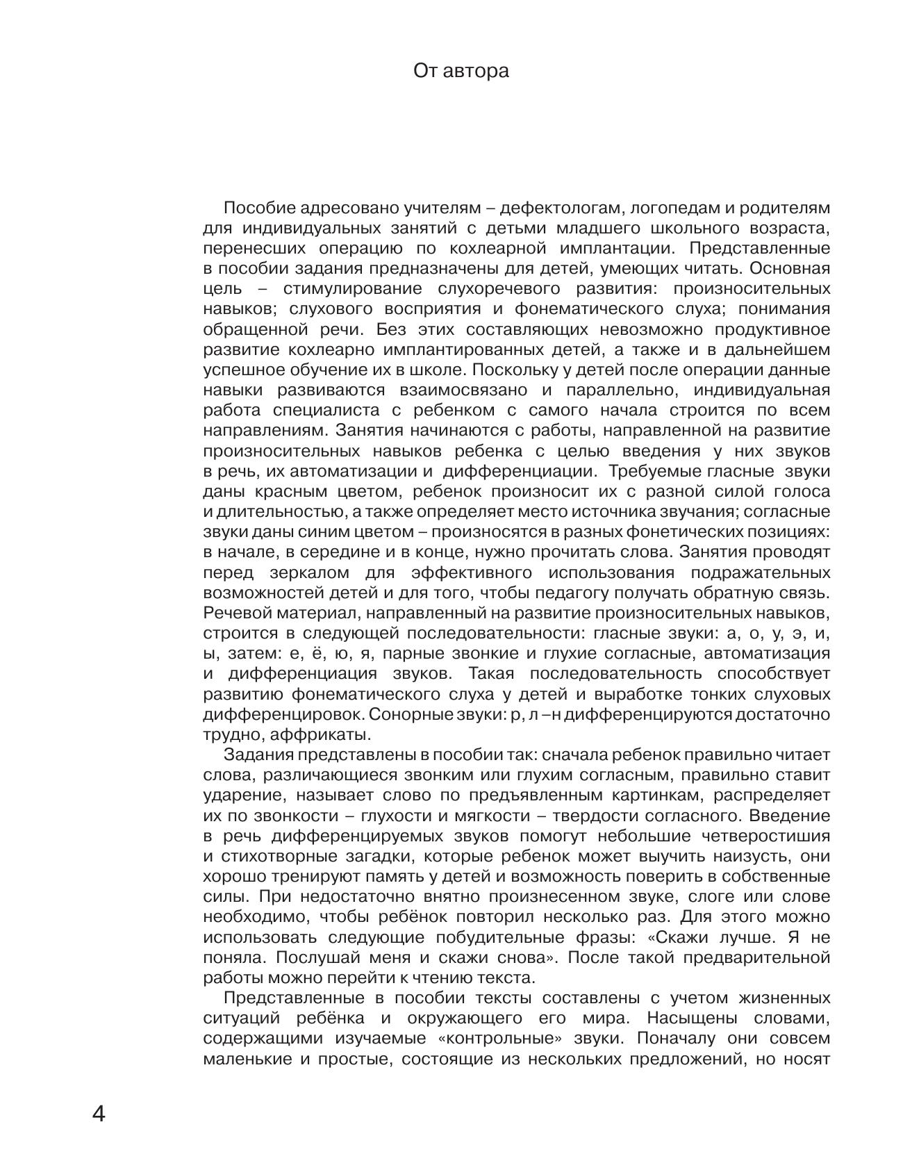 В пособии представлены задания, предназначенные для детей после кохлеарной имплантации, уже умеющих читать. Основная цель занятий - стимулирование слухоречевого развития: произносительных навыков; слухового восприятия и фонематического слуха; понимания обращенной речи. Пособие адресовано педагогам-дефектологам, логопедам и родителям для индивидуальных занятий с детьми младшего школьного возраста, перенесших операцию по кохлеарной имплантации.