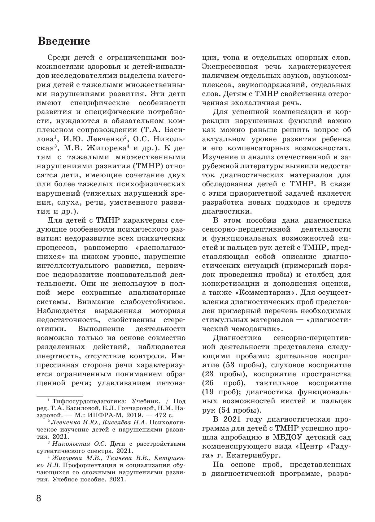 В пособии дана диагностика сенсорно-перцептивной сферы и функциональных возможностей кистей и пальцев рук детей с ТМНР, представляющая собой описание диагностических ситуаций (примерный порядок проведения пробы) и столбец для конкретизации и дополнения оценки, а также «Комментарии». Для осуществления диагностических проб представлен примерный перечень необходимых стимульных материалов – «диагностический чемоданчик». Пособие адресовано педагогам и воспитателям общеобразовательных организаций, родителям детей с ТМНР.