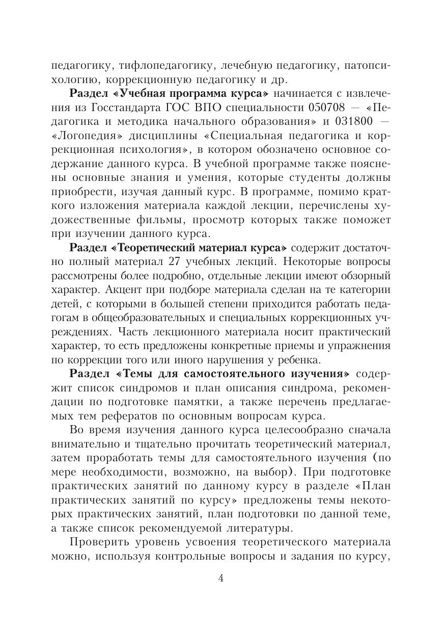 В учебно-методическом комплексе раскрыты основные вопросы специальной педагогики и психологии. Особое внимание уделено олигафренопедагогике и основам коррекционной работы с детьми, имеющими трудности в обучении ("трудные" дети, дети группы риска, дети с задержкой психического развития.