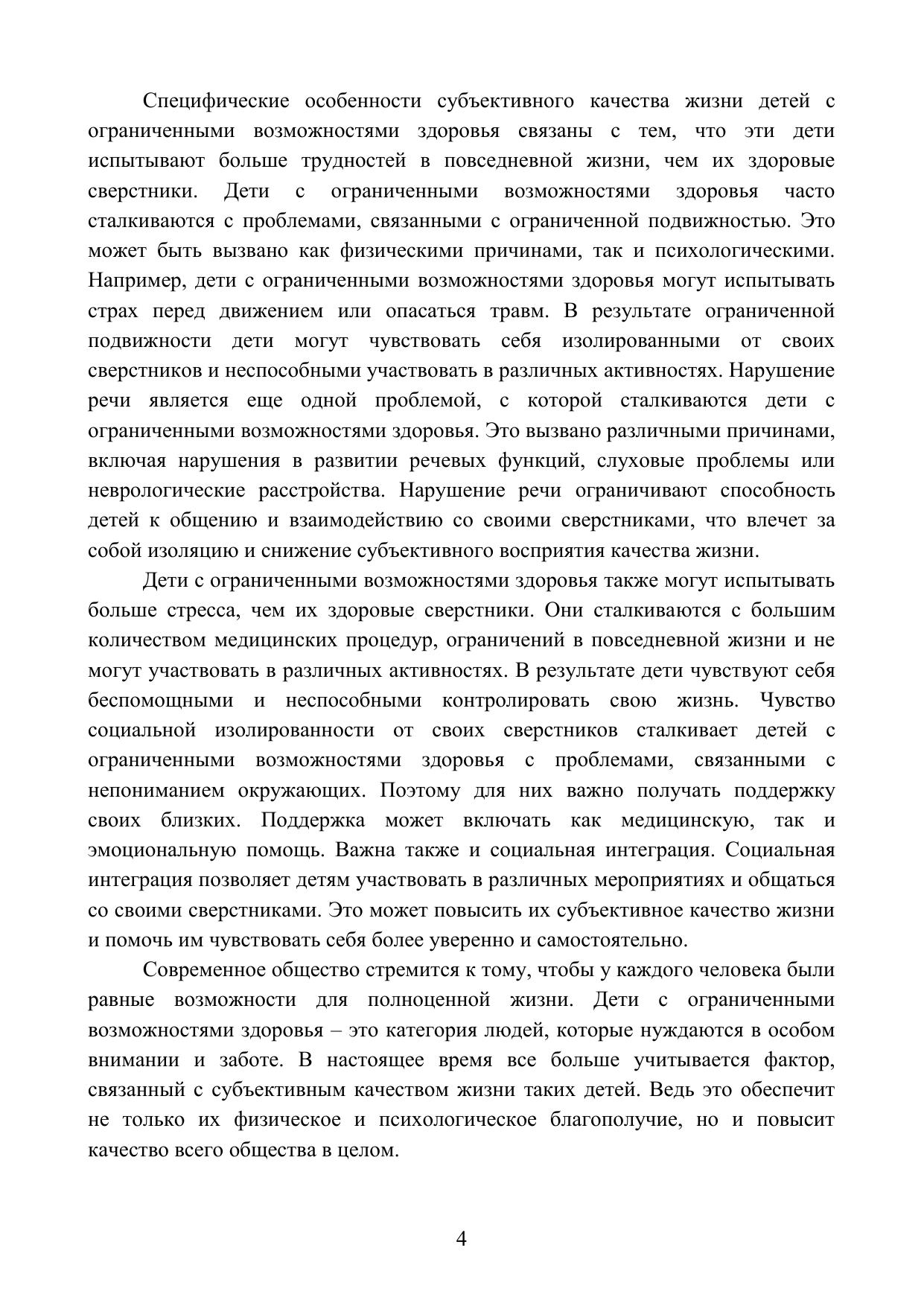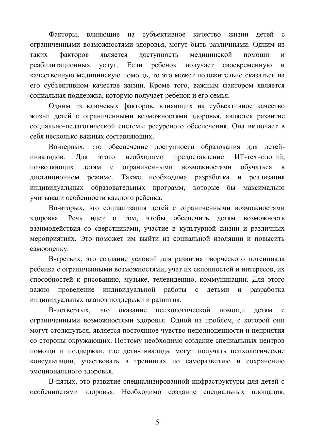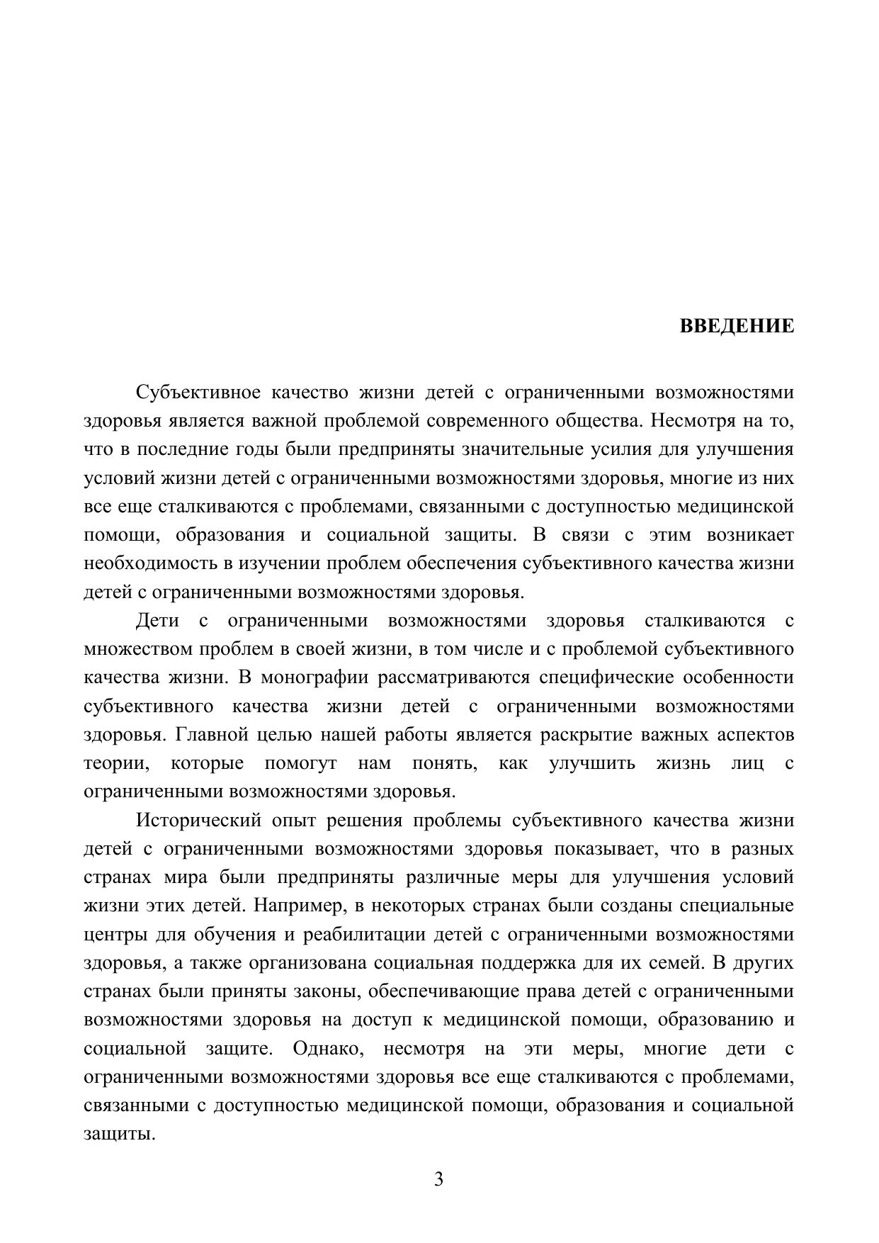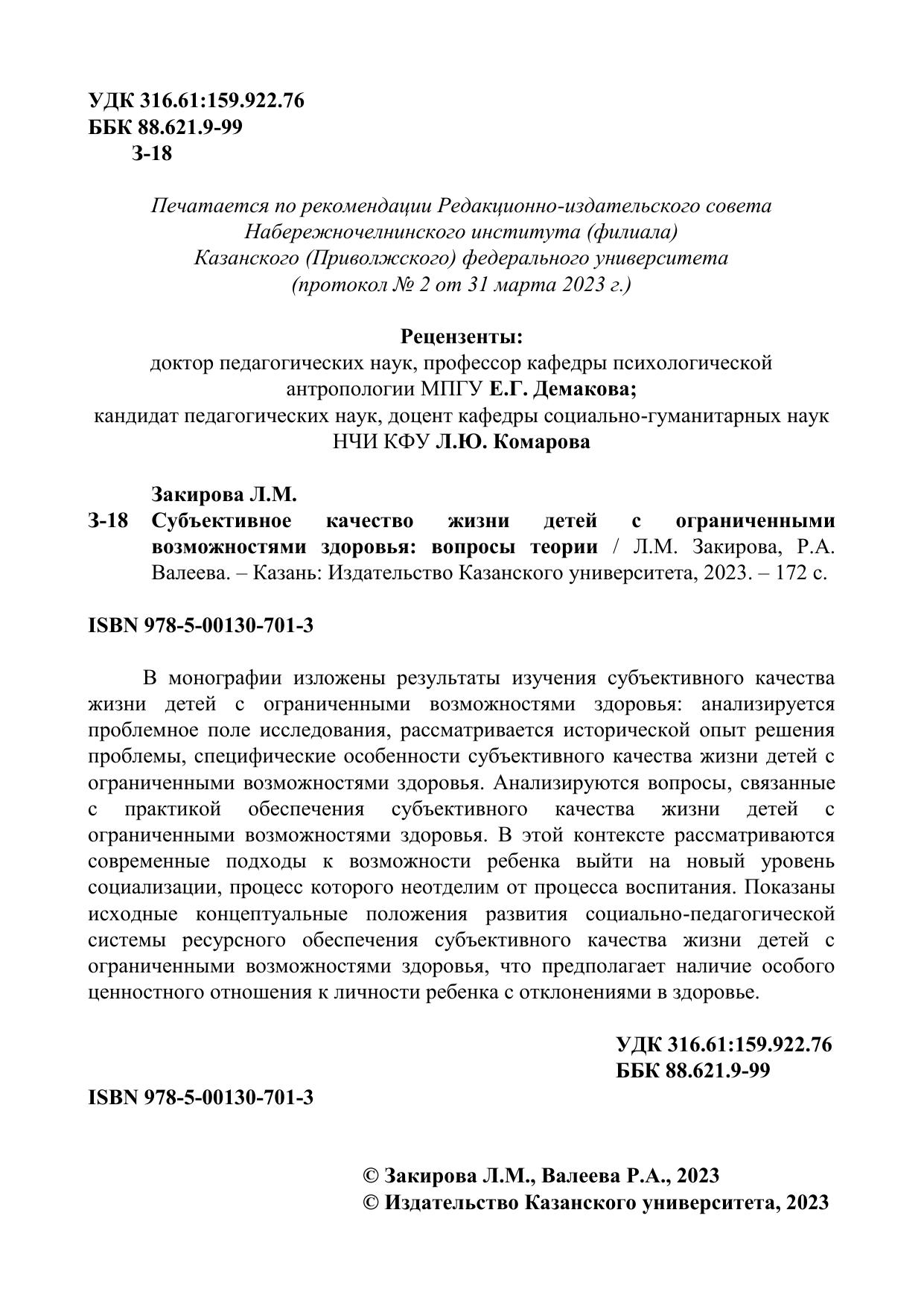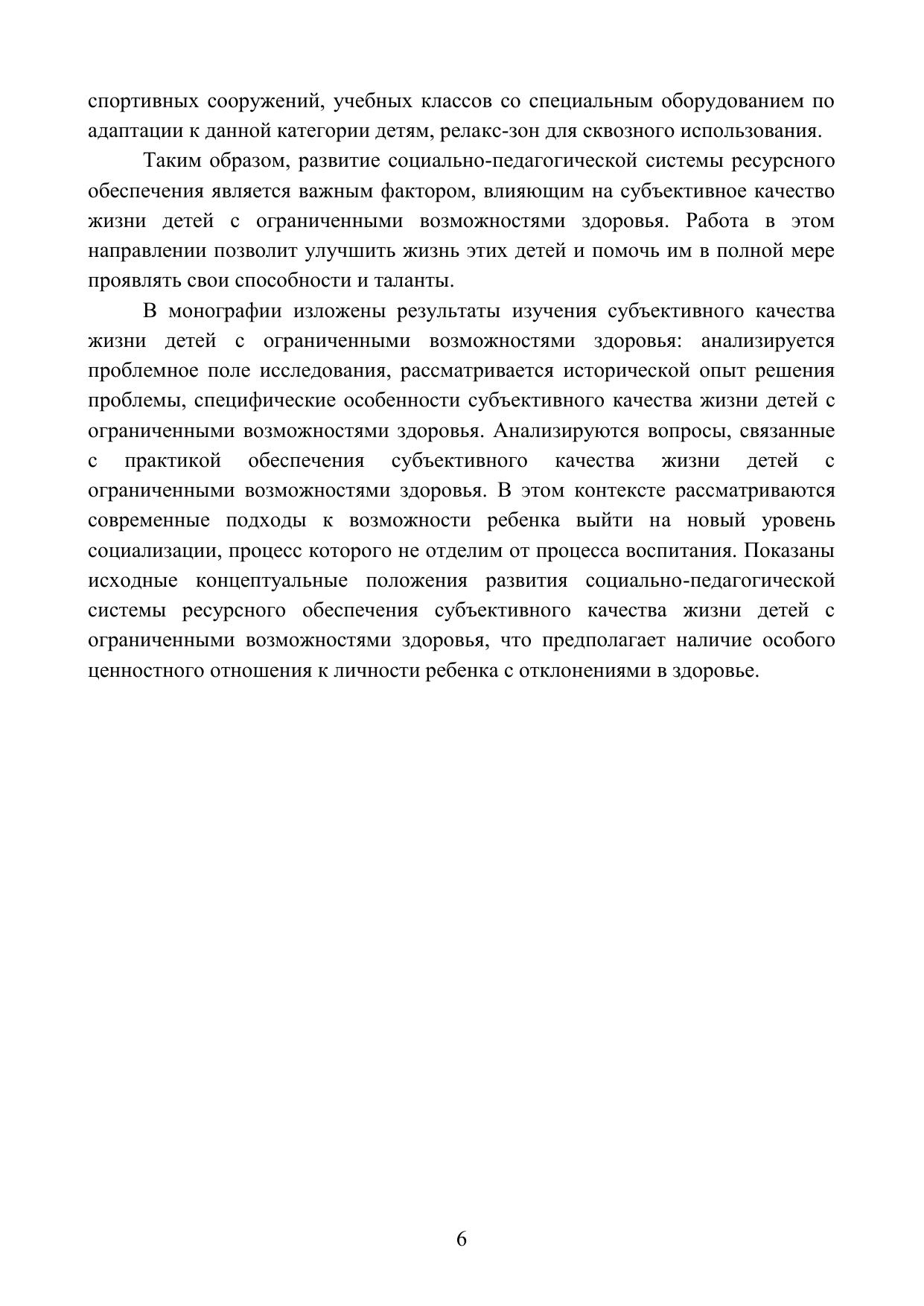 В монографии изложены результаты изучения субъективного качества жизни детей с ограниченными возможностями здоровья: анализируется проблемное поле исследования, рассматривается исторической опыт решения проблемы, специфические особенности субъективного качества жизни детей с ограниченными возможностями здоровья. Анализируются вопросы, связанные с практикой обеспечения субъективного качества жизни детей с ограниченными возможностями здоровья. В этой контексте рассматриваются современные подходы к возможности ребенка выйти на новый уровень социализации, процесс которого неотделим от процесса воспитания. Показаны исходные концептуальные положения развития социальнопедагогической системы ресурсного обеспечения субъективного качества жизни детей с ограниченными возможностями здоровья, что предполагает наличие особого ценностного отношения к личности ребенка с отклонениями в здоровье.