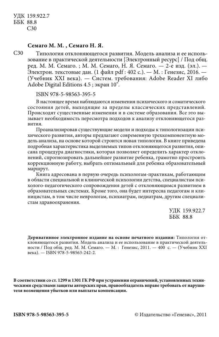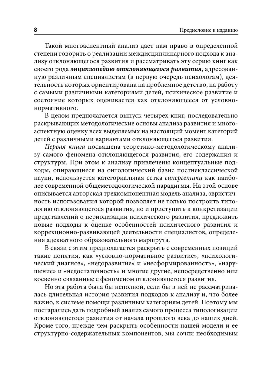Проанализировав существующие модели и подходы к типологизации психического развития, авторы предлагают современную трехкомпонентную модель анализа, на основе которой строится новая типология. В книге приведена подробная характеристика выделяемых типов отклоняющегося развития, описана процедура диагностики, которая позволяет определить характер отклонений, спрогнозировать дальнейшее развитие ребенка, грамотно простроить коррекционную работу, выбрать оптимальный для ребенка образовательный маршрут.