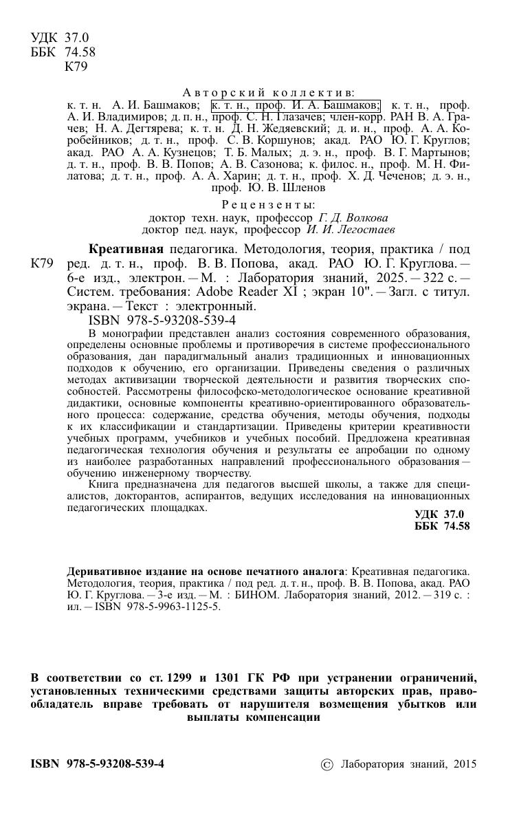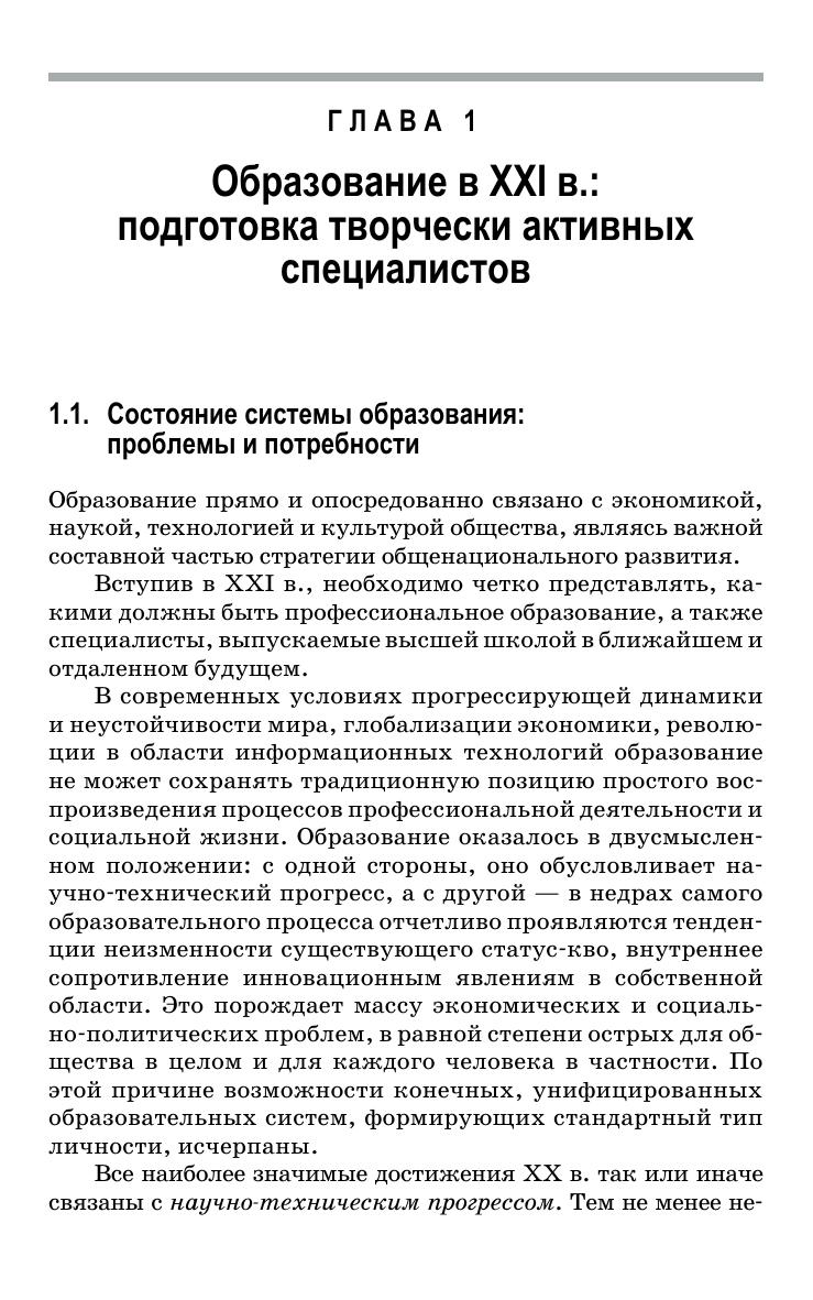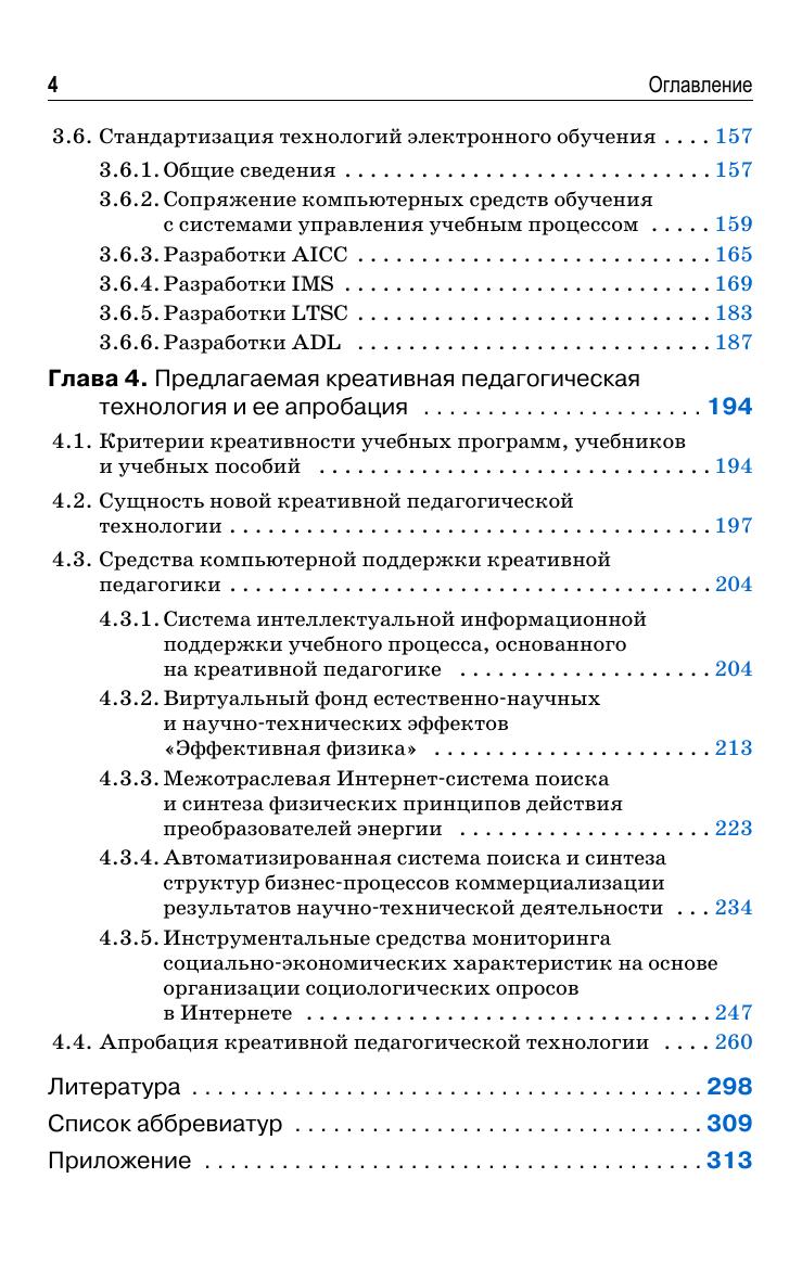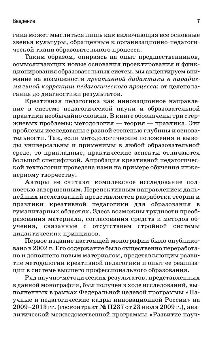 В монографии представлен анализ состояния современного образования, определены основные проблемы и противоречия в системе профессионального образования, дан парадигмальный анализ традиционных и инновационных подходов к обучению, его организации. Приведены сведения о различных методах активизации творческой деятельности и развития творческих способностей. Рассмотрены философско-методологическое основание креативной дидактики, основные компоненты креативно-ориентированного образовательного процесса: содержание, средства обучения, методы обучения, подходы к их классификации и стандартизации. Приведены критерии креативности учебных программ, учебников и учебных пособий. Предложена креативная педагогическая технология обучения и результаты ее апробации по одному из наиболее разработанных направлений профессионального образования — обучению инженерному творчеству. Книга предназначена для педагогов высшей школы, а также для специалистов, докторантов, аспирантов, ведущих исследования на инновационных педагогических площадках.