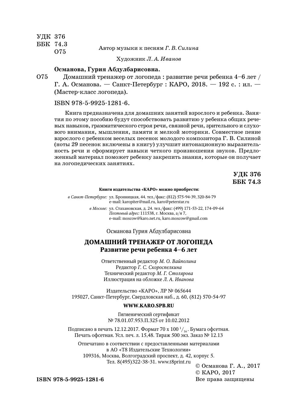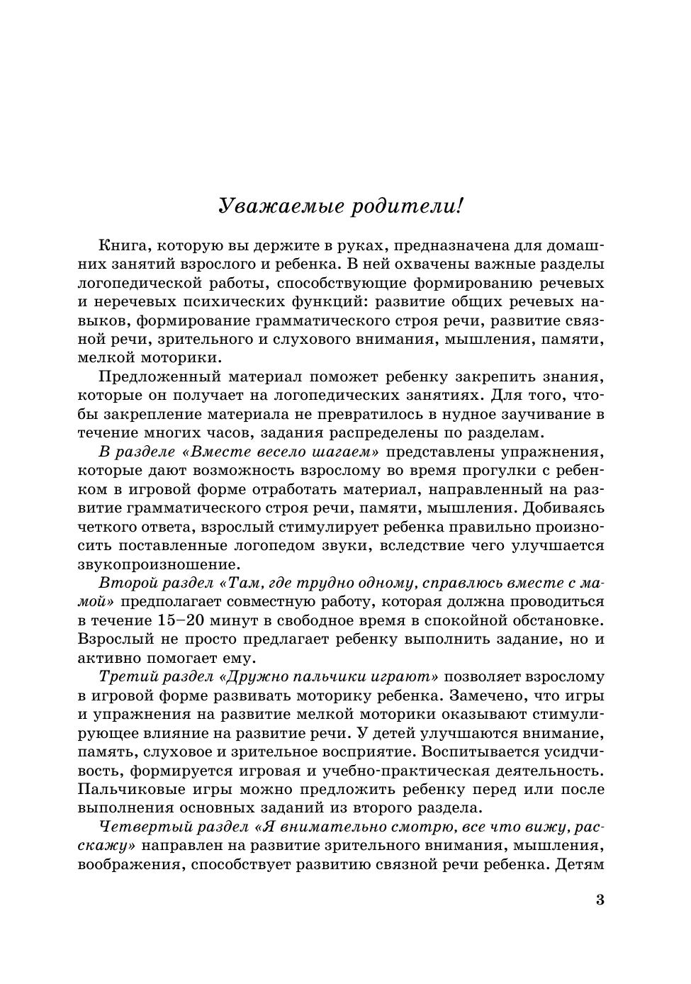 Книга предназначена для домашних занятий взрослого и ребенка. Занятия по этому пособию будут способствовать развитию у ребенка общих речевых навыков, грамматического строя речи, связной речи, зрительного и слухового внимания, мышления, памяти и мелкой моторики. Совместное пение взрослого с ребенком веселых песенок молодого композитора Г. В. Силиной (ноты 29 песенок включены в книгу) улучшит интонационную выразительность речи и сформирует навыки четкого произношения звуков. Предложенный материал поможет ребенку закрепить знания, которые он получает на логопедических занятиях.