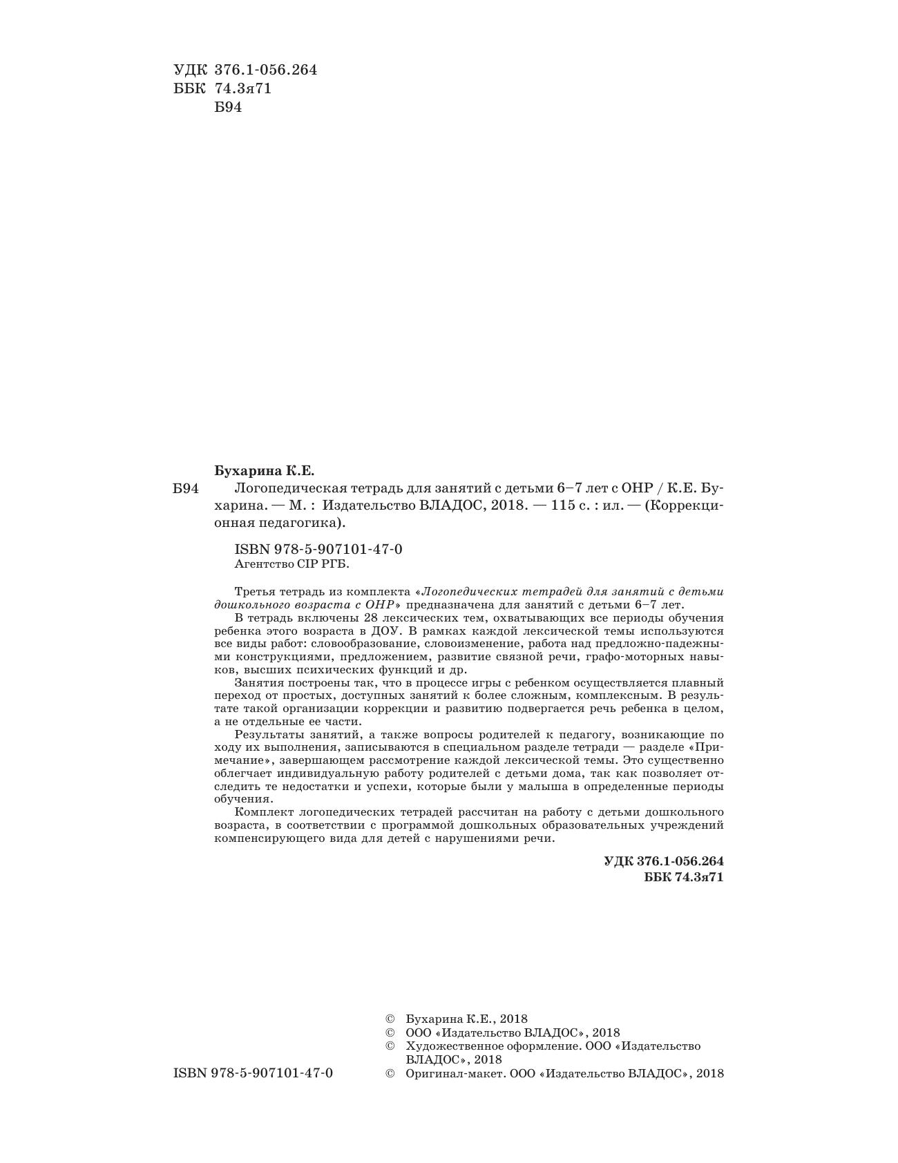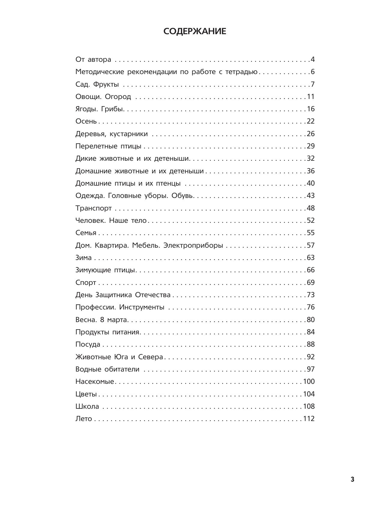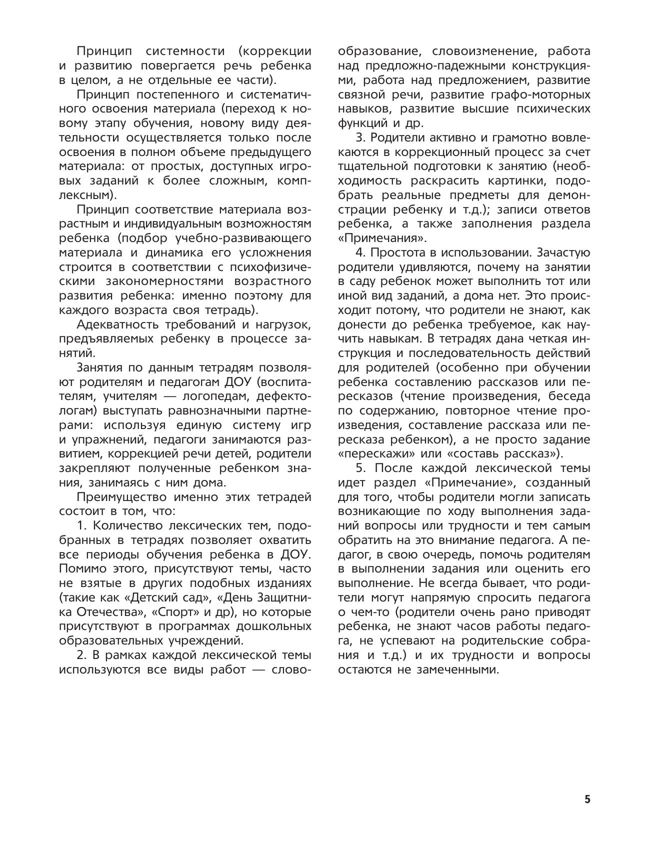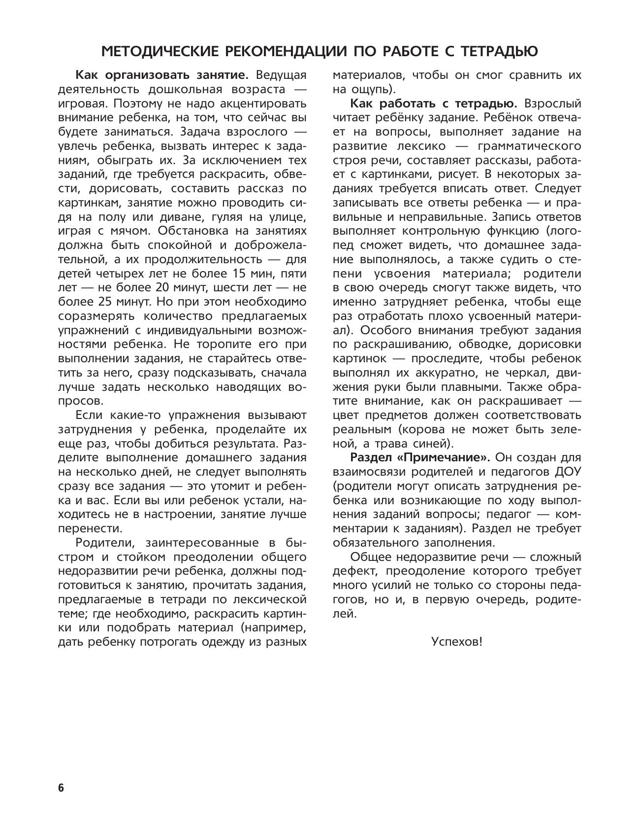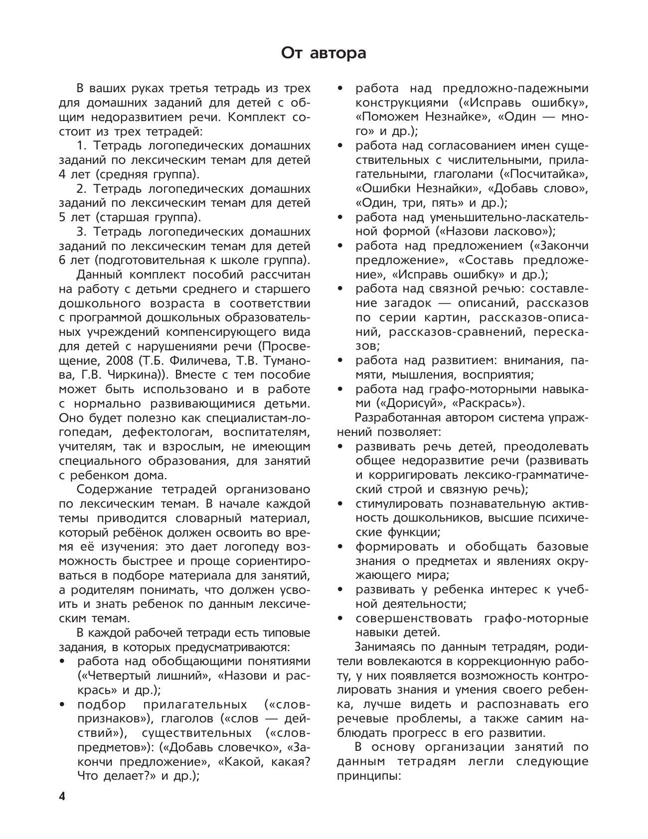 Третья тетрадь из комплекта «Логопедических тетрадей для занятий с детьми дошкольного возраста с ОНР» предназначена для занятий с детьми 6–7 лет. В тетрадь включены 28 лексических тем, охватывающих все периоды обучения ребенка этого возраста в ДОУ. В рамках каждой лексической темы используются все виды работ: словообразование, словоизменение, работа над предложно-падежными конструкциями, предложением, развитие связной речи, графо-моторных навыков, высших психических функций и др. Занятия построены так, что в процессе игры с ребенком осуществляется плавный переход от простых, доступных занятий к более сложным, комплексным. В результате такой организации коррекции и развитию подвергается речь ребенка в целом, а не отдельные ее части. Результаты занятий, а также вопросы родителей к педагогу, возникающие по ходу их выполнения, записываются в специальном разделе тетради — разделе «Примечание», завершающем рассмотрение каждой лексической темы. Это существенно облегчает индивидуальную работу родителей с детьми дома, так как позволяет отследить те недостатки и успехи, которые были у малыша в определенные периоды обучения. Комплект логопедических тетрадей рассчитан на работу с детьми дошкольного возраста, в соответствии с программой дошкольных образовательных учреждений компенсирующего вида для детей с нарушениями речи.