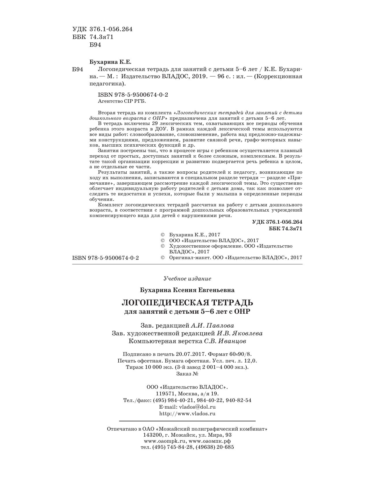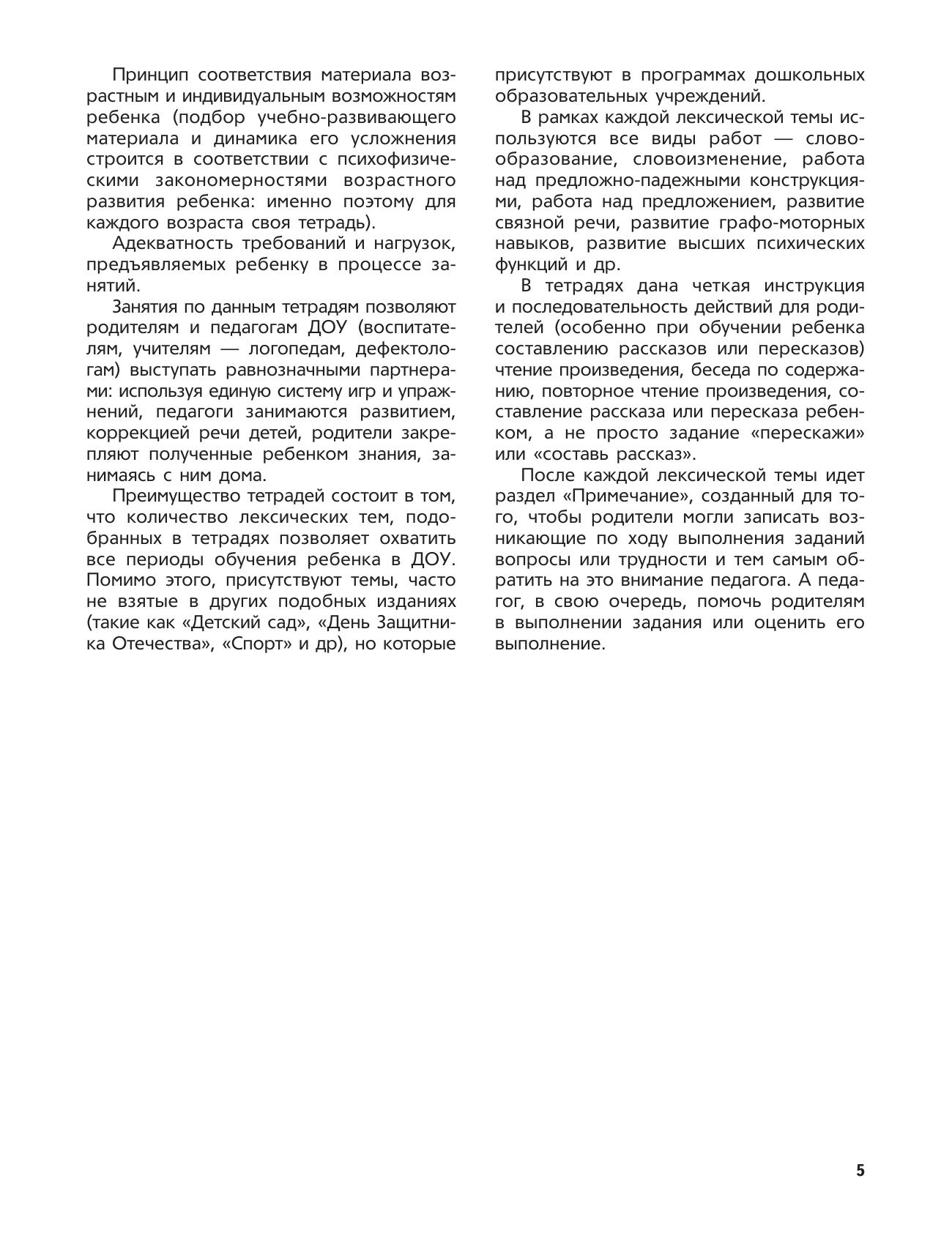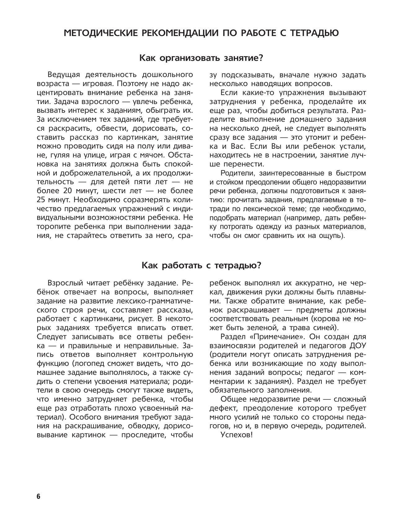 Вторая тетрадь из комплекта «Логопедических тетрадей для занятий с детьми дошкольного возраста с ОНР» предназначена для занятий с детьми 5–6 лет. В тетрадь включены 29 лексических тем, охватывающих все периоды обучения ребенка этого возраста в ДОУ. В рамках каждой лексической темы используются все виды работ: словообразование, словоизменение, работа над предложно-падежными конструкциями, предложением, развитие связной речи, графо-моторных навыков, высших психических функций и др. Занятия построены так, что в процессе игры с ребенком осуществляется плавный переход от простых, доступных занятий к более сложным, комплексным. В результате такой организации коррекции и развитию подвергается речь ребенка в целом, а не отдельные ее части. Результаты занятий, а также вопросы родителей к педагогу, возникающие по ходу их выполнения, записываются в специальном разделе тетради — разделе «Примечание», завершающем рассмотрение каждой лексической темы. Это существенно облегчает индивидуальную работу родителей с детьми дома, так как позволяет отследить те недостатки и успехи, которые были у малыша в определенные периоды обучения. Комплект логопедических тетрадей рассчитан на работу с детьми дошкольного возраста, в соответствии с программой дошкольных образовательных учреждений компенсирующего вида для детей с нарушениями речи.