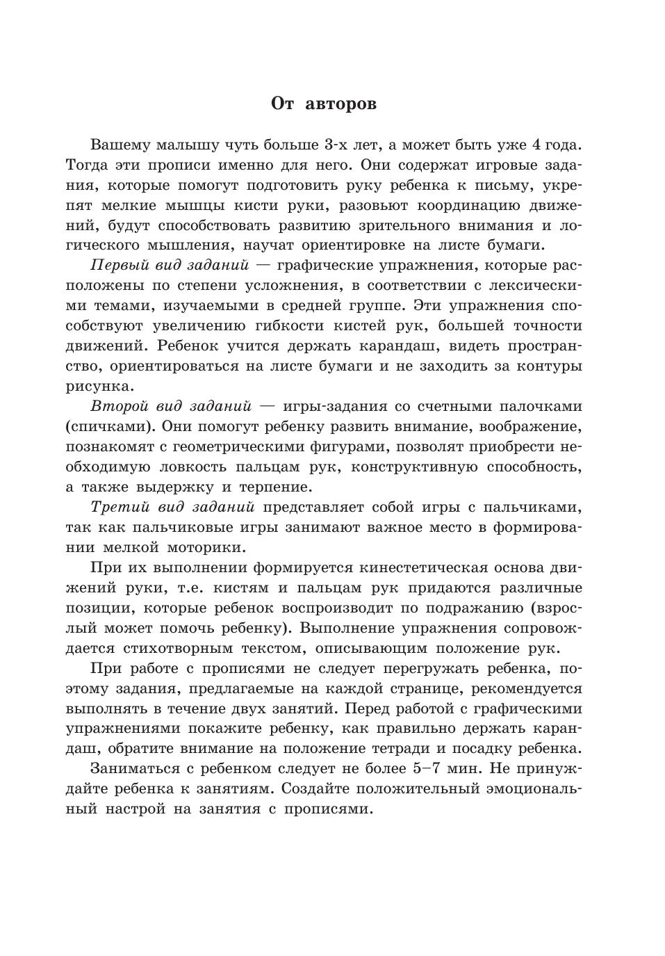 Если вашему малышу чуть больше 3-х лет, а может быть уже 4, тогда эти прописи именно для него. Они содержат игровые задания, которые помогут подготовить руки малыша к письму; будут способствовать развитию зрительного внимания и логического мышления, научат ориентировке на листе бумаги. Графические упражнения расположены по степени усложнения и в соответствии с теми лексическими темами, которые изучаются в средней группе. При выполнении этих упражнений ребенок учится видеть пространство и ориентироваться на листе бумаге. Игры – задания со счетными палочками (спичками) помогают развивать внимание, воображение, знакомят с геометрическими фигурами, способствуют приобретению конструктивной способности, воспитывают выдержку и терпение. Пальчиковые игры занимают важное место в формировании мелкой моторики. Выполнение упражнения сопровождается стихотворным текстом, описывающим положение рук.