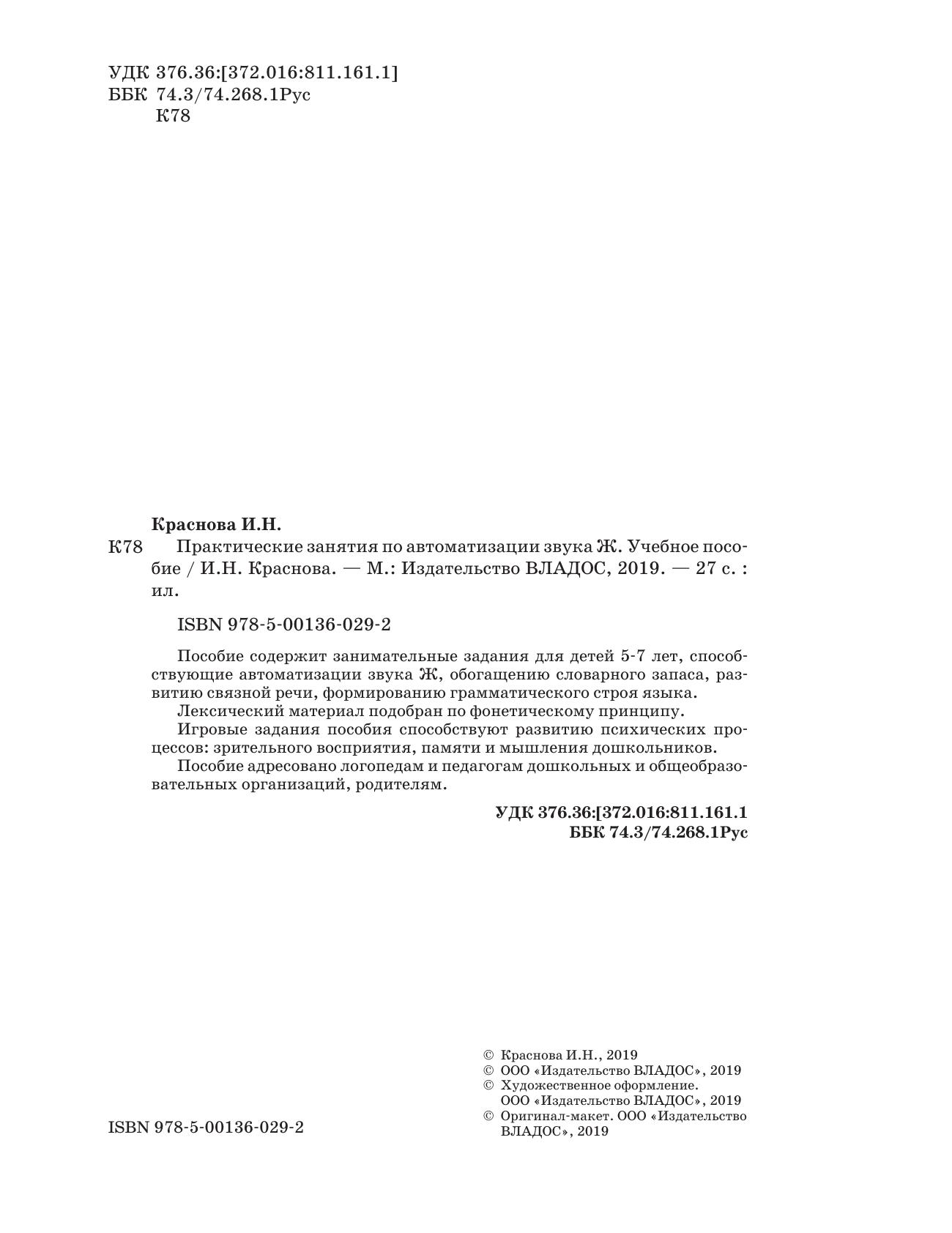Пособие содержит занимательные задания для детей 5-7 лет, способствующие автоматизации звука Ж, обогащению словарного запаса, развитию связной речи, формированию грамматического строя языка. Лексический материал подобран по фонетическому принципу. Игровые задания пособия способствуют развитию психических процессов: зрительного восприятия, памяти и мышления дошкольников. Пособие адресовано логопедам и педагогам дошкольных и общеобразовательных организаций, родителям.