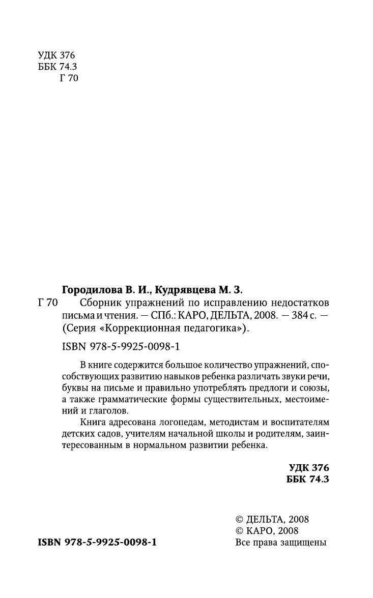 В книге содержится большое количество упражнений, способствующих развитию навыков ребенка различать звуки речи, буквы на письме и правильно употреблять предлоги и союзы, а также грамматические формы существительных, местоимений и глаголов. Книга адресована логопедам, методистам и воспитателям детских садов, учителям начальной школы и родителям, заинтересованным в нормальном развитии ребенка.