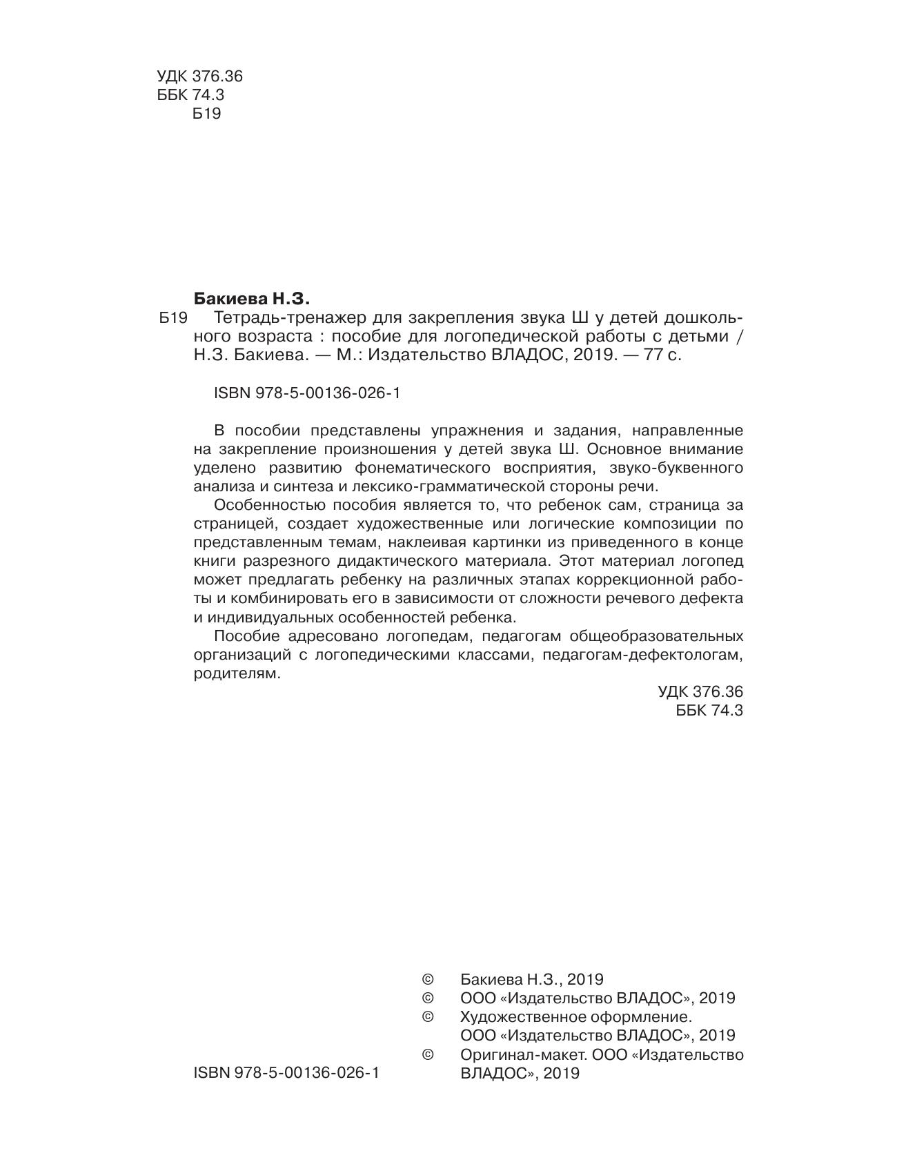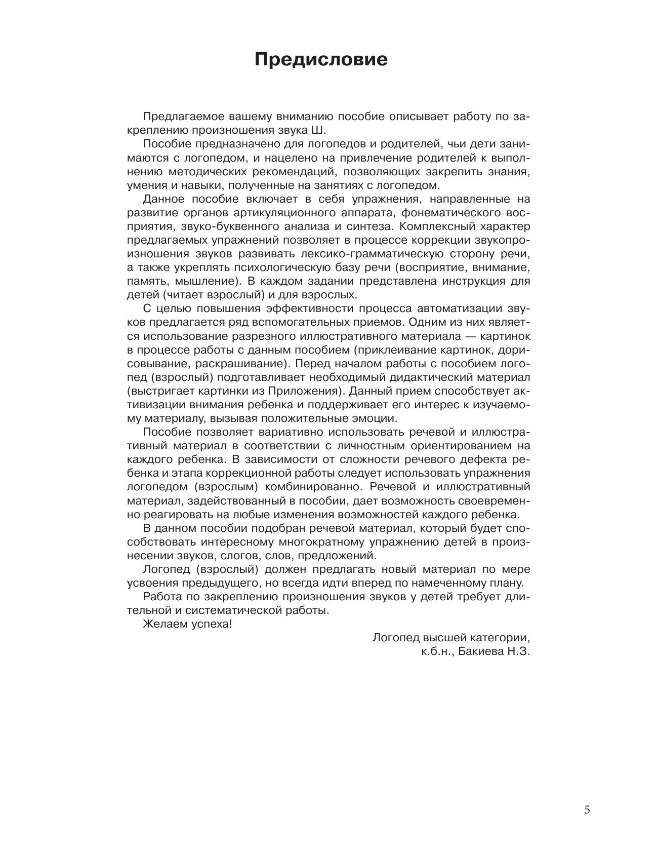 В пособии представлены упражнения и задания, направленные на закрепление произношения у детей звука Ш. Основное внимание уделено развитию фонематического восприятия, звуко-буквенного анализа и синтеза и лексико-грамматической стороны речи. Особенностью пособия является то, что ребенок сам, страница за страницей, создает художественные или логические композиции по представленным темам, наклеивая картинки из приведенного в конце книги разрезного дидактического материала. Этот материал логопед может предлагать ребенку на различных этапах коррекционной работы и комбинировать его в зависимости от сложности речевого дефекта и индивидуальных особенностей ребенка. Пособие адресовано логопедам, педагогам общеобразовательных организаций с логопедическими классами, педагогам-дефектологам, родителям.