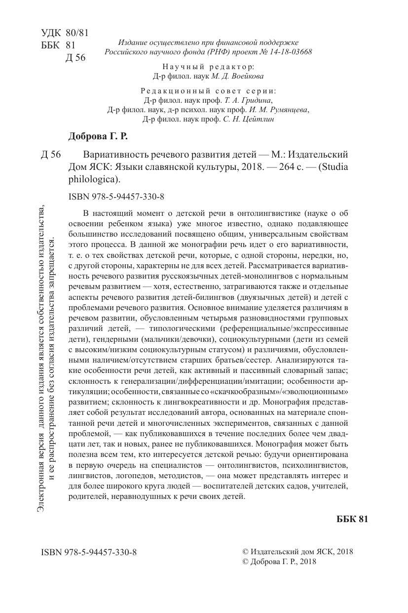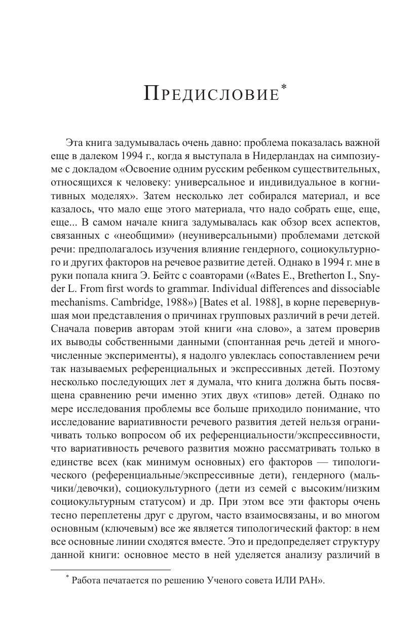 В настоящий момент о детской речи в онтолингвистике (науке о об освоении ребенком языка) уже многое известно, однако подавляющее большинство исследований посвящено общим, универсальным свойствам этого процесса. В данной же монографии речь идет о его вариативности, т. е. о тех свойствах детской речи, которые, с одной стороны, нередки, но, с другой стороны, характерны не для всех детей. Рассматривается вариативность речевого развития русскоязычных детей-монолингвов с нормальным речевым развитием — хотя, естественно, затрагиваются также и отдельные аспекты речевого развития детей-билингвов (двуязычных детей) и детей с проблемами речевого развития. Основное внимание уделяется различиям в речевом развитии, обусловленным четырьмя разновидностями групповых различий детей, — типологическими (референциальные/экспрессивные дети), гендерными (мальчики/девочки), социокультурными (дети из семей с высоким/низким социокультурным статусом) и различиями, обусловленными наличием/отсутствием старших братьев/сестер. Анализируются такие особенности речи детей, как активный и пассивный словарный запас, склонность к генерализации/дифференциации/имитации, особенности артикуляции, особенности, связанные со «скачкообразным»/«эволюционным» развитием, склонность к лингвокреативности и др. Монография представляет собой результат исследований автора, основанных на материале спонтанной речи детей и многочисленных экспериментов, связанных с данной проблемой, — как публиковавшихся в течение последних более чем двадцати лет, так и новых, ранее не публиковавшихся. Монография может быть полезна всем тем, кто интересуется детской речью: будучи ориентирована в первую очередь на специалистов — онтолингвистов, психолингвистов, лингвистов, логопедов, методистов, — она может представлять интерес и для более широкого круга людей — воспитателей детских садов, учителей, родителей, неравнодушных к речи своих детей.