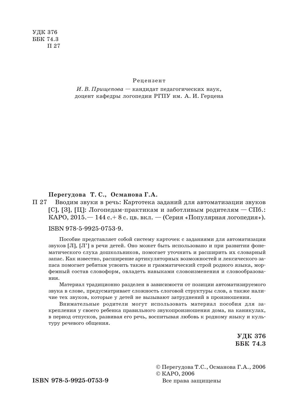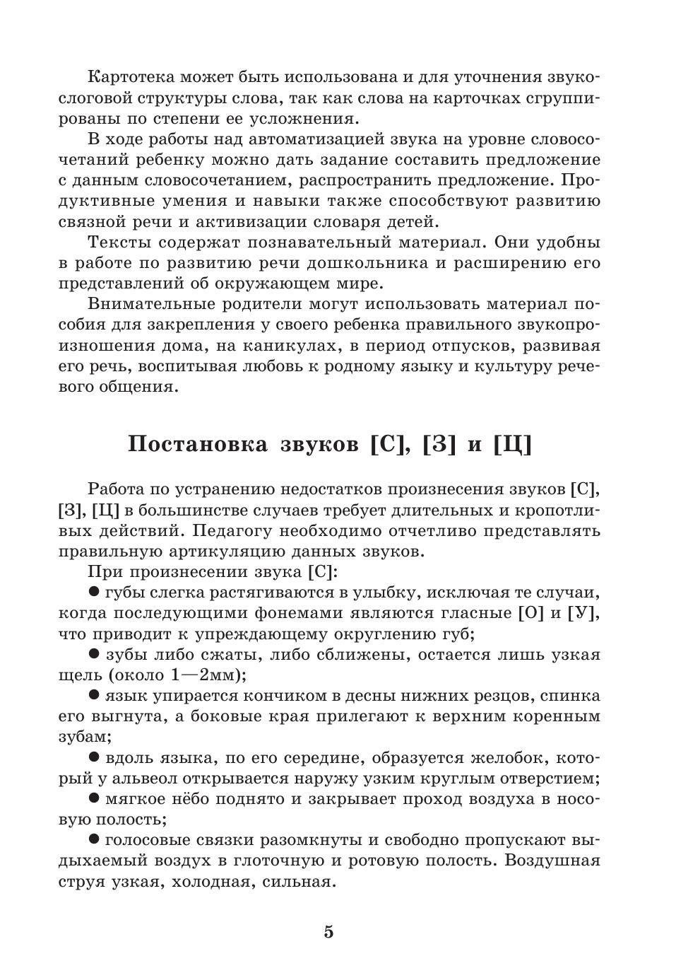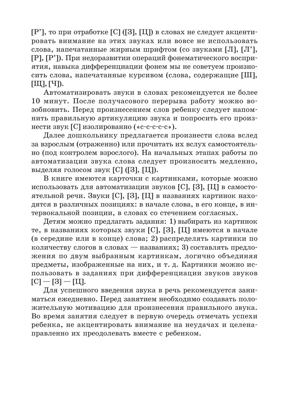 Пособие представляет собой систему карточек с заданиями для автоматизации звуков [С], [3], [Ц] в речи детей. Оно может быть использовано и при развитии фонематического слуха дошкольников, помогает уточнить и расширить их словарный запас. Как известно, расширение артикуляторных возможностей и лексического запаса помогает ребятам усвоить также и грамматический строй родного языка, морфемный состав словоформ, овладеть навыками словоизменения и словообразования. Материал традиционно разделен в зависимости от позиции автоматизируемого звука в слове, предусматривает сложность слоговой структуры слов, а также наличие тех звуков, которые у детей не вызывают затруднений в произношении.Внимательные родители могут использовать материал пособия для закрепления у своего ребенка правильного звукопроизношения дома, на каникулах, в период отпусков, развивая его речь, воспитывая любовь к родному языку и культуру речевого общения.