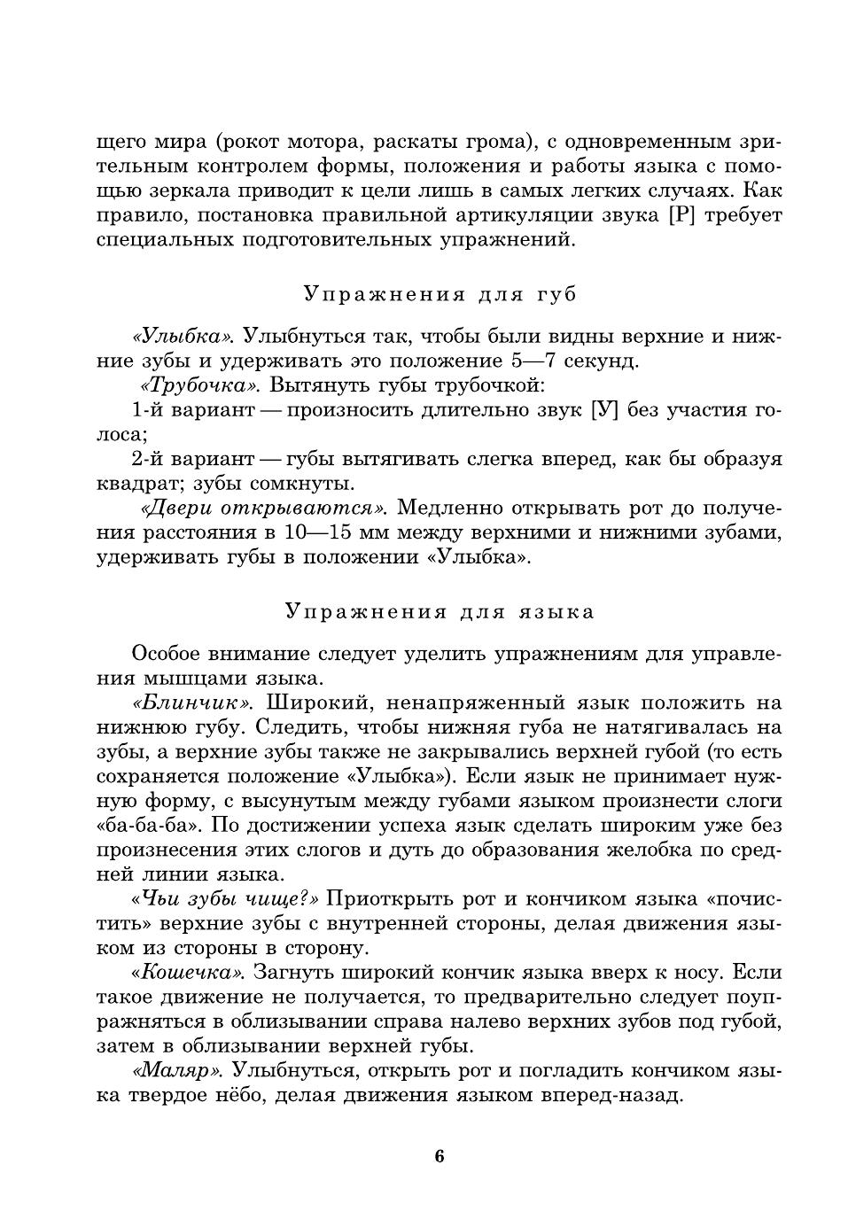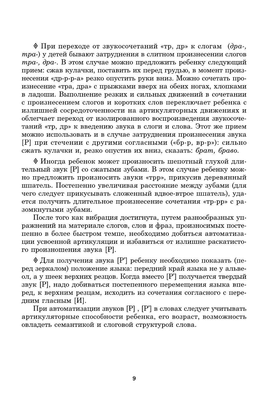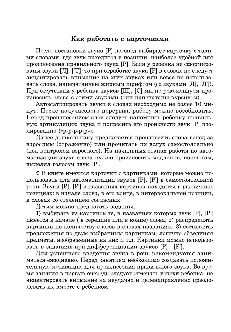 Пособие представляет собой систему карточек с заданиями для автоматизации звуков [Р], [Р'] в речи детей. Оно может быть использовано и при развитии фонематического слуха дошкольников, помогает уточнить и расширить их словарный запас. Как известно, расширение артикуляторных возможностей и лексического запаса помогает ребятам усвоить также и грамматический строй родного языка, морфемный состав словоформ, овладеть навыками словоизменения и словообразования. Материал традиционно разделен в зависимости от позиции автоматизируемого звука в слове, предусматривает сложность слоговой структуры слов, а также наличие тех звуков, которые у детей не вызывают затруднений в произношении. Внимательные родители могут использовать материал пособия для закрепления у своего ребенка правильного звукопроизношения дома, на каникулах, в период отпусков, развивая его речь, воспитывая любовь к родному языку и культуру речевого общения.