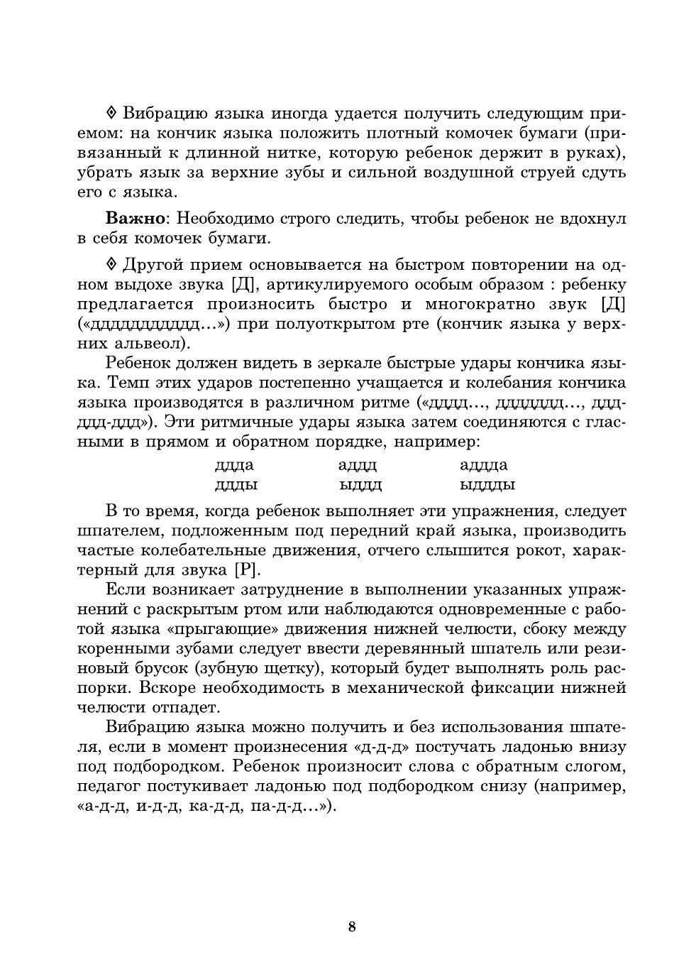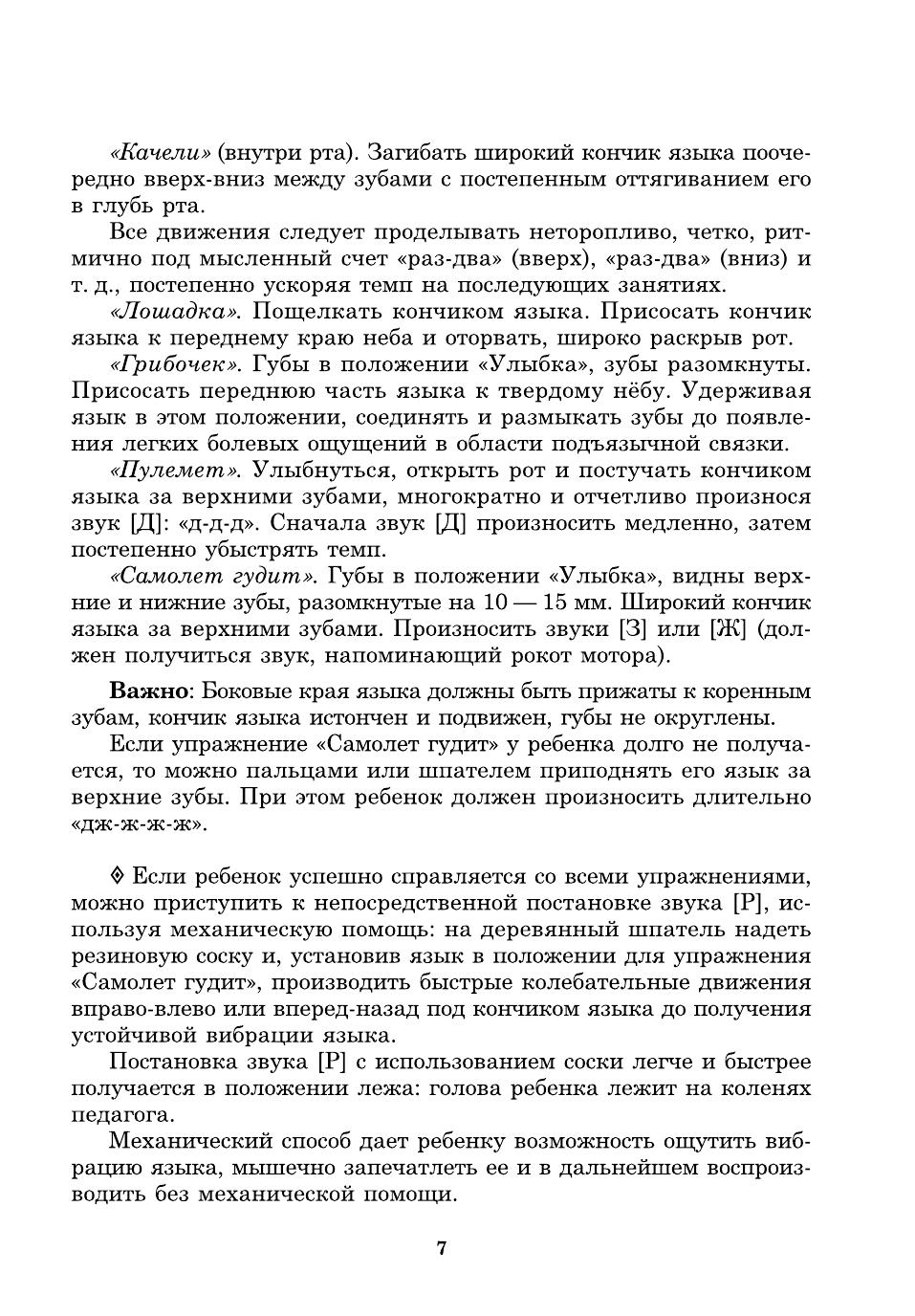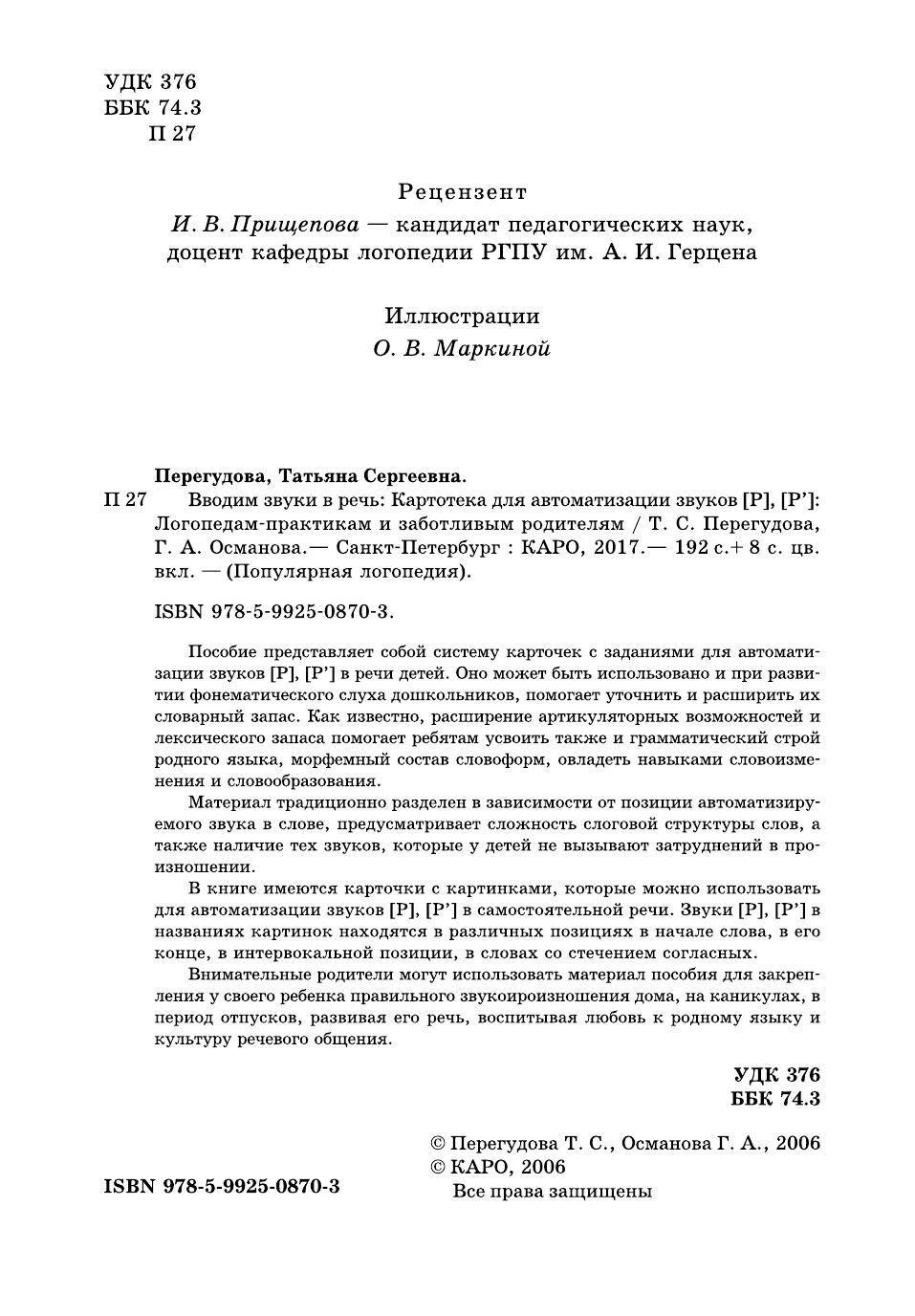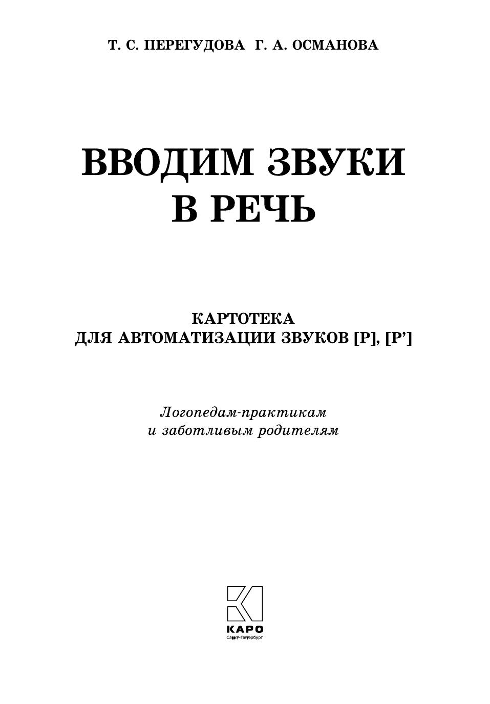Пособие представляет собой систему карточек с заданиями для автоматизации звуков [Р], [Р'] в речи детей. Оно может быть использовано и при развитии фонематического слуха дошкольников, помогает уточнить и расширить их словарный запас. Как известно, расширение артикуляторных возможностей и лексического запаса помогает ребятам усвоить также и грамматический строй родного языка, морфемный состав словоформ, овладеть навыками словоизменения и словообразования. Материал традиционно разделен в зависимости от позиции автоматизируемого звука в слове, предусматривает сложность слоговой структуры слов, а также наличие тех звуков, которые у детей не вызывают затруднений в произношении. Внимательные родители могут использовать материал пособия для закрепления у своего ребенка правильного звукопроизношения дома, на каникулах, в период отпусков, развивая его речь, воспитывая любовь к родному языку и культуру речевого общения.