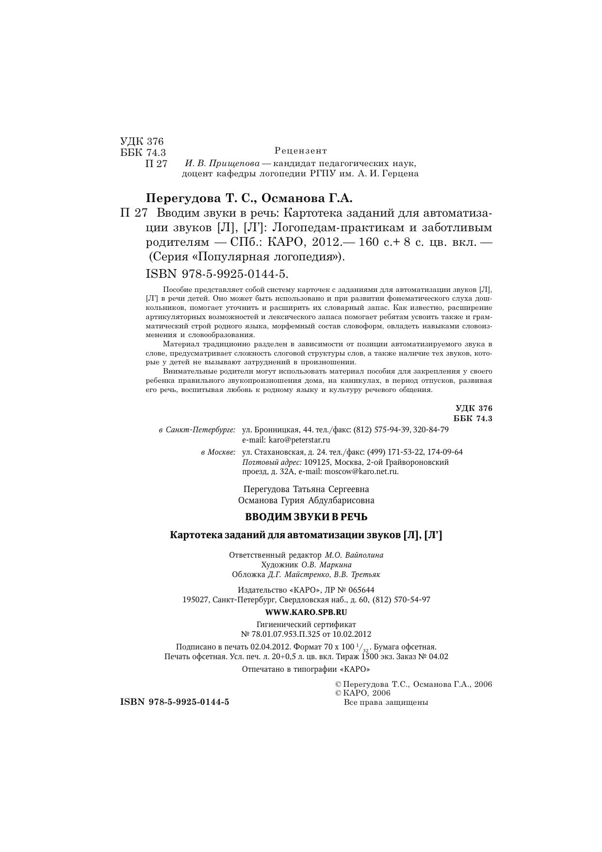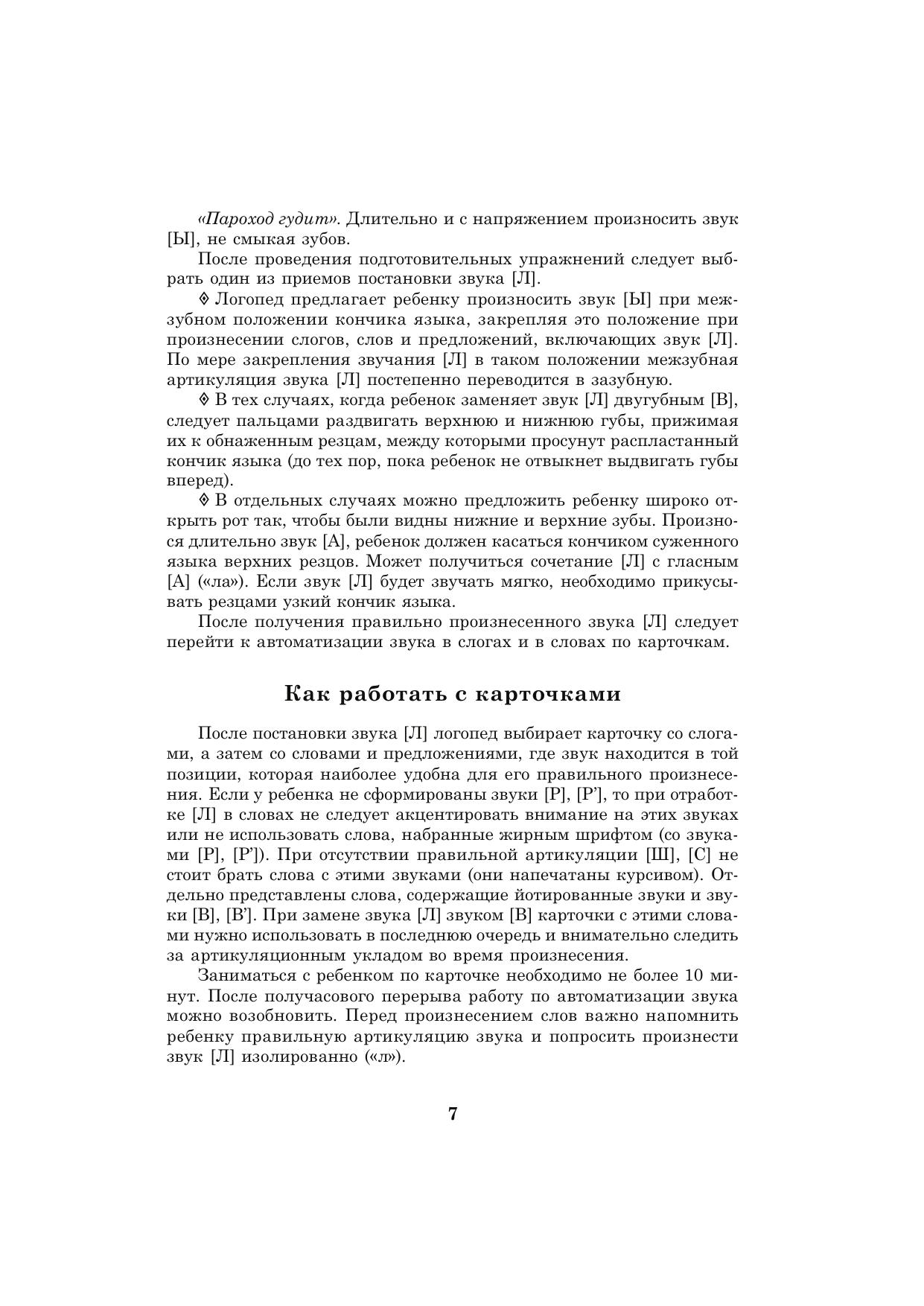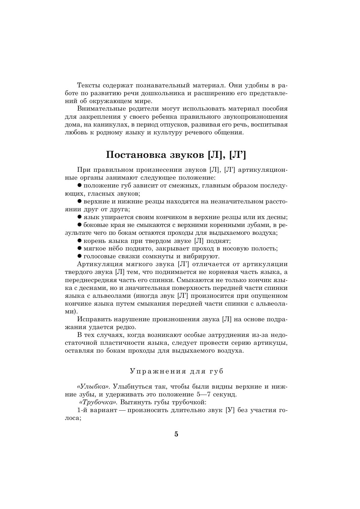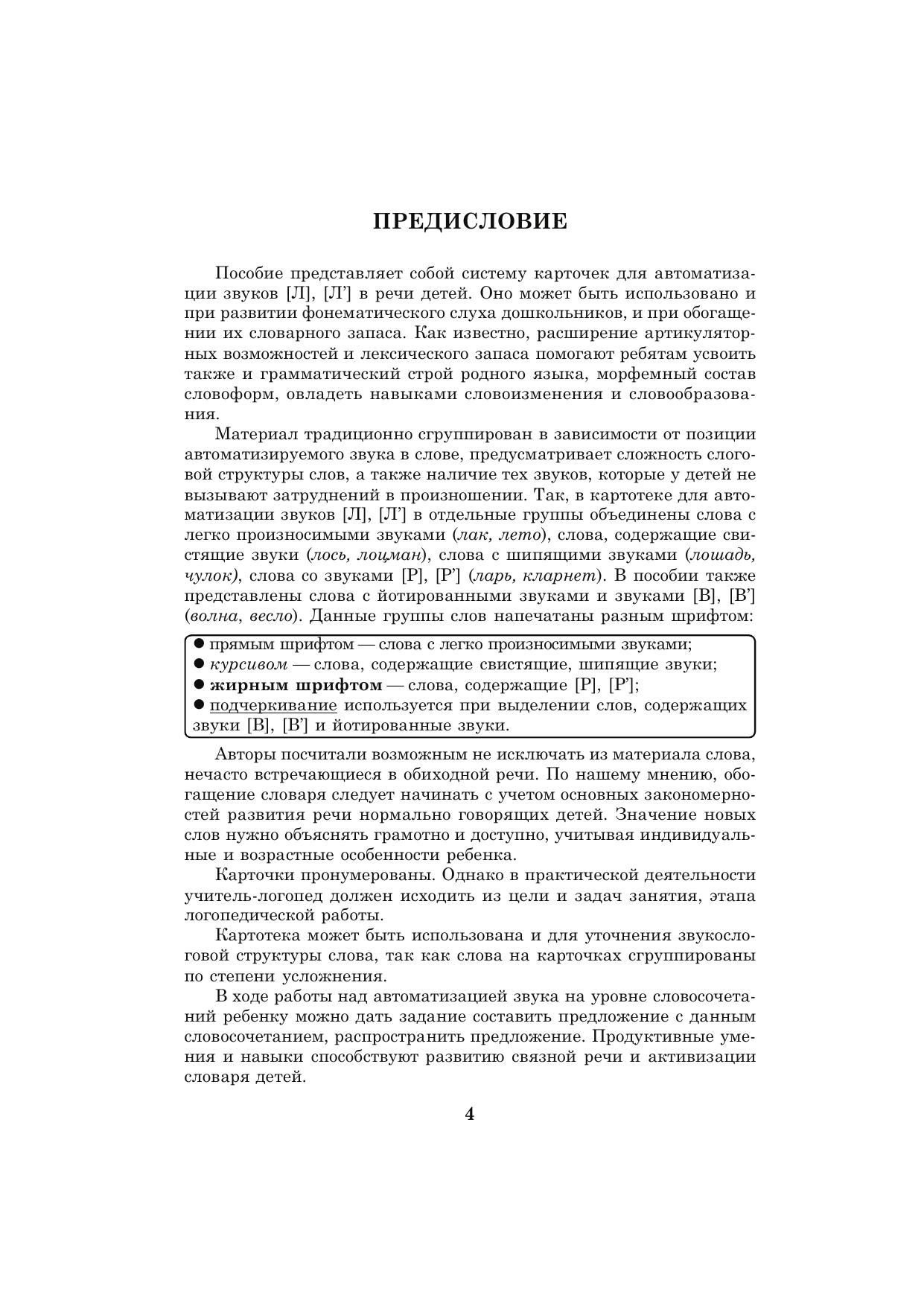 Пособие представляет собой систему карточек с заданиями для автоматизации звуков [Л], [Л’] в речи детей. Оно может быть использовано и при развитии фонематического слуха дошкольников, помогает уточнить и расширить их словарный запас. Как известно, расширение артикуляторных возможностей и лексического запаса помогает ребятам усвоить также и грамматический строй родного языка, морфемный состав словоформ, овладеть навыками словоизменения и словообразования. Материал традиционно разделен в зависимости от позиции автоматизируемого звука в слове, предусматривает сложность слоговой структуры слов, а также наличие тех звуков, которые у детей не вызывают затруднений в произношении. Внимательные родители могут использовать материал пособия для закрепления у своего ребенка правильного звукопроизношения дома, на каникулах, в период отпусков, развивая его речь, воспитывая любовь к родному языку и культуру речевого общения.