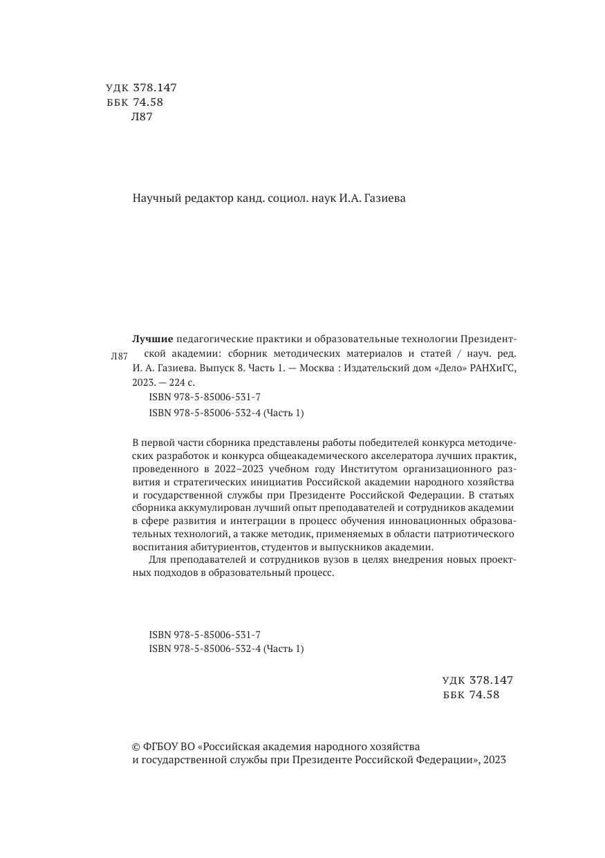 В первой части сборника представлены работы победителей конкурса методических разработок и конкурса общеакадемического акселератора лучших практик, проведенного в 2022–2023 учебном году Институтом организационного развития и стратегических инициатив Российской академии народного хозяйства и государственной службы при Президенте Российской Федерации. В статьях сборника аккумулирован лучший опыт преподавателей и сотрудников академии в сфере развития и интеграции в процесс обучения инновационных образовательных технологий, а также методик, применяемых в области патриотического воспитания абитуриентов, студентов и выпускников академии. Для преподавателей и сотрудников вузов в целях внедрения новых проектных подходов в образовательный процесс.