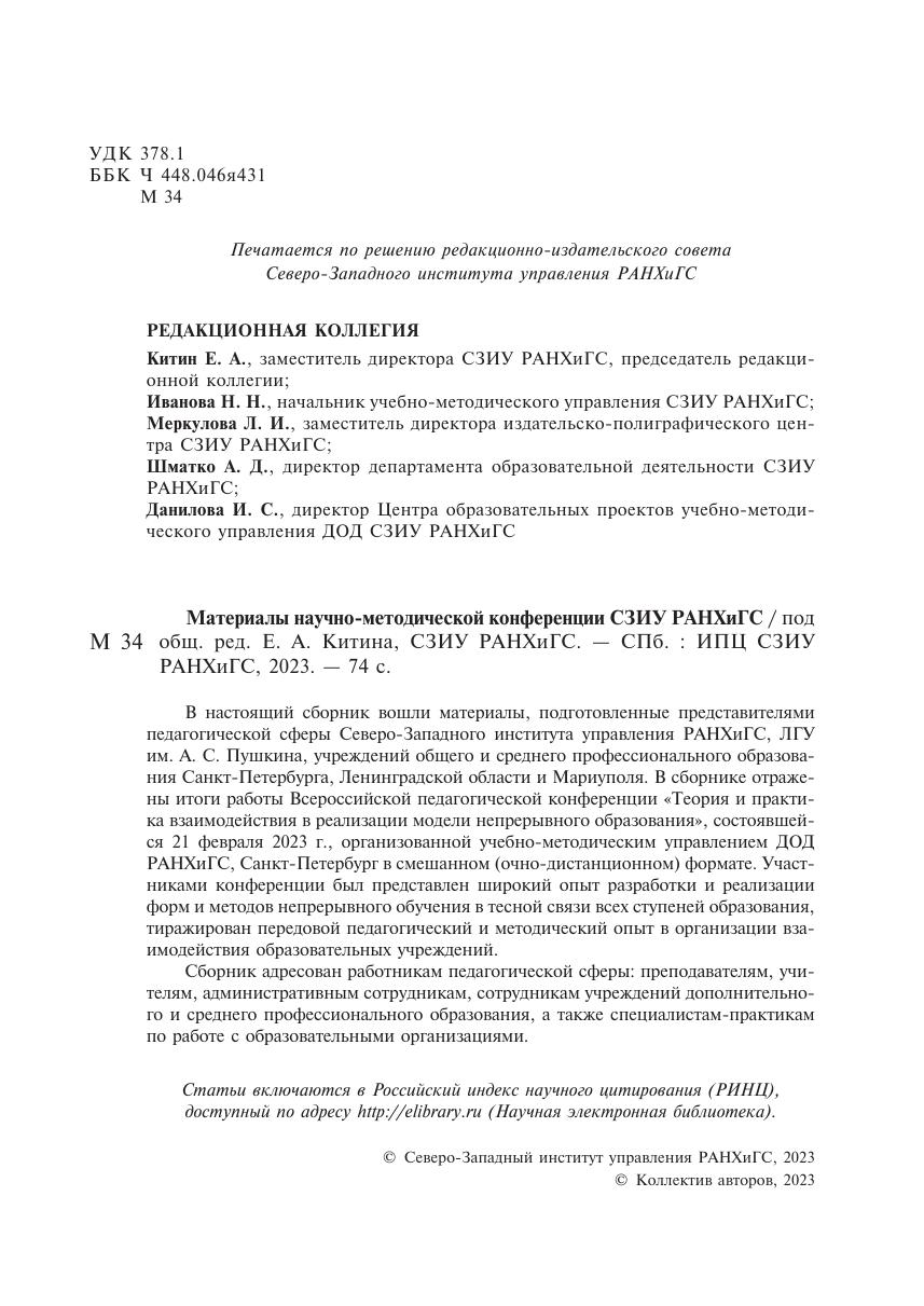 В настоящий сборник вошли материалы, подготовленные представителями педагогической сферы Северо-Западного института управления РАНХиГС, ЛГУ им. А. С. Пушкина, учреждений общего и среднего профессионального образования Санкт-Петербурга, Ленинградской области и Мариуполя. В сборнике отражены итоги работы Всероссийской педагогической конференции «Теория и практика взаимодействия в реализации модели непрерывного образования», состоявшейся 21 февраля 2023 г., организованной учебно-методическим управлением ДОД РАНХиГС, Санкт-Петербург в смешанном (очно-дистанционном) формате. Участниками конференции был представлен широкий опыт разработки и реализации форм и методов непрерывного обучения в тесной связи всех ступеней образования, тиражирован передовой педагогический и методический опыт в организации взаимодействия образовательных учреждений. Сборник адресован работникам педагогической сферы: преподавателям, учителям, административным сотрудникам, сотрудникам учреждений дополнительного и среднего профессионального образования, а также специалистам-практикам по работе с образовательными организациями.