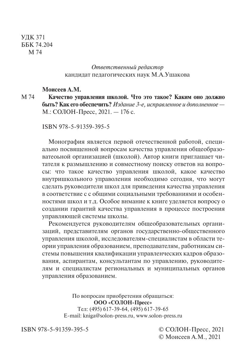 Монография является первой отечественной работой, специально посвященной вопросам качества управления общеобразоватеоьной организацией (школой). Автор книги приглашает читателя к размышлению и совместному поиску ответов на вопросы: что такое качество управления школой, какое качество внутришкольного управоления необходимо сегодня, что могут сделать руководители школ для приведения качества управления в соответствие с с общими социальными требованиями и особенностями школ и т.д. Особое внмание к книге уделяется вопросу о создании гарантий качества управления в процессе построения управляющей системы школы.