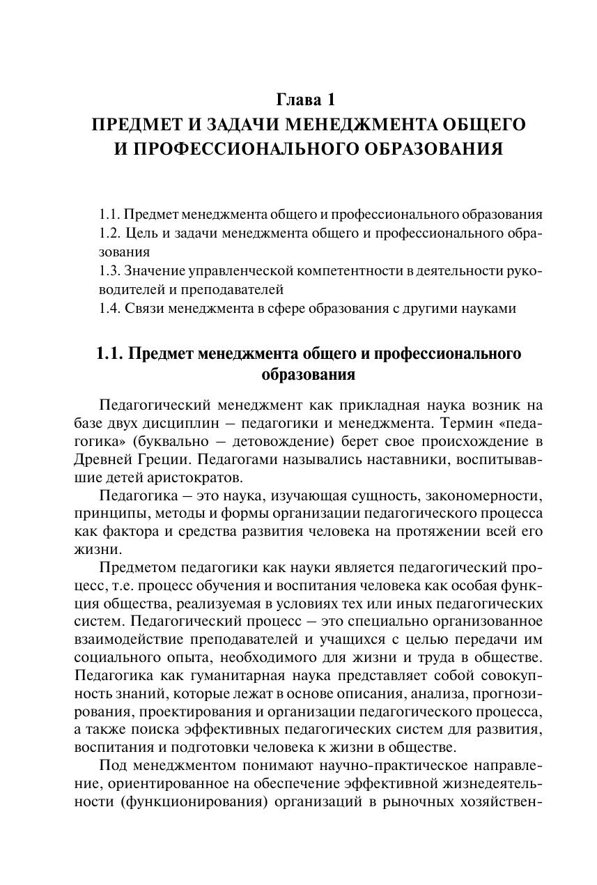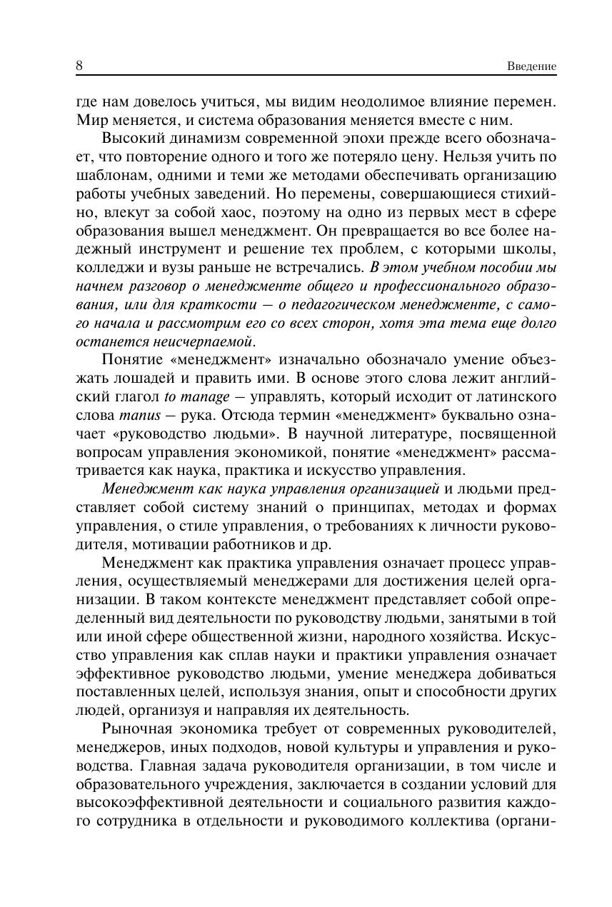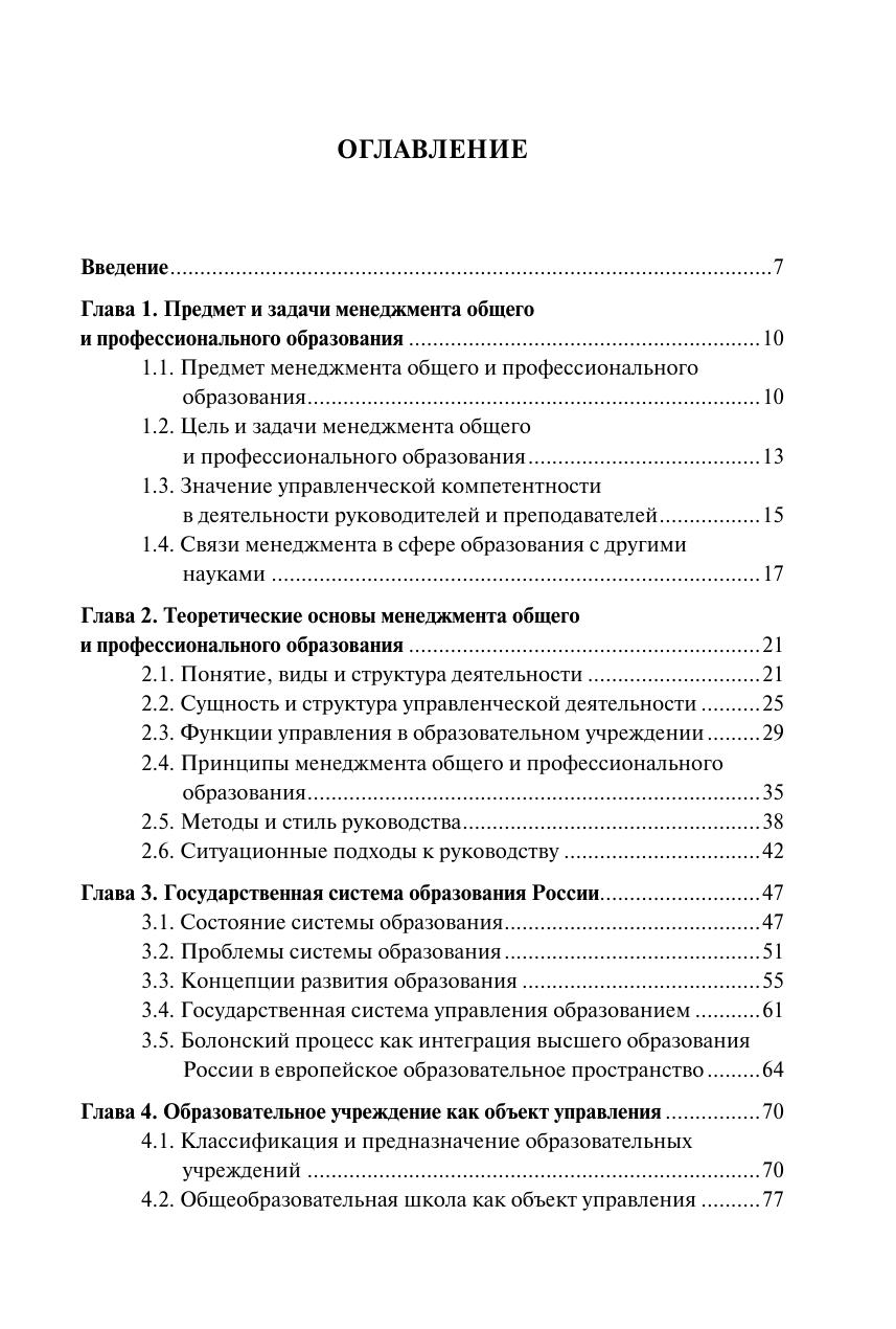 Изложен курс теории и практики управления системой образования на разных уровнях. Раскрыты предмет, задачи, функции и принципы менеджмента общего и профессионального образования, сущность и структура управленческой деятельности, методы и стиль руководства. Дан анализ государственной системы образования и образовательного учреждения как объектов управления. Рассмотрены основные функции мотивации педагогической деятельности, структура профессиональной компетентности преподавателя, социально-психологическая характеристика педагогического коллектива. Особое внимание уделено лидерству, учебно-педагогическому сотрудничеству и общению, разрешению конфликтов в коллективе. Освещены проблемы планирования и организации образовательного процесса, управления учебно-познавательной деятельностью учащихся, качеством образования и персоналом образовательного учреждения. Для студентов, обучающихся в высших учебных заведениях по направлению подготовки «Менеджмент». Может использоваться в учебном процессе по педагогическим направлениям и специальностям, а также при повышении квалификации и переподготовке педагогических кадров. Представляет интерес для исследователей проблем менеджмента в социальной сфере.