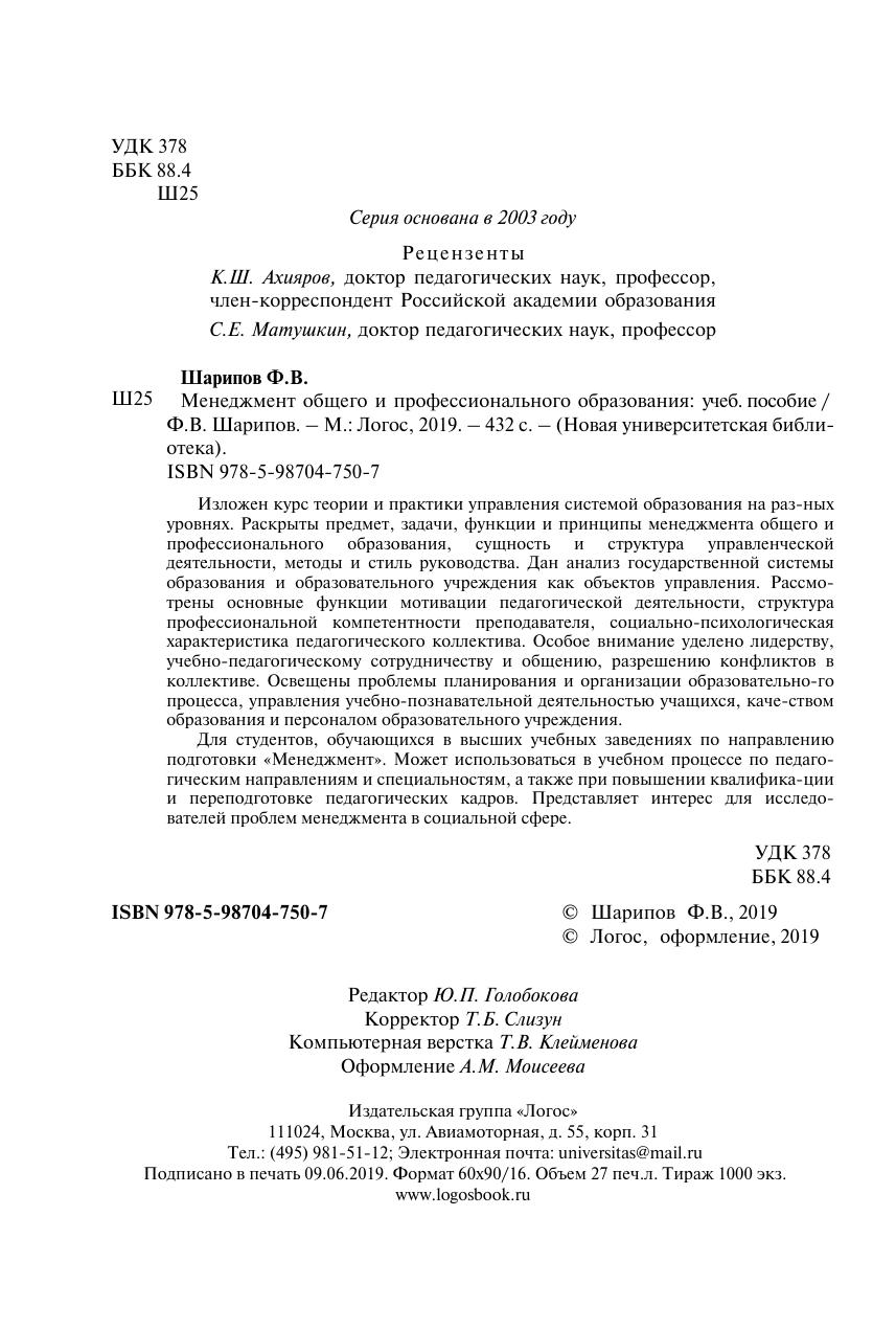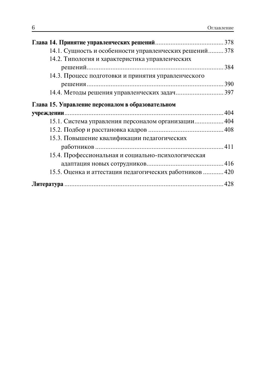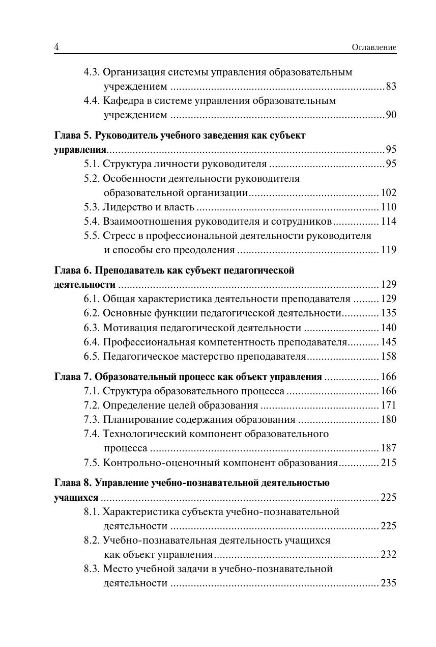 Изложен курс теории и практики управления системой образования на разных уровнях. Раскрыты предмет, задачи, функции и принципы менеджмента общего и профессионального образования, сущность и структура управленческой деятельности, методы и стиль руководства. Дан анализ государственной системы образования и образовательного учреждения как объектов управления. Рассмотрены основные функции мотивации педагогической деятельности, структура профессиональной компетентности преподавателя, социально-психологическая характеристика педагогического коллектива. Особое внимание уделено лидерству, учебно-педагогическому сотрудничеству и общению, разрешению конфликтов в коллективе. Освещены проблемы планирования и организации образовательного процесса, управления учебно-познавательной деятельностью учащихся, качеством образования и персоналом образовательного учреждения. Для студентов, обучающихся в высших учебных заведениях по направлению подготовки «Менеджмент». Может использоваться в учебном процессе по педагогическим направлениям и специальностям, а также при повышении квалификации и переподготовке педагогических кадров. Представляет интерес для исследователей проблем менеджмента в социальной сфере.