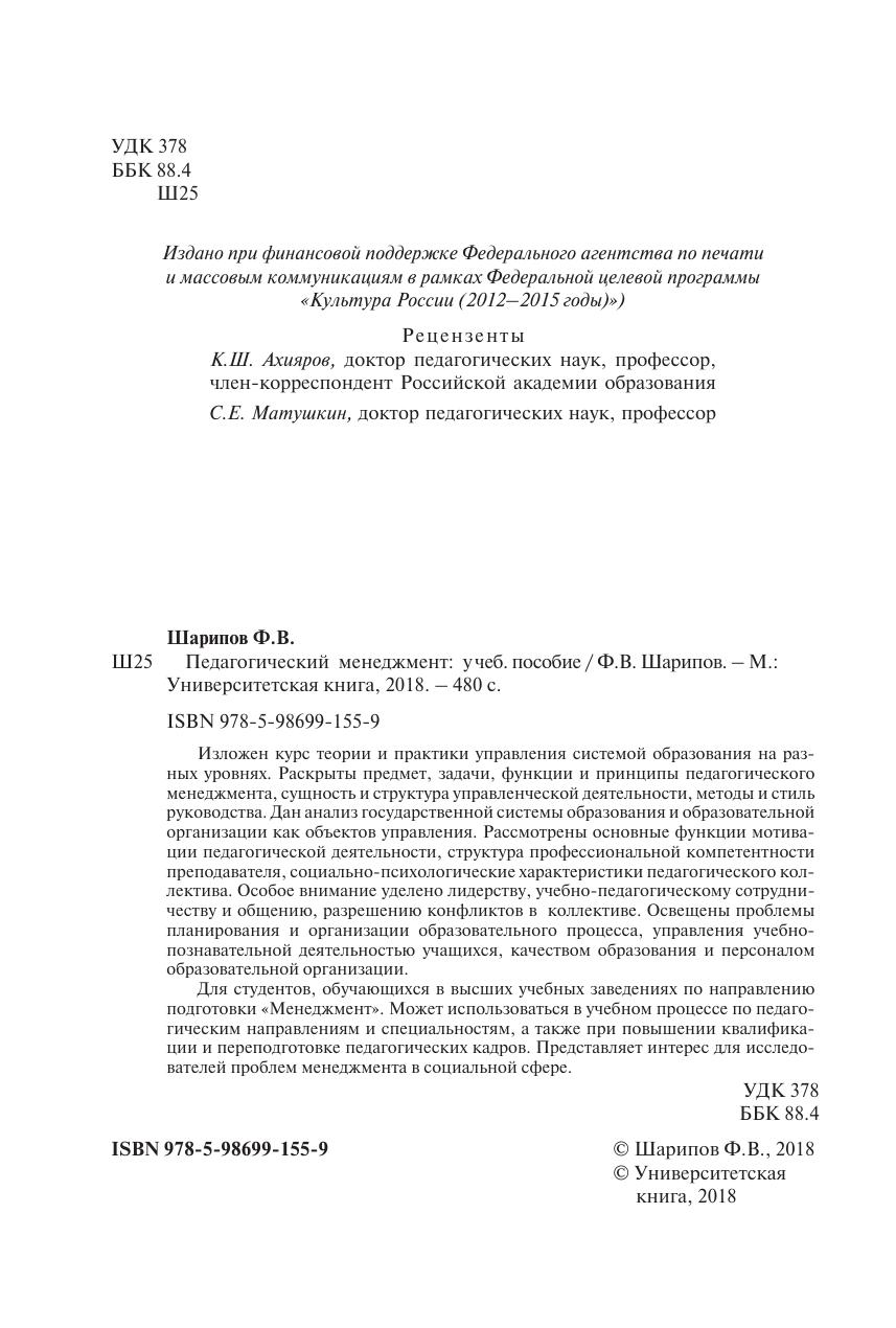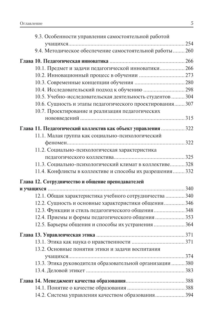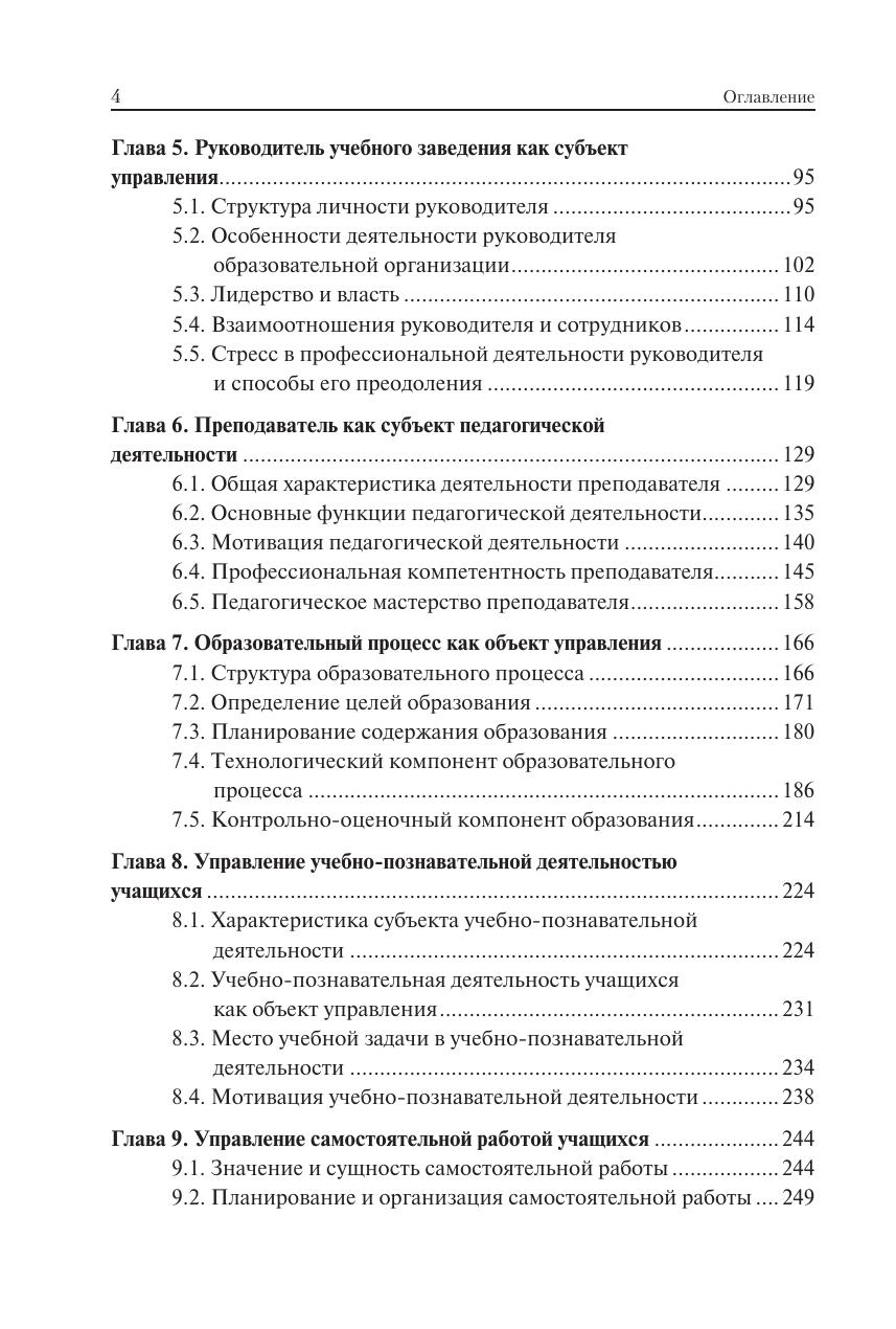 Изложен курс теории и практики управления системой образования на разных уровнях. Раскрыты предмет, задачи, функции и принципы педагогического менеджмента, сущность и структура управленческой деятельности, методы и стиль руководства. Дан анализ государственной системы образования и образовательной организации как объектов управления. Рассмотрены основные функции мотивации педагогической деятельности, структура профессиональной компетентности преподавателя, социально-психологические характеристики педагогического коллектива. Особое внимание уделено лидерству, учебно-педагогическому сотрудничеству и общению, разрешению конфликтов в коллективе. Освещены проблемы планирования и организации образовательного процесса, управления учебно-познавательной деятельностью учащихся, качеством образования и персоналом образовательной организации. Для студентов, обучающихся в высших учебных заведениях по направлению подготовки «Менеджмент». Может использоваться в учебном процессе по педагогическим направлениям и специальностям, а также при повышении квалификации и переподготовке педагогических кадров. Представляет интерес для исследователей проблем менеджмента в социальной сфере.