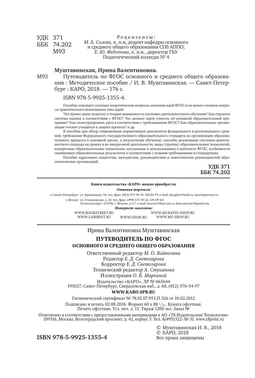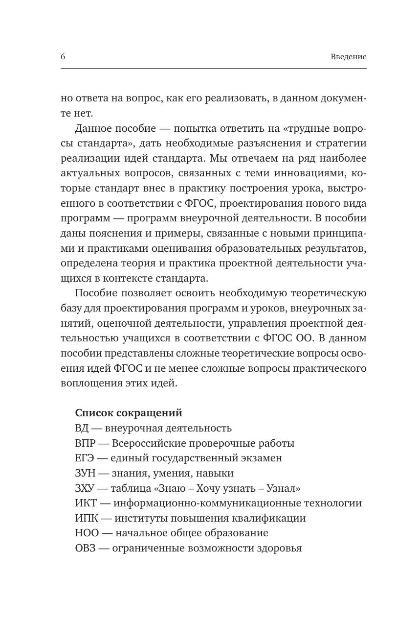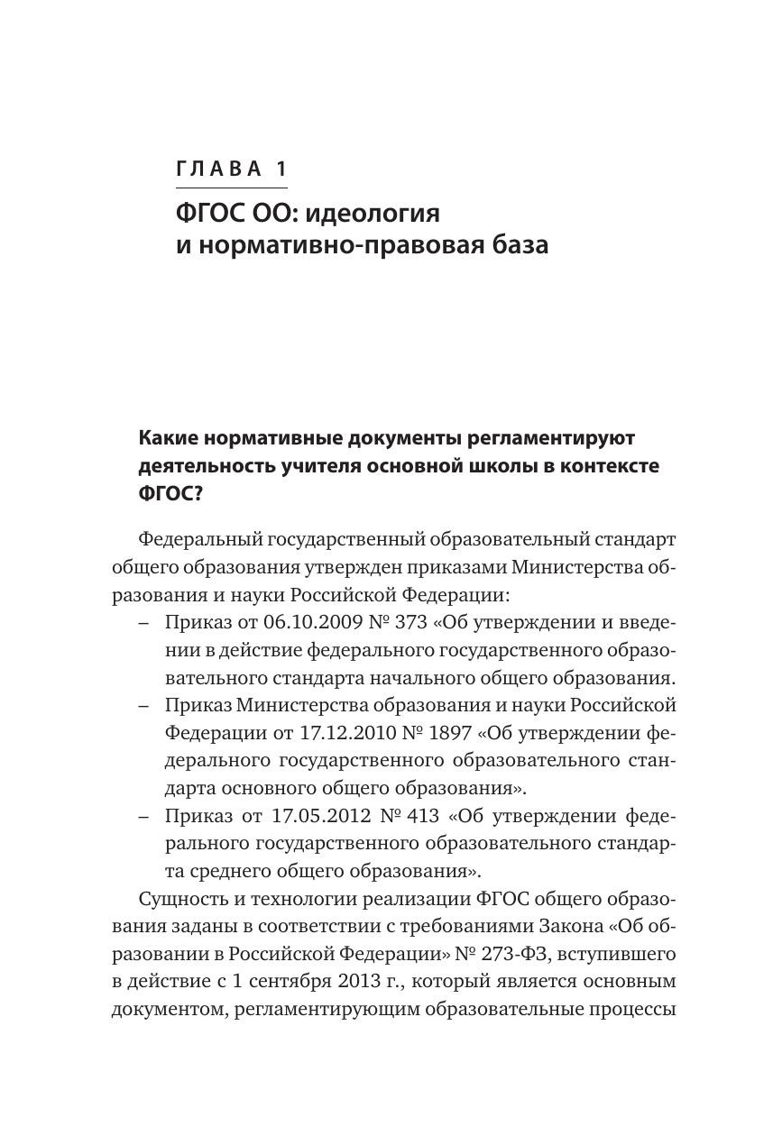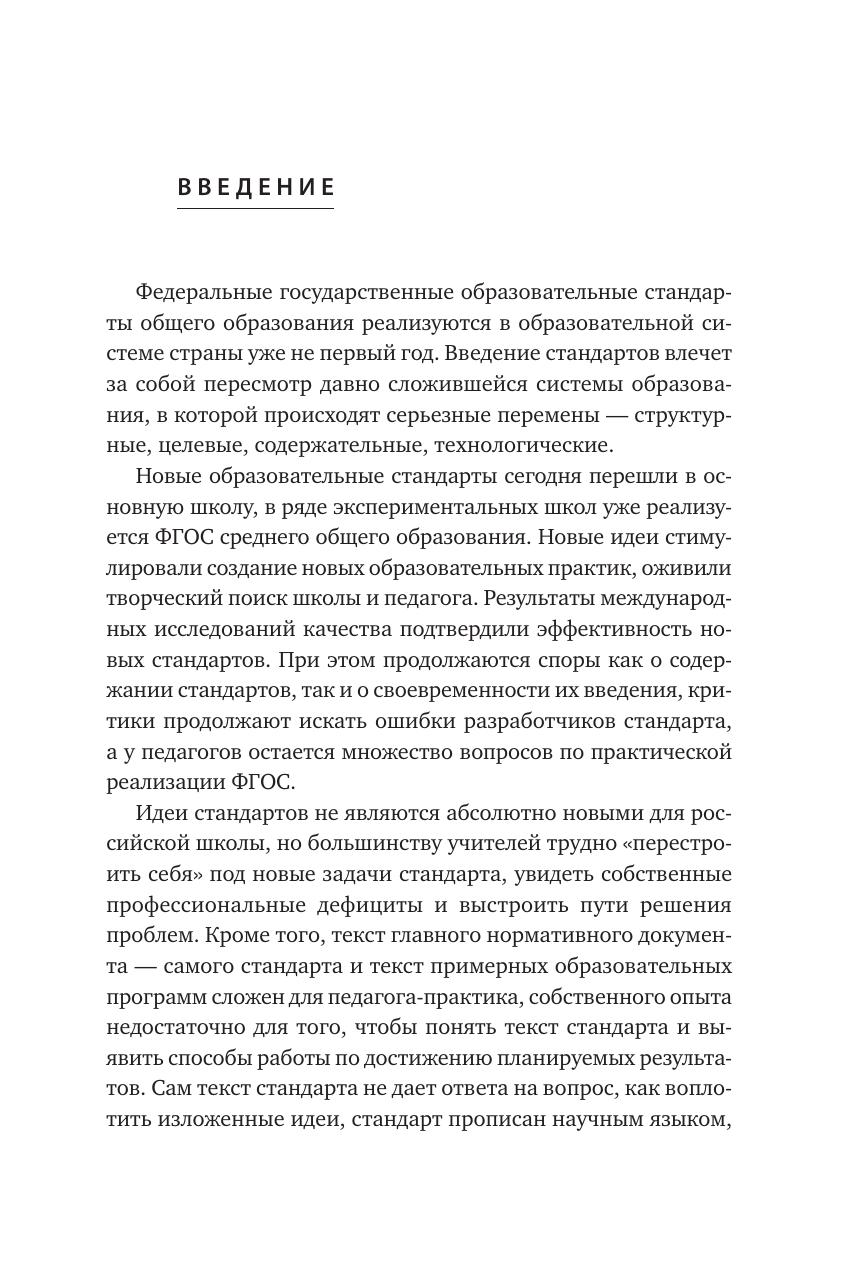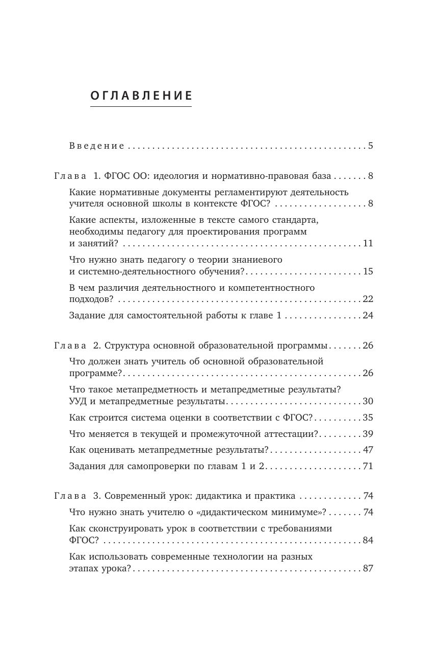 Пособие освещает сложные теоретические вопросы освоения идей ФГОС и не менее сложные вопросы практического воплощения этих идей: Что нужно знать педагогу о теории знаниевого и системно-деятельностного обучения? Как строится система оценки в соответствии с ФГОС? Что должен знать учитель об основной образовательной программе? Как сконструировать урок в соответствии с требованиями ФГОС? Как образовательные организации готовят учащихся к защите проекта? и др.В пособии дан обзор современных нормативных документов федерального и регионального уровней, требования Федерального государственного образовательного стандарта по организации образовательного процесса в основной школе, к результатам обучения; способы реализации системно-деятельностного подхода на уроках и во внеурочной деятельности, виды (группы) образовательных технологий, конкретные образовательные технологии, актуальные к использованию в контексте ФГОС, особенности оценивания образовательных результатов в соответствии с новыми требованиями и стандартами. Пособие адресовано педагогам, методистам, руководителям и заместителям руководителей образовательных организаций.