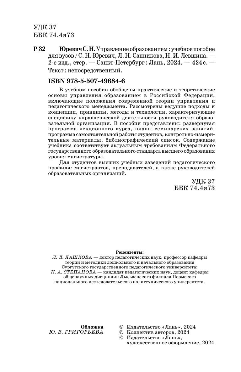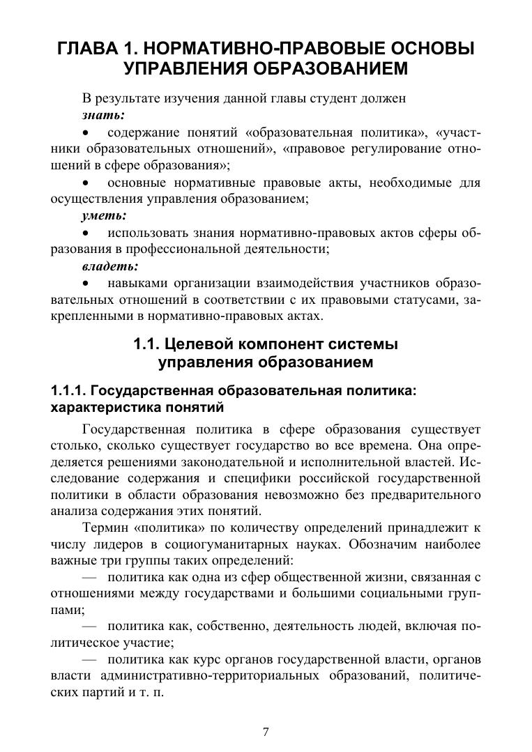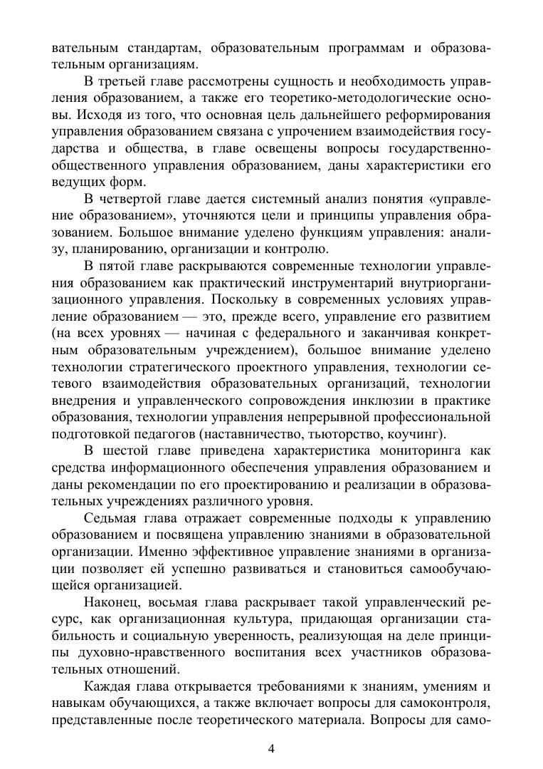 В учебном пособии обобщены практические и теоретические основы управления образованием в Российской Федерации, включающие положения современной теории управления и педагогического менеджмента. Рассмотрены ведущие подходы и концепции, принципы, методы и технологии, характеризующие специфику управленческой деятельности руководителя образовательной организации. В пособии представлены: развернутая программа лекционного курса, планы семинарских занятий, программа самостоятельной работы студентов, контрольно-измерительные материалы, библиографический список. Содержание учебника соответствует актуальным требованиям Федерального государственного образовательного стандарта высшего образования уровня магистратуры. Для студентов высших учебных заведений педагогического профиля: магистрантов, преподавателей, а также руководителей образовательных организаций.