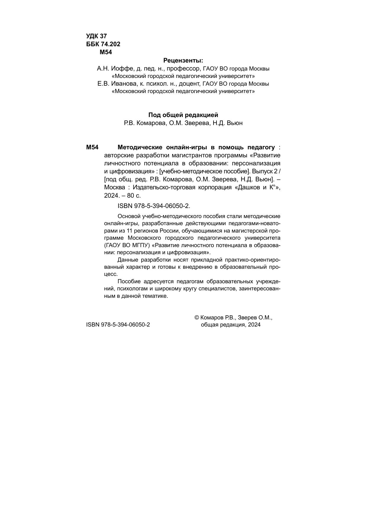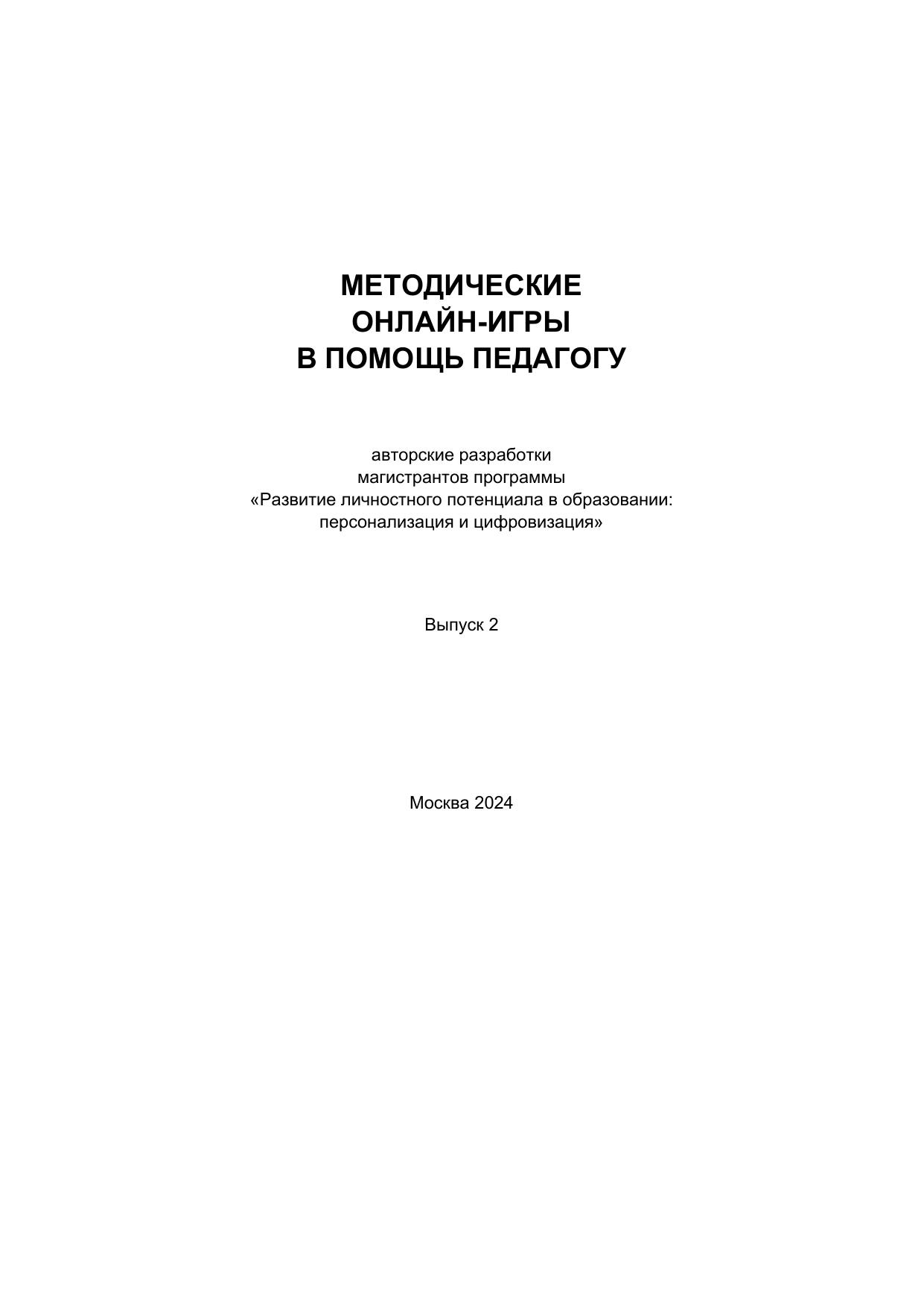Основой учебно-методического пособия стали методические онлайн-игры, разработанные действующими педагогами-новаторами из 11 регионов России, обучающимися на магистерской программе Московского городского педагогического университета (ГАОУ ВО МГПУ) «Развитие личностного потенциала в образовании: персонализация и цифровизация». Данные разработки носят прикладной практико-ориентированный характер и готовы к внедрению в образовательный процесс.