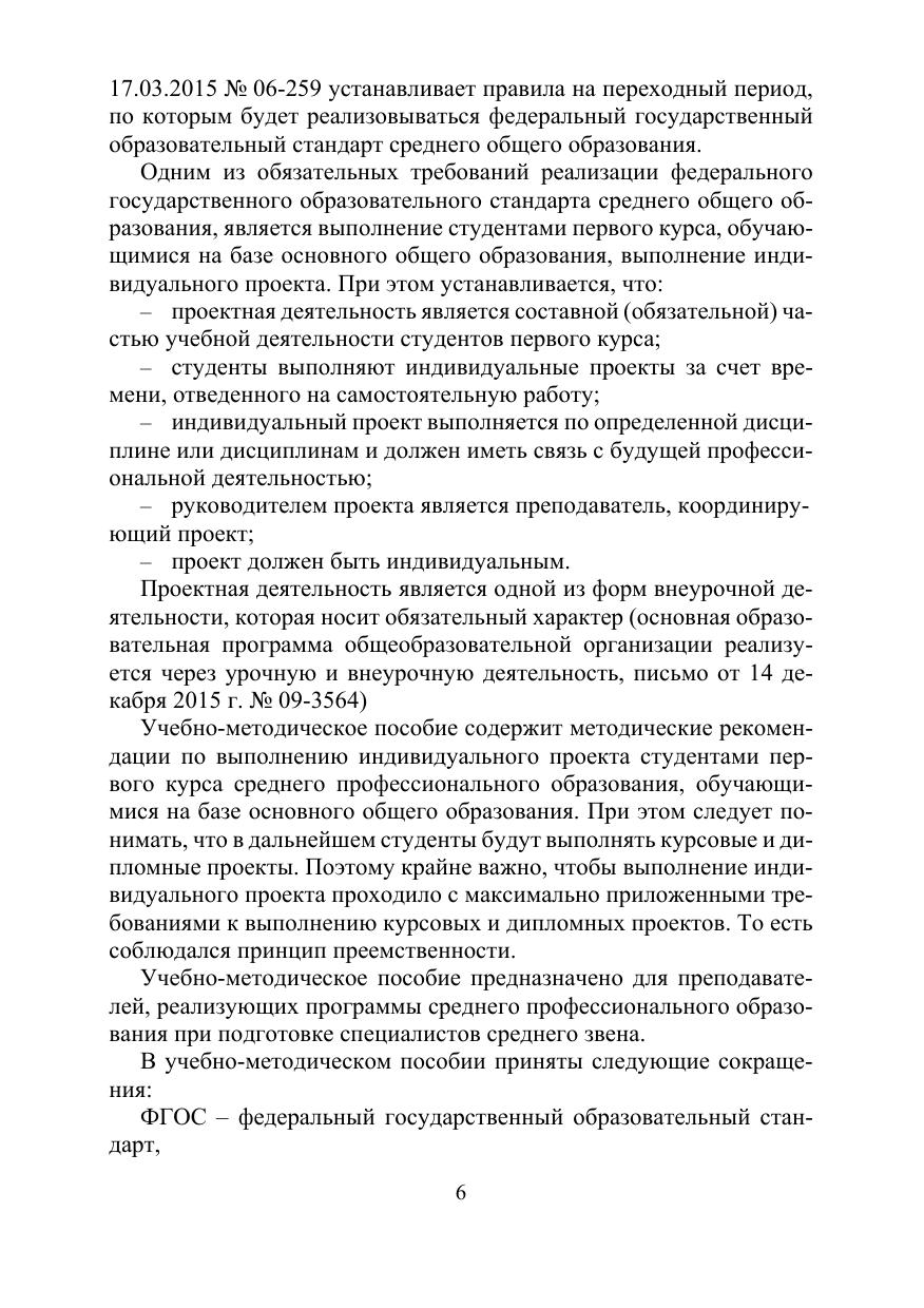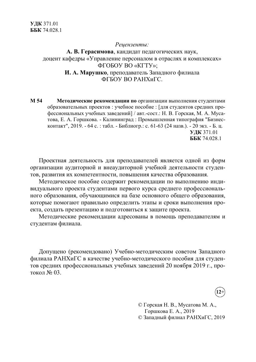 Проектная деятельность для преподавателей является одной из форм организации аудиторной и внеаудиторной учебной деятельности студентов, развития их компетентности, повышения качества образования. Методическое пособие содержит рекомендации по выполнению индивидуального проекта студентами первого курса среднего профессионального образования, обучающимися на базе основного общего образования, которые помогают правильно определить этапы и сроки выполнения проекта, создать презентацию и подготовиться к защите проекта. Методические рекомендации адресованы в помощь преподавателям и студентам филиала.
