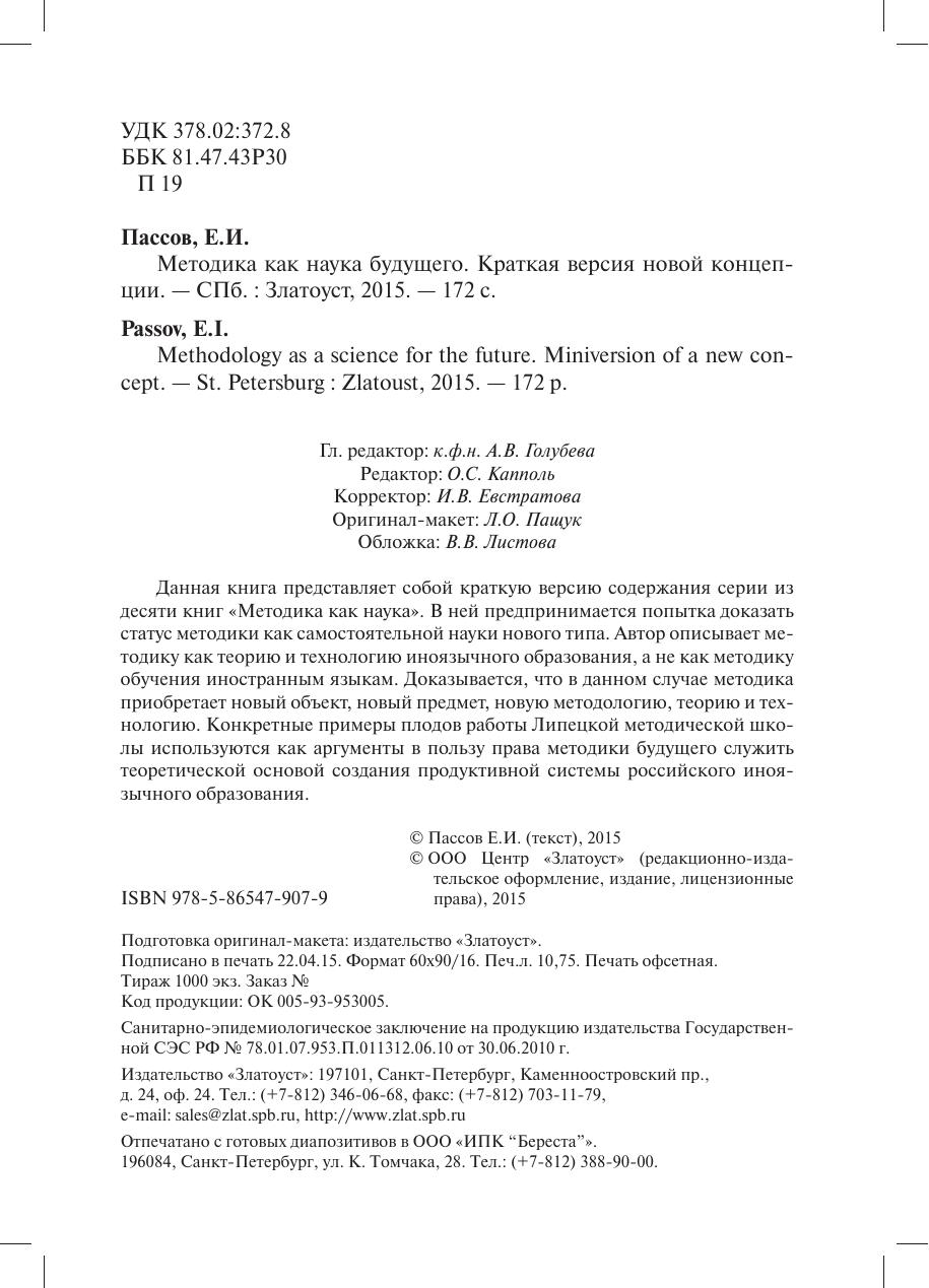 Данная книга представляет собой краткую версию содержания серии из десяти книг «Методика как наука». В ней предпринимается попытка доказать статус методики как самостоятельной науки нового типа. Автор описывает методику как теорию и технологию иноязычного образования, а не как методику обучения иностранным языкам. Доказывается, что в данном случае методика приобретает новый объект, новый предмет, новую методологию, теорию и технологию. Конкретные примеры плодов работы Липецкой методической школы используются как аргументы в пользу права методики будущего служить теоретической основой создания продуктивной системы российского иноязычного образования.