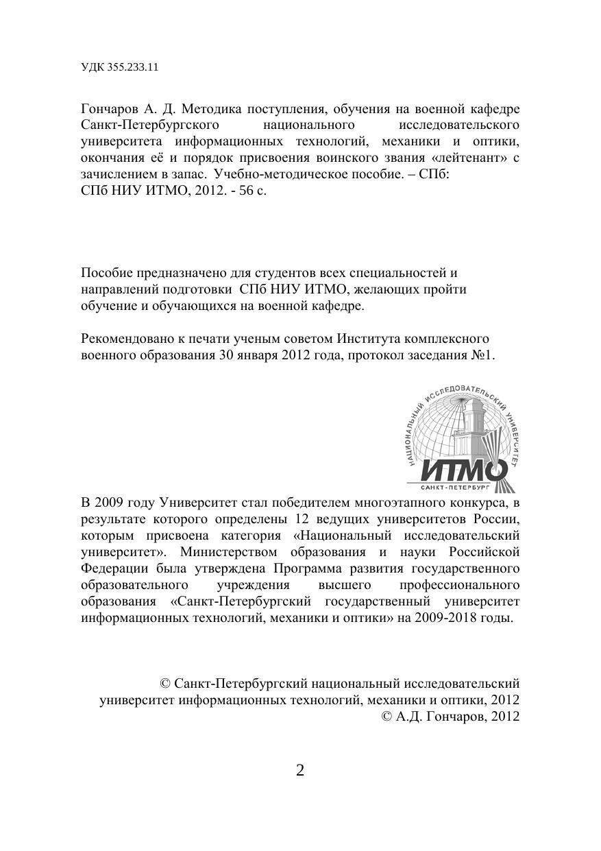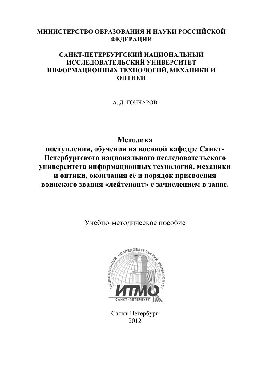 Методика поступления, обучения на военной кафедре Санкт-Петербургского национального исследовательского университета информационных технологий, механики и оптики, окончания её и порядок присвоения воинского звания «лейтенант» с зачислением в запас