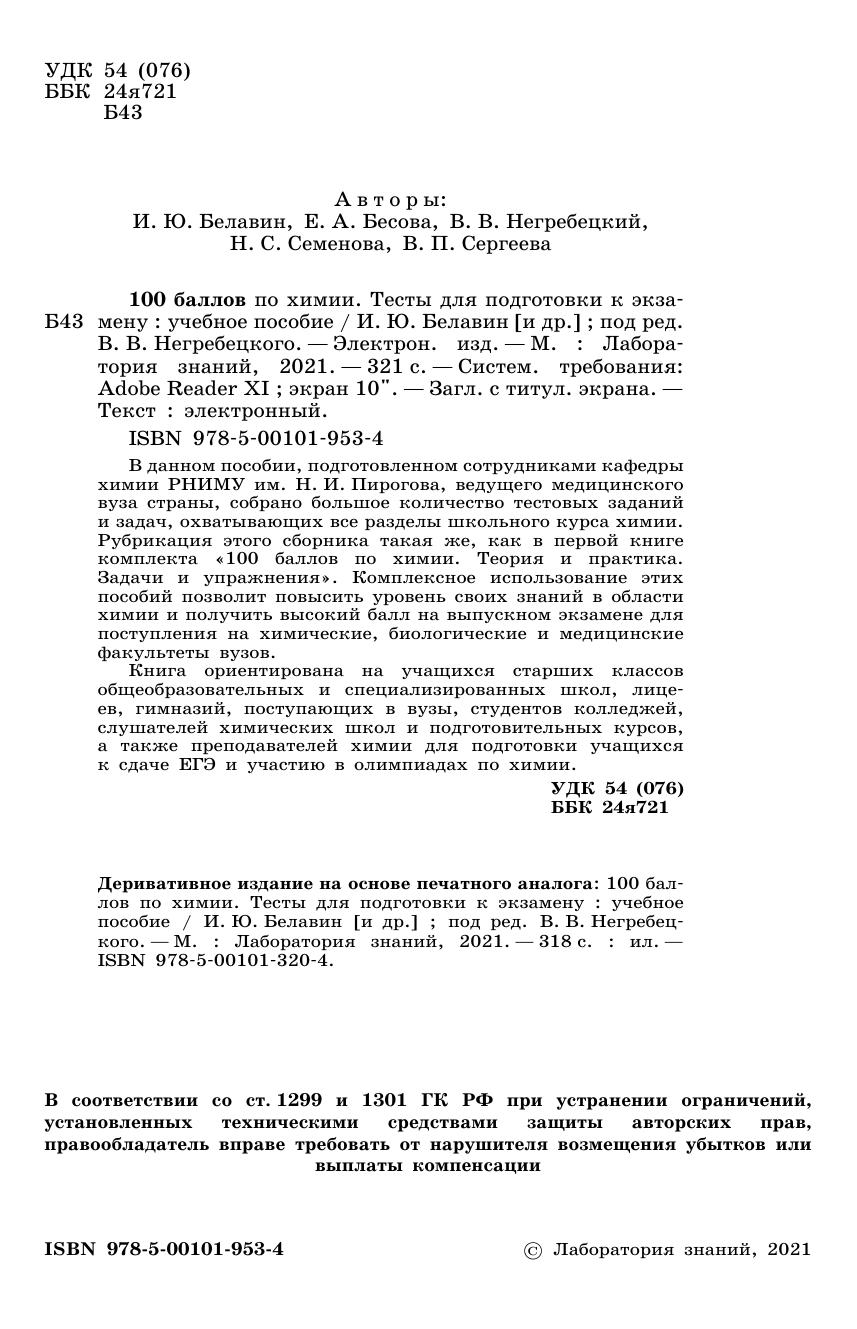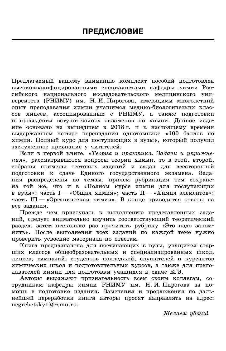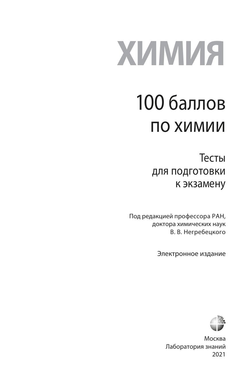 В данном пособии, подготовленном сотрудниками кафедры химии РНИМУ им. Н. И. Пирогова, ведущего медицинского вуза страны, собрано большое количество тестовых заданий и задач, охватывающих все разделы школьного курса химии. Рубрикация этого сборника такая же, как в первой книге комплекта «100 баллов по химии. Теория и практика. Задачи и упражнения». Комплексное использование этих пособий позволит повысить уровень своих знаний в области химии и получить высокий балл на выпускном экзамене для поступления на химические, биологические и медицинские факультеты вузов. Книга ориентирована на учащихся старших классов общеобразовательных и специализированных школ, лице ев, гимназий, поступающих в вузы, студентов колледжей, слушателей химических школ и подготовительных курсов, а также преподавателей химии для подготовки учащихся к сдаче ЕГЭ и участию в олимпиадах по химии.