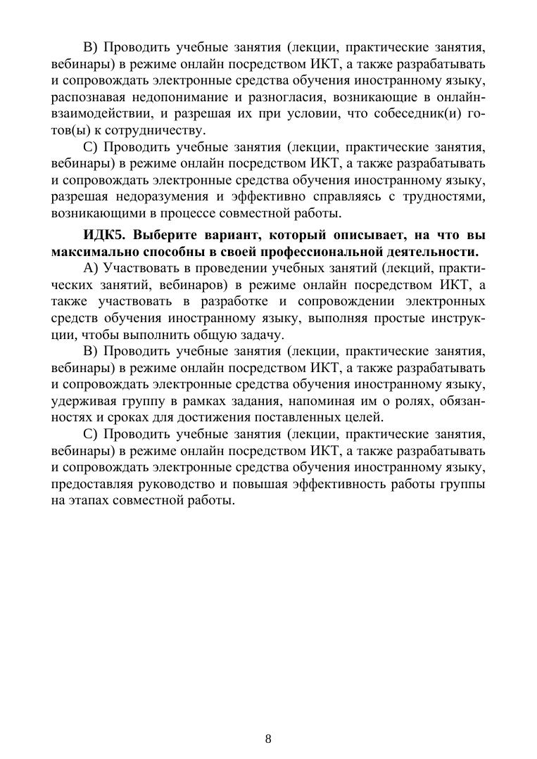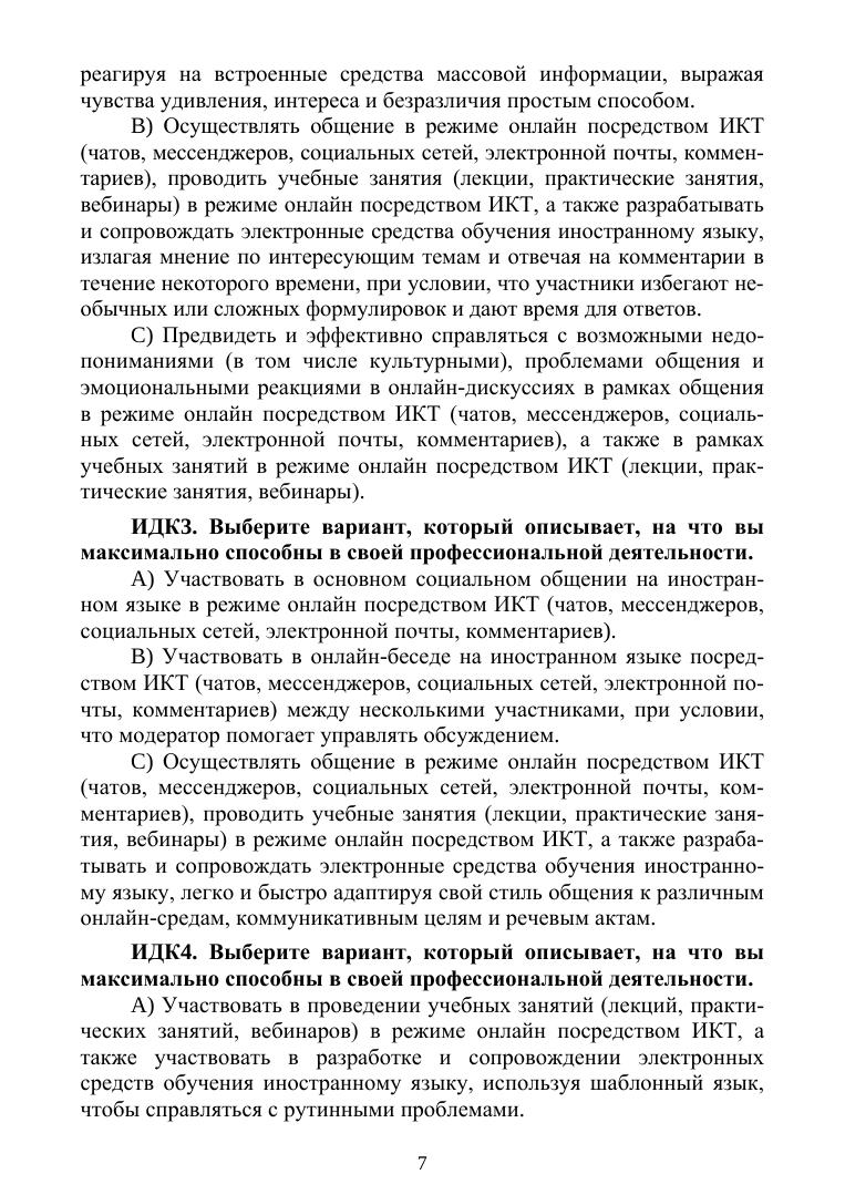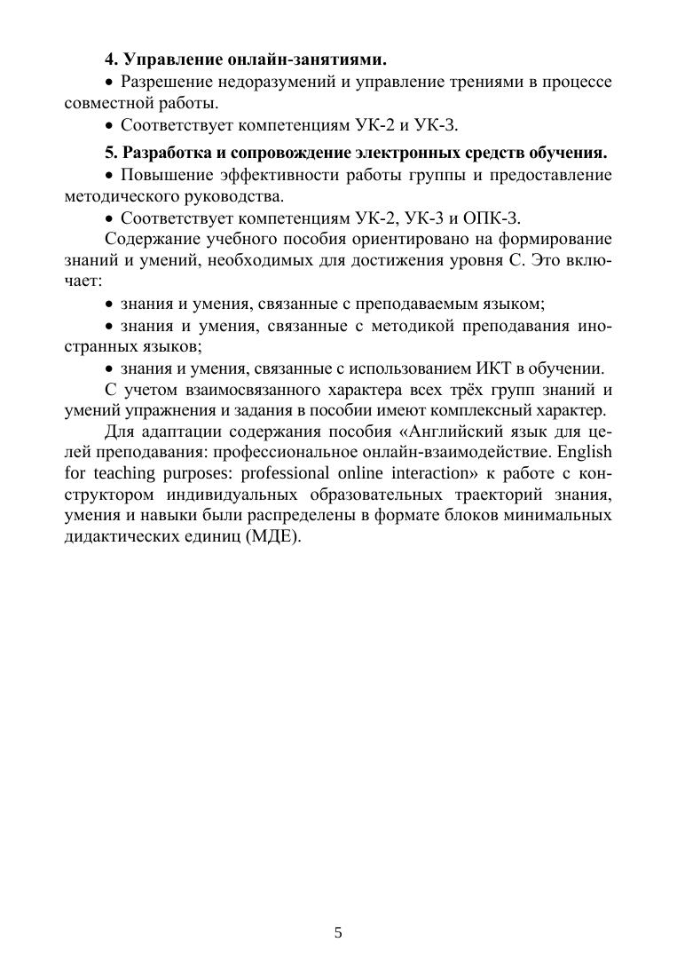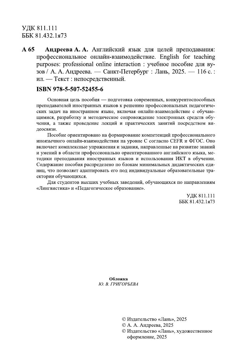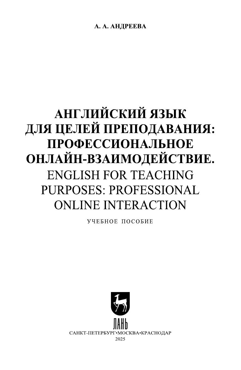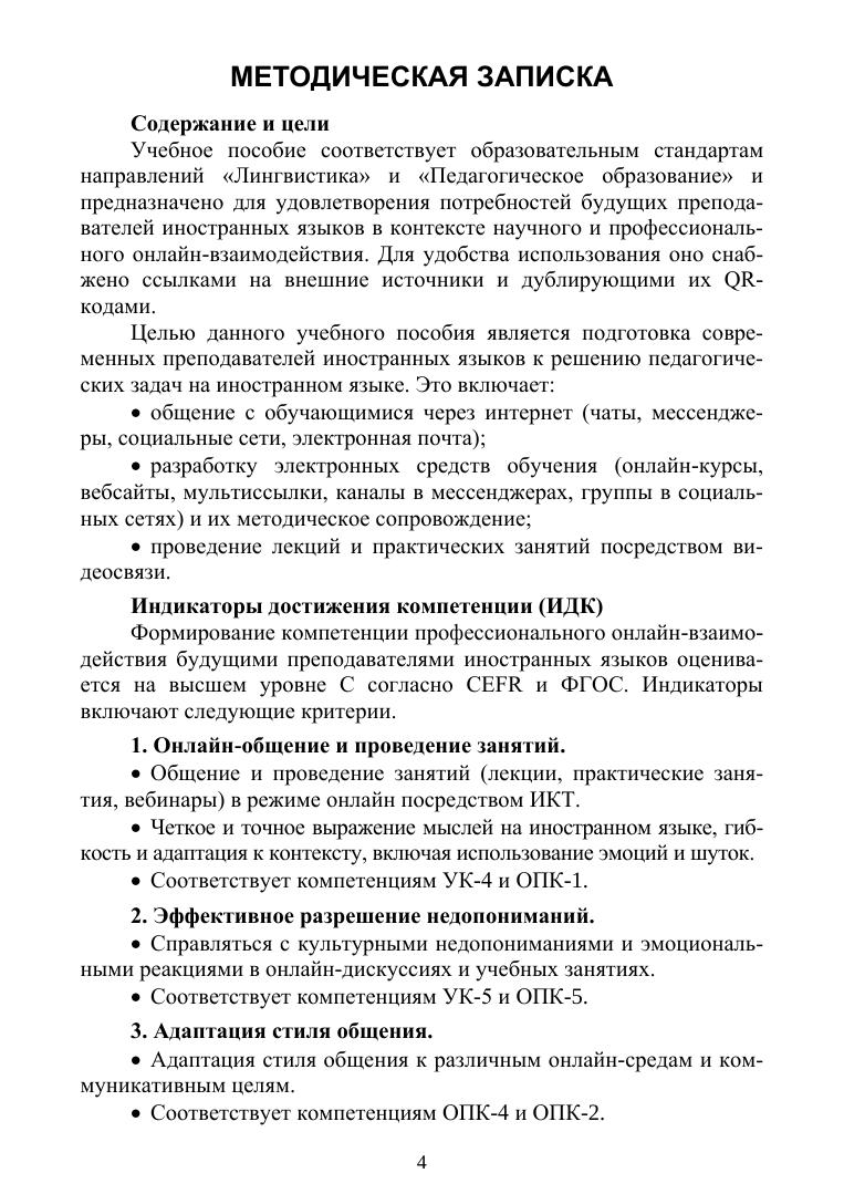 Основная цель пособия — подготовка современных, конкурентоспособных преподавателей иностранных языков к решению профессиональных педагогических задач на иностранном языке, включая онлайн-взаимодействие с обучающимися, разработку и методическое сопровождение электронных средств обучения, а также проведение лекций и практических занятий посредством видеосвязи. Пособие ориентировано на формирование компетенций профессионального иноязычного онлайн-взаимодействия на уровне С согласно CEFR и ФГОС. Оно включает комплексные упражнения и задания, направленные на развитие знаний и умений в области профессионально ориентированного английского языка, методики преподавания иностранных языков и использования ИКТ в обучении. Содержание пособия распределено по блокам минимальных дидактических единиц, что позволяет адаптировать его под индивидуальные образовательные траектории обучающихся. Для студентов высших учебных заведений, обучающихся по направлениям «Лингвистика» и «Педагогическое образование».