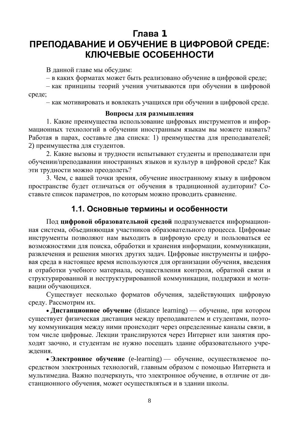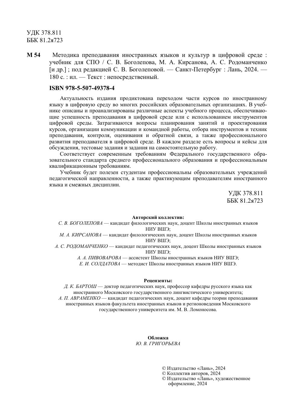 Актуальность издания продиктована переходом части курсов по иностранному языку в цифровую среду во многих российских образовательных организациях. В учебнике описаны и проанализированы различные аспекты учебного процесса, обеспечивающие успешность преподавания в цифровой среде или с использованием инструментов цифровой среды. Затрагиваются вопросы планирования занятий и проектирования курсов, организации коммуникации и командной работы, отбора инструментов и техник преподавания, контроля, оценивания и обратной связи, а также профессионального развития преподавателя в цифровой среде. В каждом разделе есть вопросы и кейсы для обсуждения, тестовые задания и задания на самостоятельную работу. Соответствует современным требованиям Федерального государственного образовательного стандарта среднего профессионального образования и профессиональным квалификационным требованиям. Учебник будет полезен студентам профессиональны образовательных учреждений педагогической направленности, а также практикующим преподавателям иностранного языка и смежных дисциплин.