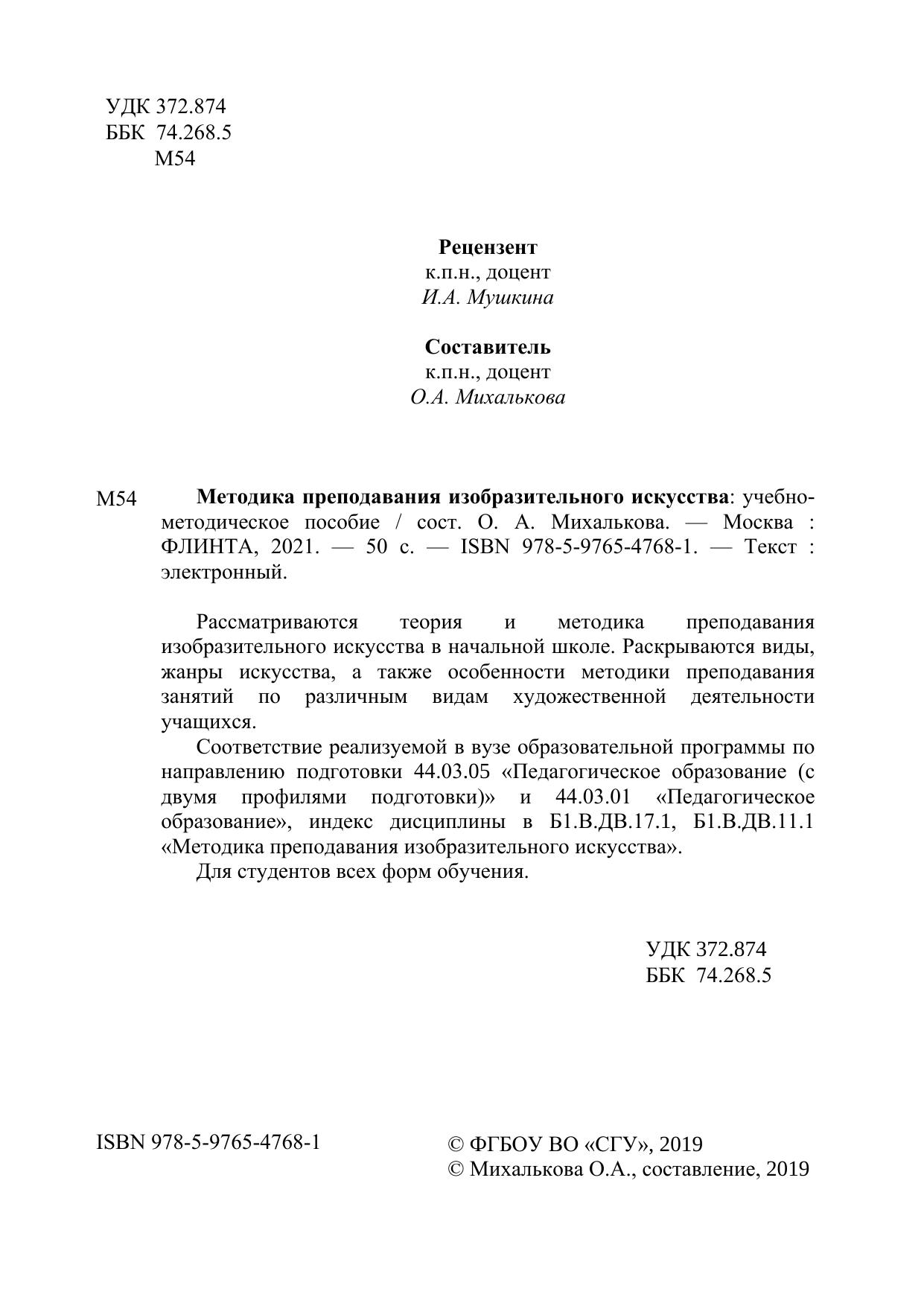 Соответствие реализуемой в вузе образовательной программы по направлению подготовки 44.03.05 «Педагогическое образование (с двумя профилями подготовки)» и 44.03.01 «Педагогическое образование», индекс дисциплины в Б1.В.ДВ.17.1, Б1.В.ДВ.11.1 «Методика преподавания изобразительного искусства». Для студентов всех форм обучения.