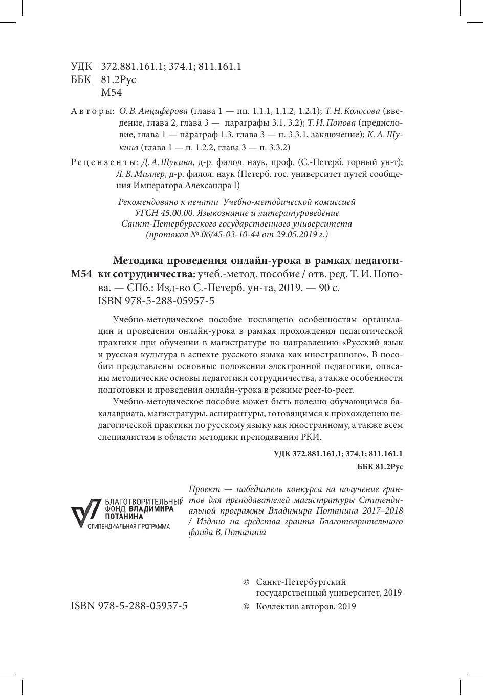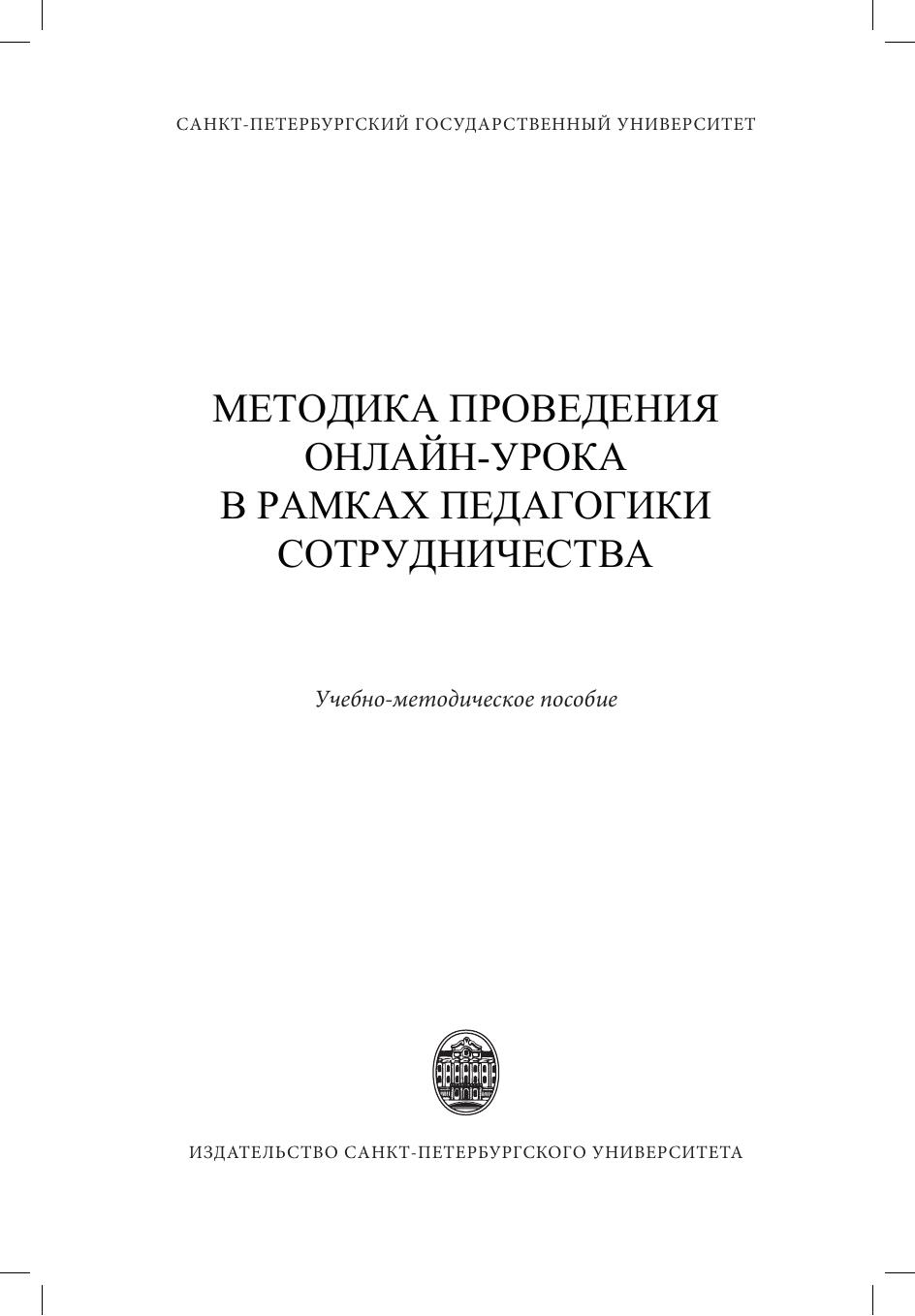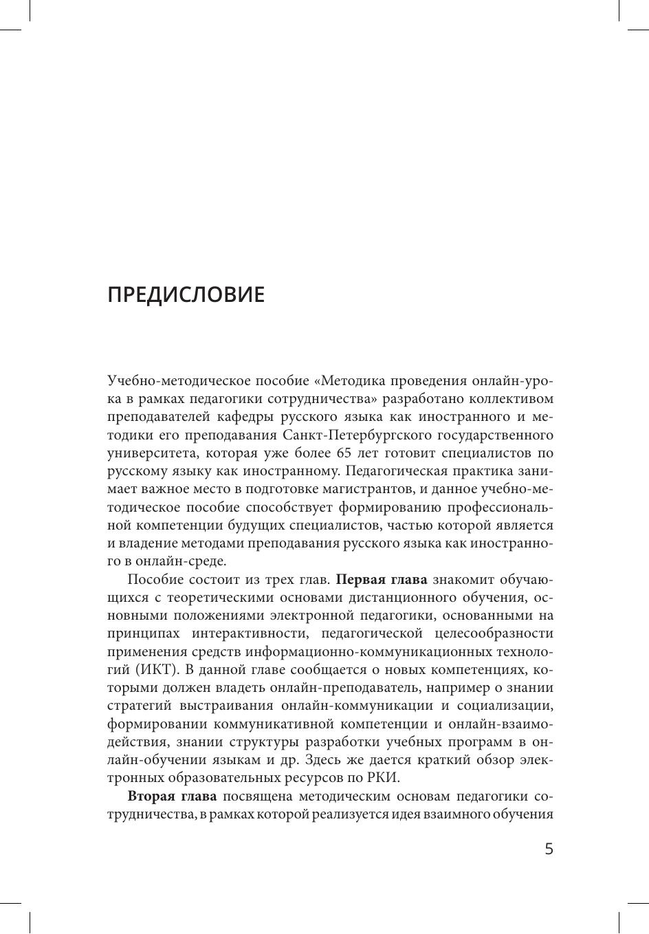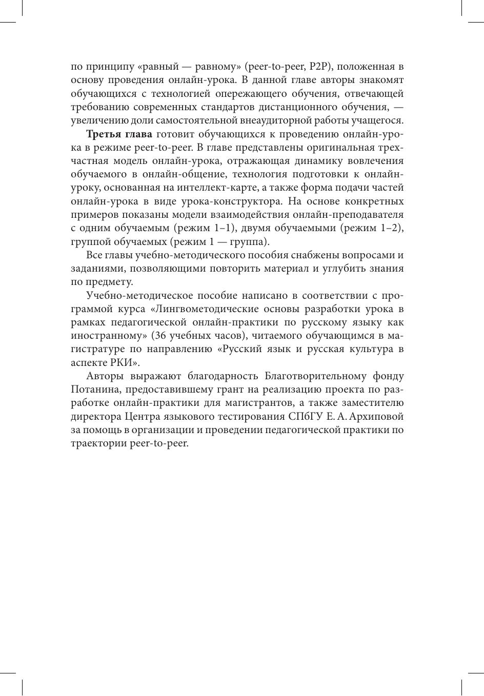 Учебно-методическое пособие посвящено особенностям организации и проведения онлайн-урока в рамках прохождения педагогической практики при обучении в магистратуре по направлению "Русский язык и русская культура в аспекте языка как иностранного". В пособии представлены основные положения электронной педагогики, описаны методические основы педагогики сотрудничества, а также особенности подготовки и проведения онлайн-урока в режиме peer-to-peer. Учебно-методическое пособие может быть полезно обучающимся бакалавриата, магистратуры, аспирантуры, готовящихся к прохождению педагогической практики по русскому языку как иностранному, а также всем специалистам в области преподавания РКИ.